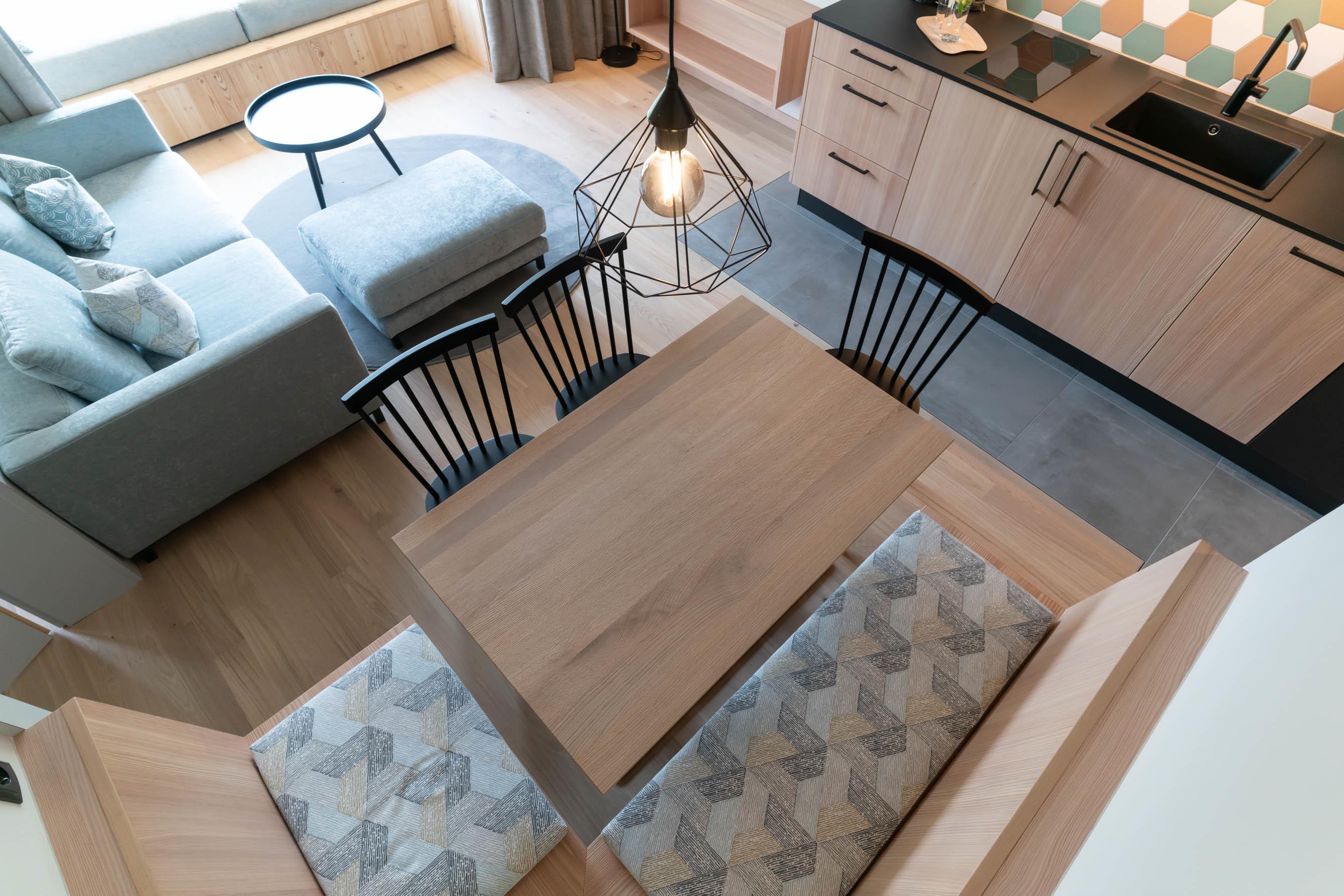 • Naturgeölter Eichenholzboden oder flauschiger Teppichboden, Möbel aus gebürstetem Lärchenholz