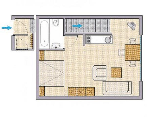 Appartement für 2–4 Personen (ca. 37 m²):Vorraum mit Garderobe, Wohnschlafzimmer mit Doppelbett und Doppelcouch, Telefon, Kabel-TV mit Radio, Safe, Küchenblock (2 Elektroplatten, Kühlschrank, Geschirrspüler, Mikrowelle, Wasserkocher, Kaffeemaschine uvm.). Badezimmer mit Wanne, WC und Fön.