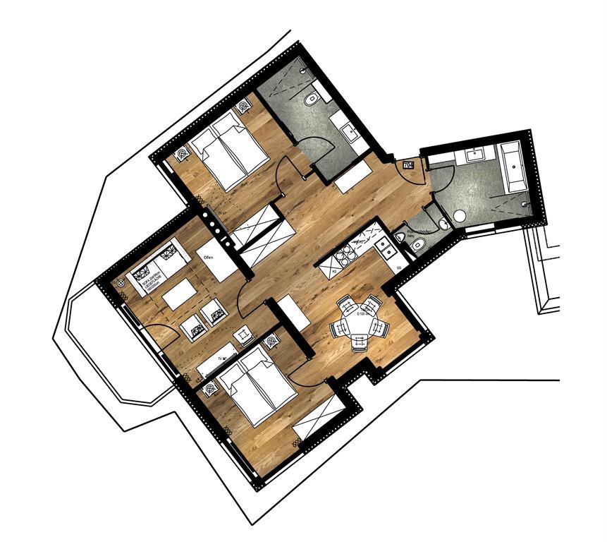 Unsere großzügiges Appartement (ca. 80 m²) verfügen über zwei Schlafzimmer mit jeweils einem eigenem Badezimmer und Toilette, einem Wohnschlafzimmer, voll ausgestattete Küche mit Essecke, sowie Balkon oder Terrasse.