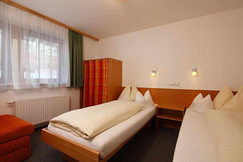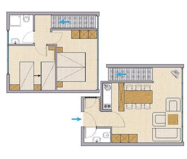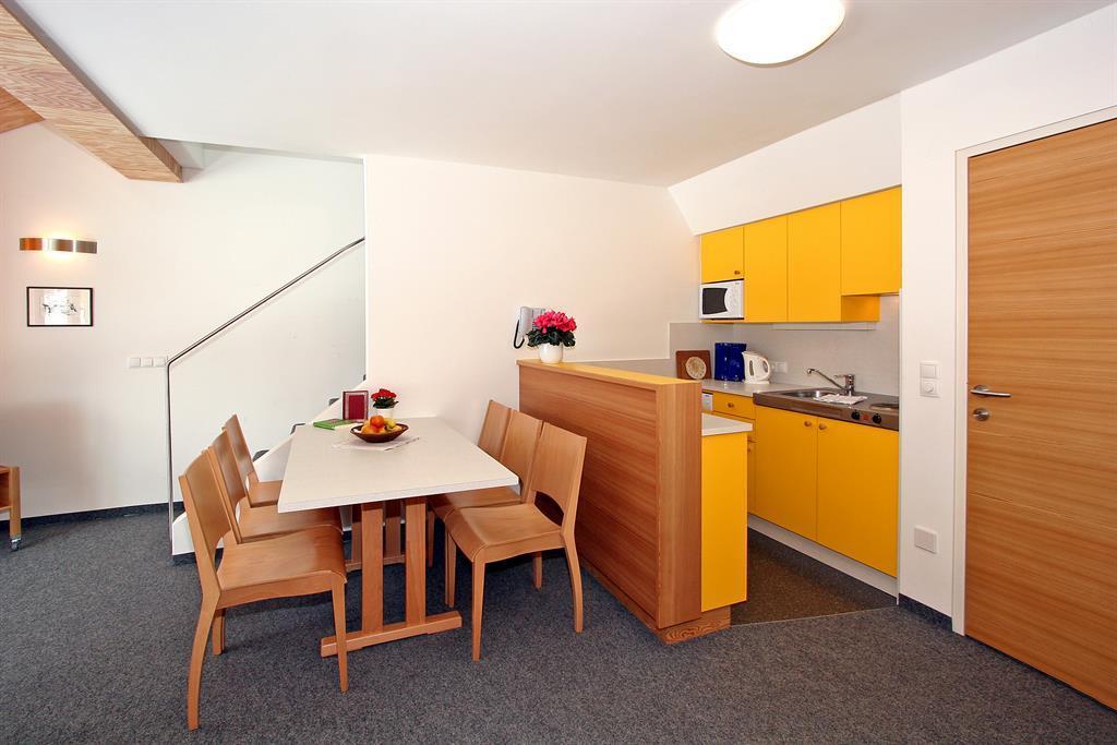 Appartement für 3-6 Personen (ca. 58 m²): Vorraum mit Garderobe, separates WC, Wohnzimmer mit Doppelcouch, Telefon, Kabel-TV mit Radio, Safe, Küchenblock (2 Elektroplatten, Kühlschrank, Geschirrspüler, Mikrowelle, Wasserkocher, Kaffeemaschine, uvm.), zwei Schlafzimmer, Badezimmer mit Dusche/WC, Fön.