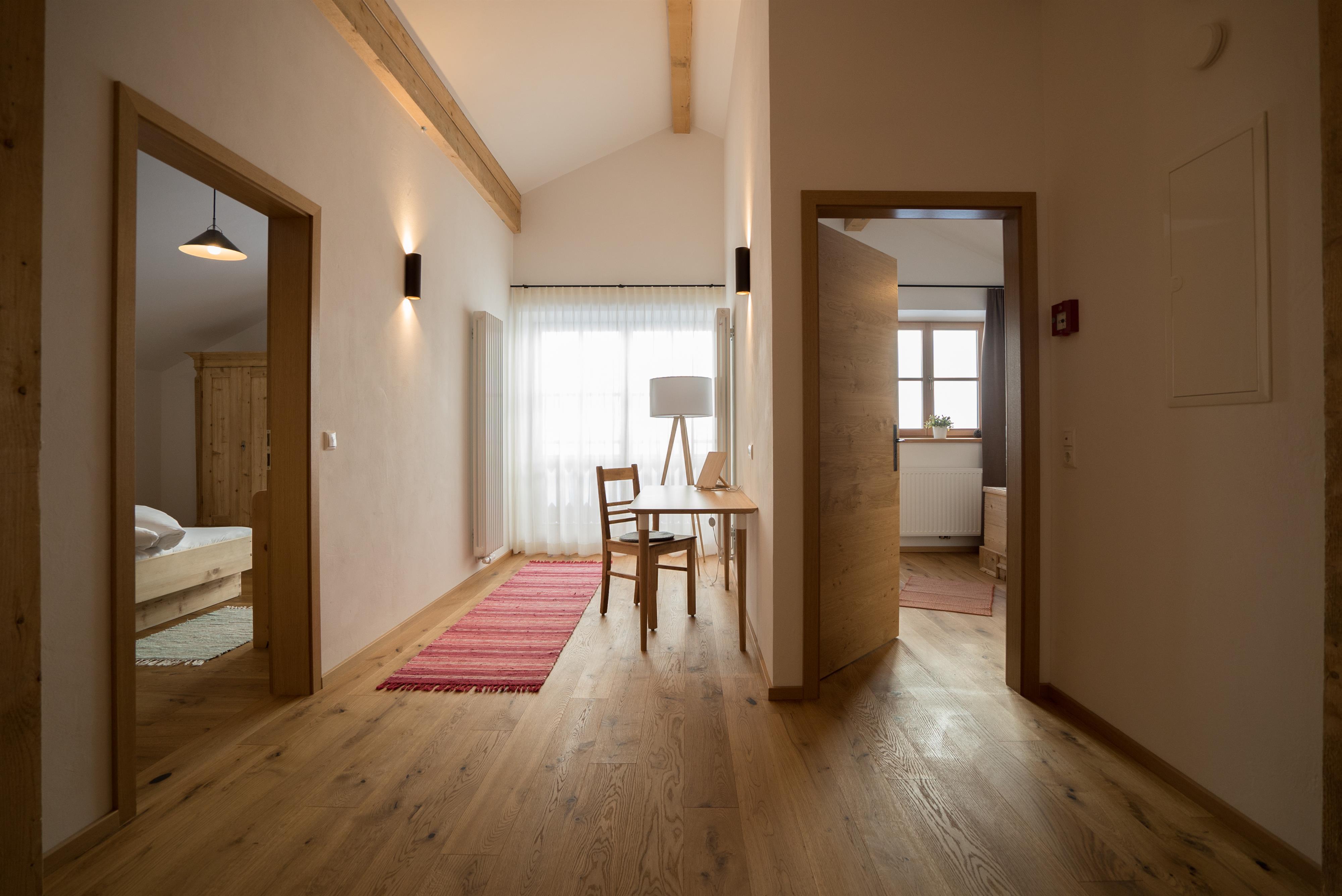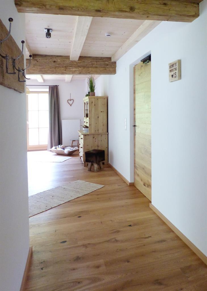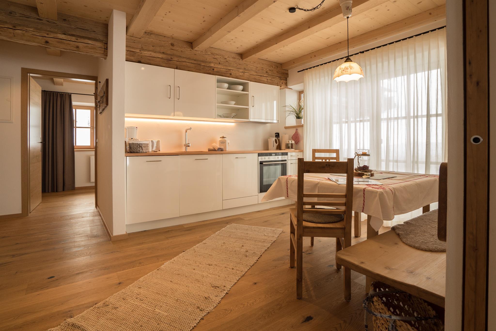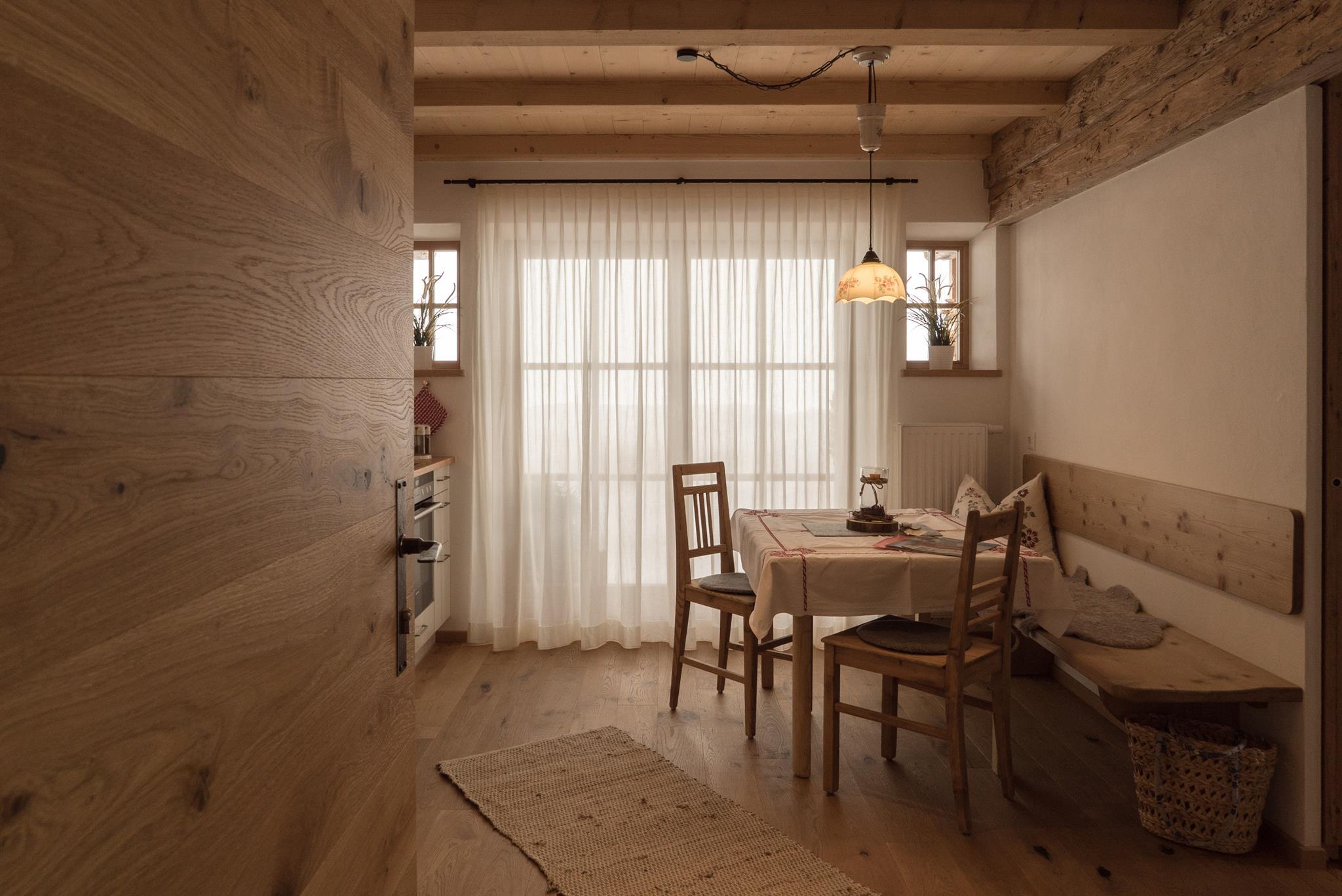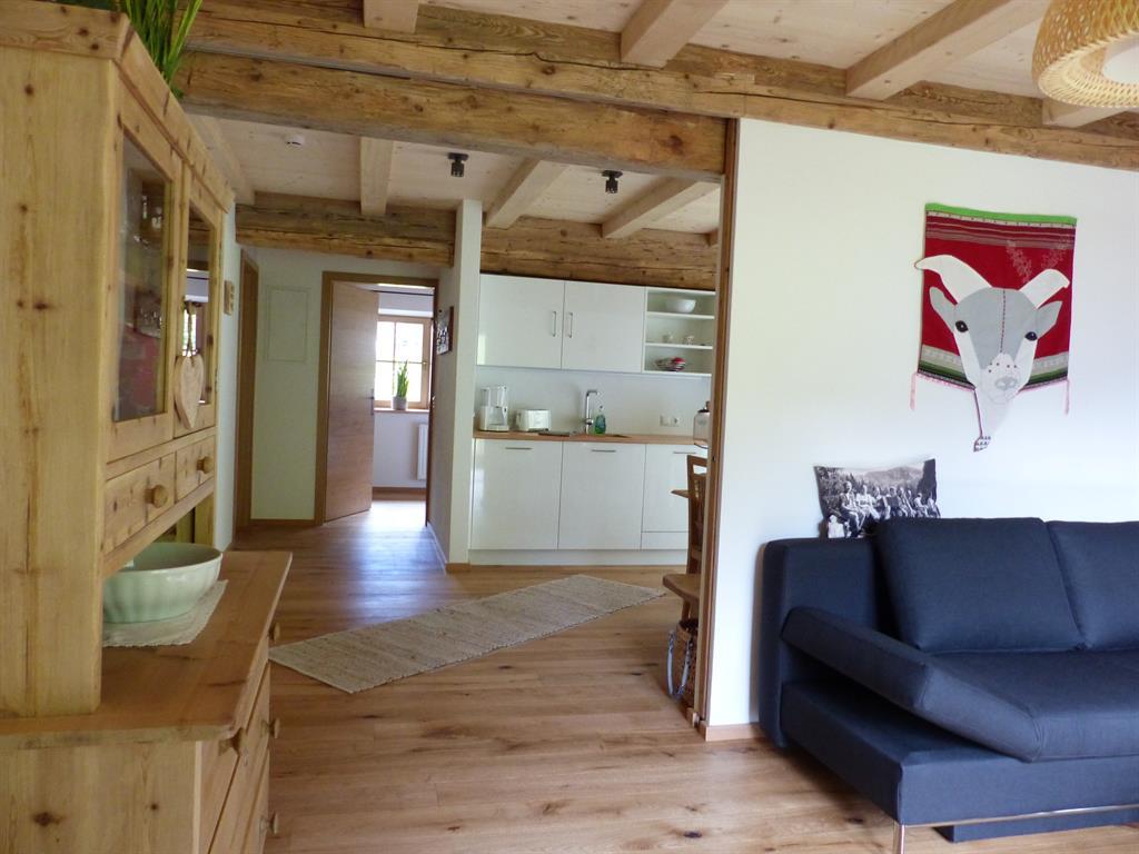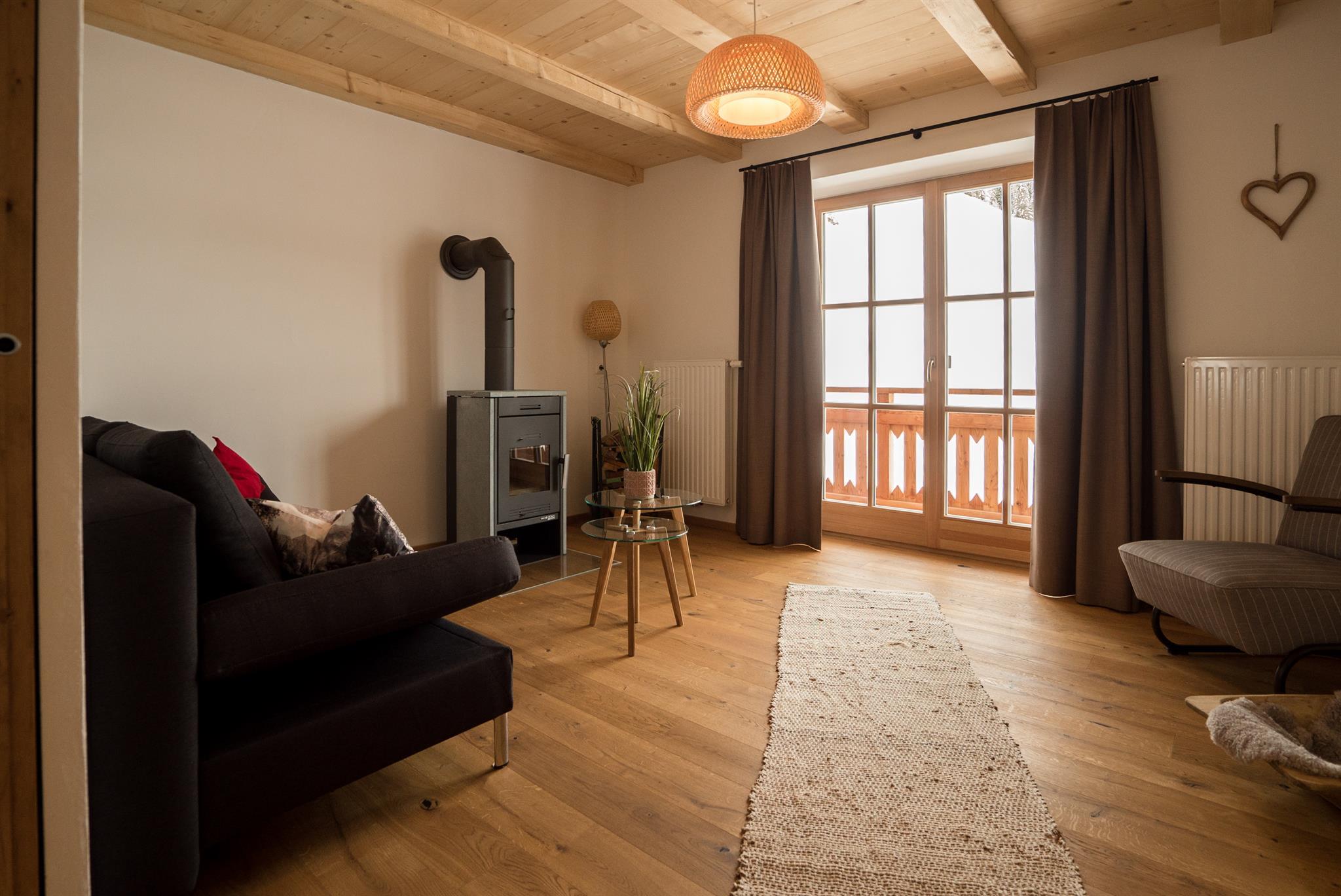 Unterstadel liegt im Hangbereich. Moderne und traditionelle Möbelstücke wechseln sich hier ab und verleihen der Wohnung einen gemütlichen Charme. Die Wohnung besitzt eine großzügige Terrasse mit Panoramablick sowohl ins Tal als auch zu den Gipfeln.