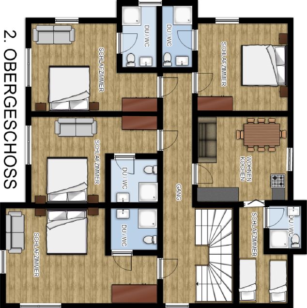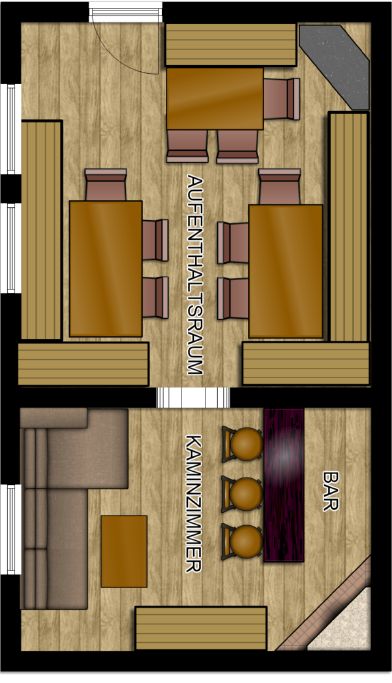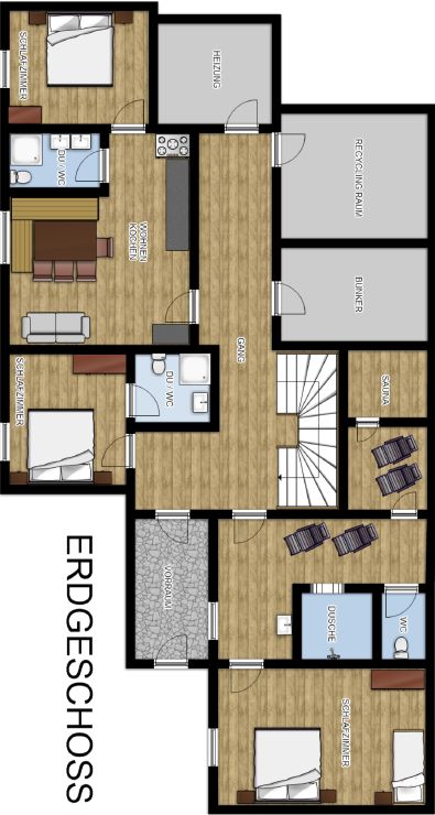 Ausstattung: 6 Schlafzimmer mit Doppelbett | 1 Schlafzimmer mit 2 Einzelbetten | 1 Schlafzimmer mit 1 Doppelbett und 1 Stockbett | 8 Badezimmer | Kabel-TV | WLAN | gemütlich uriger Aufenthaltsraum mit Bar und Kamin | 2 Küchen mit Wohnecke