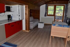 Dachgeschosswohnung ca. 40m², 2.Stock, 2-4 Personen, 1 Schlafzimmer, 1 Wohnzimmer mit Kochnische und ausziehbarer Doppelcouch, Dusche/WC, Südbalkon, SAT-TV, Bettwäsche, Hand- Badetücher, Kochgeschirr, Kaffeemaschine, Kühlschrank, Backofen, W-Lan