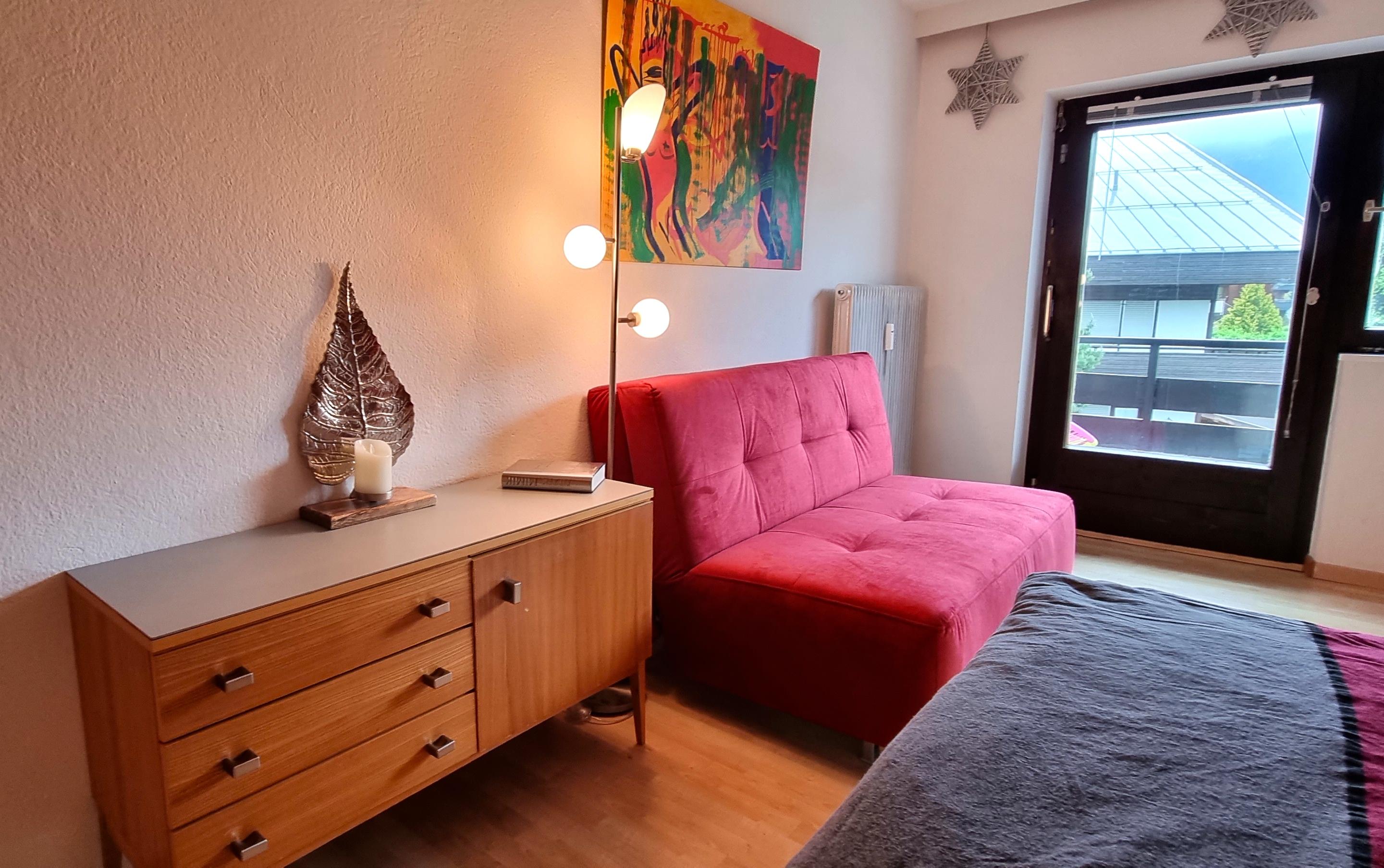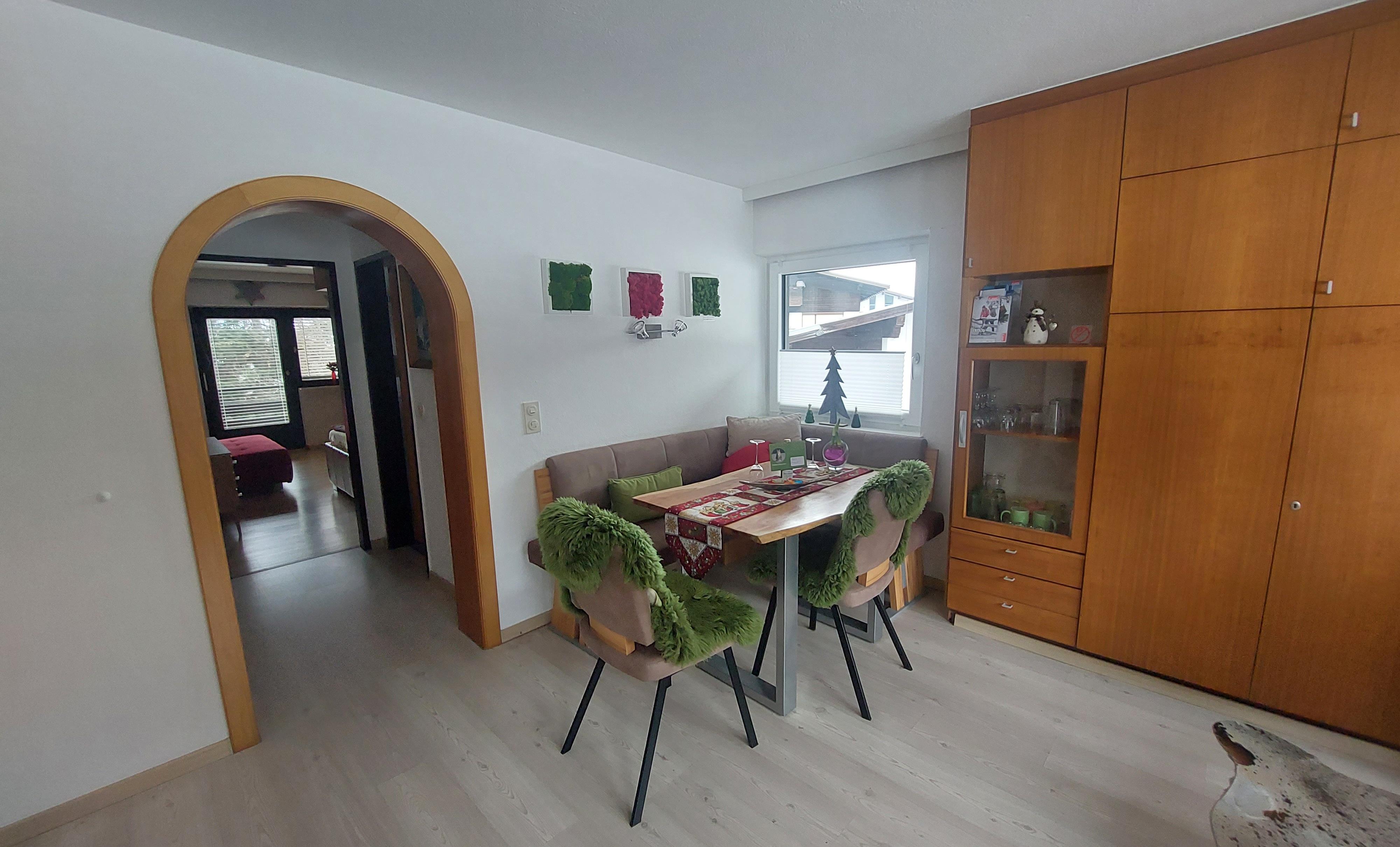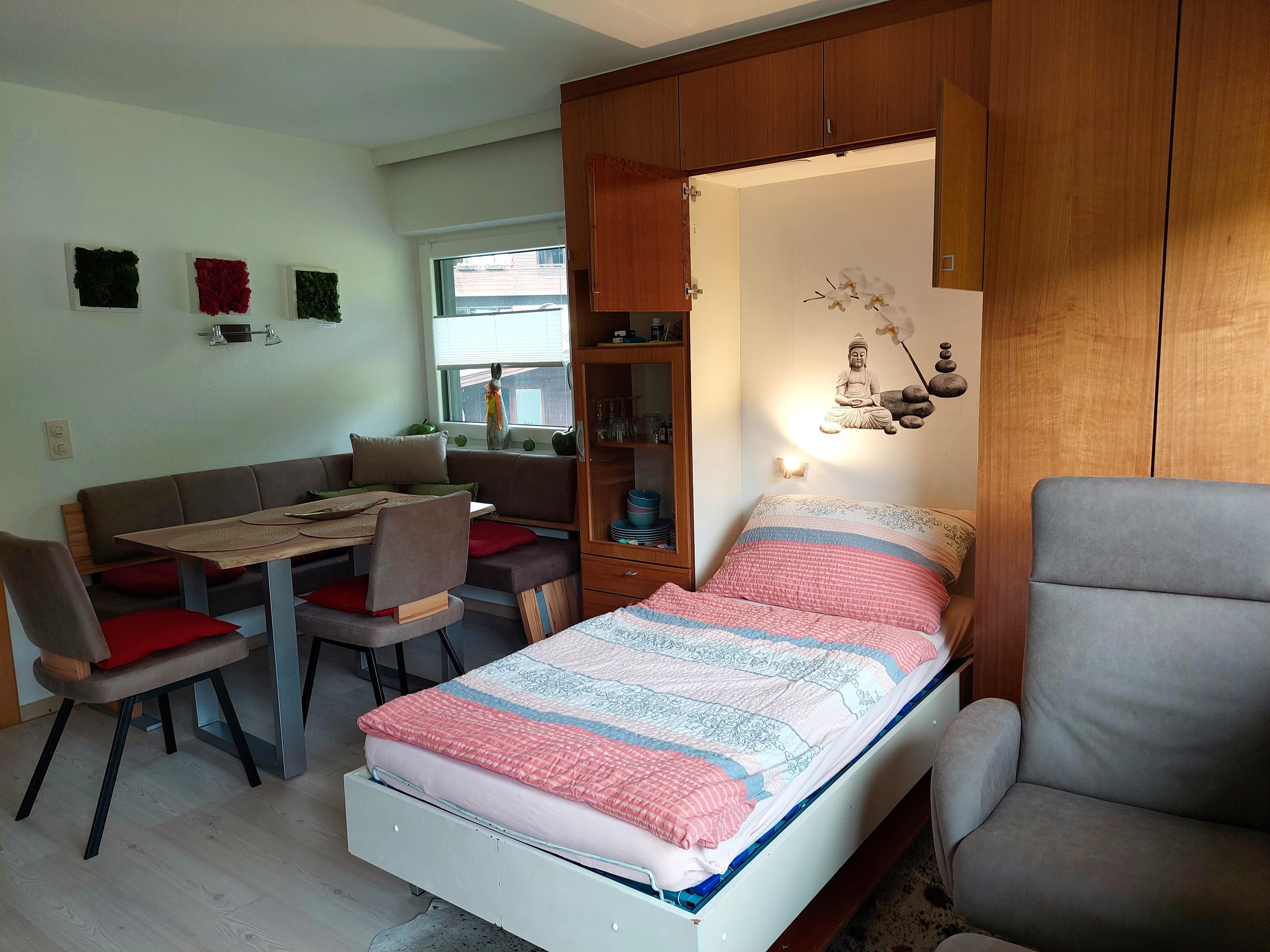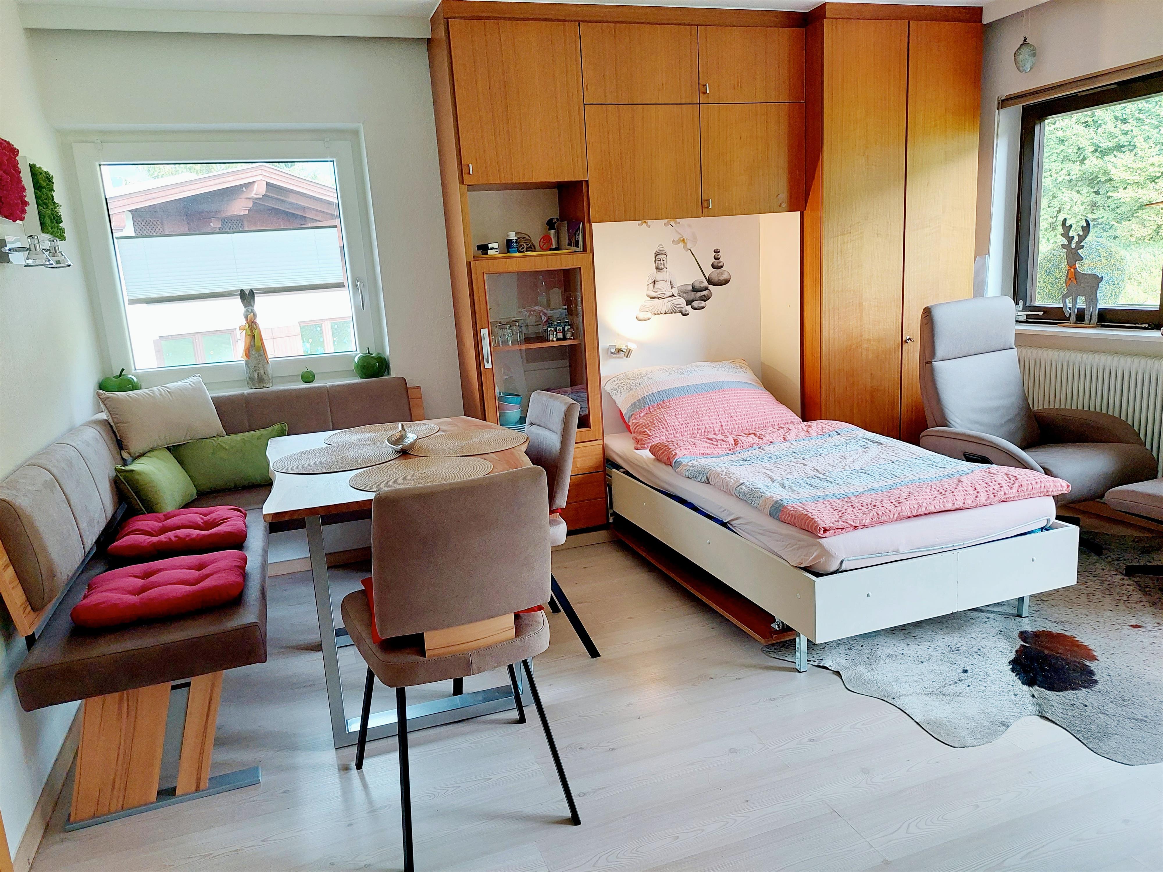 2 Zimmer NICHTRAUCHER-Wohnung,1 Schlafzimmer mit Doppelbett & 2er Sofa Schlaffunktion & 1Wohnzimmer. Im Wohnzimmer befindet sich ein eingebautes Bett im Wandschrank zum Ausklappen(mit Bettzeuglade). Bad mit Badewanne, WC extra, Vorzimmer mit Garderobe,voll ausgestattete Küche, 2 liebevoll gestalltete Balkone (Morgen- & Abendsonne),Balkonausstattung - Essmöglichkeit. Autoabstellplätze vor dem Haus. 1-max.5 Personen/ 2 Erw & 1-3 Kinder oder 3 Erw. & 1-2 Kinder. Wohnung neu 20 renoviert/gestaltet!