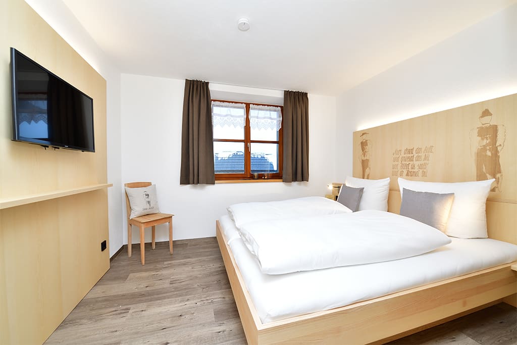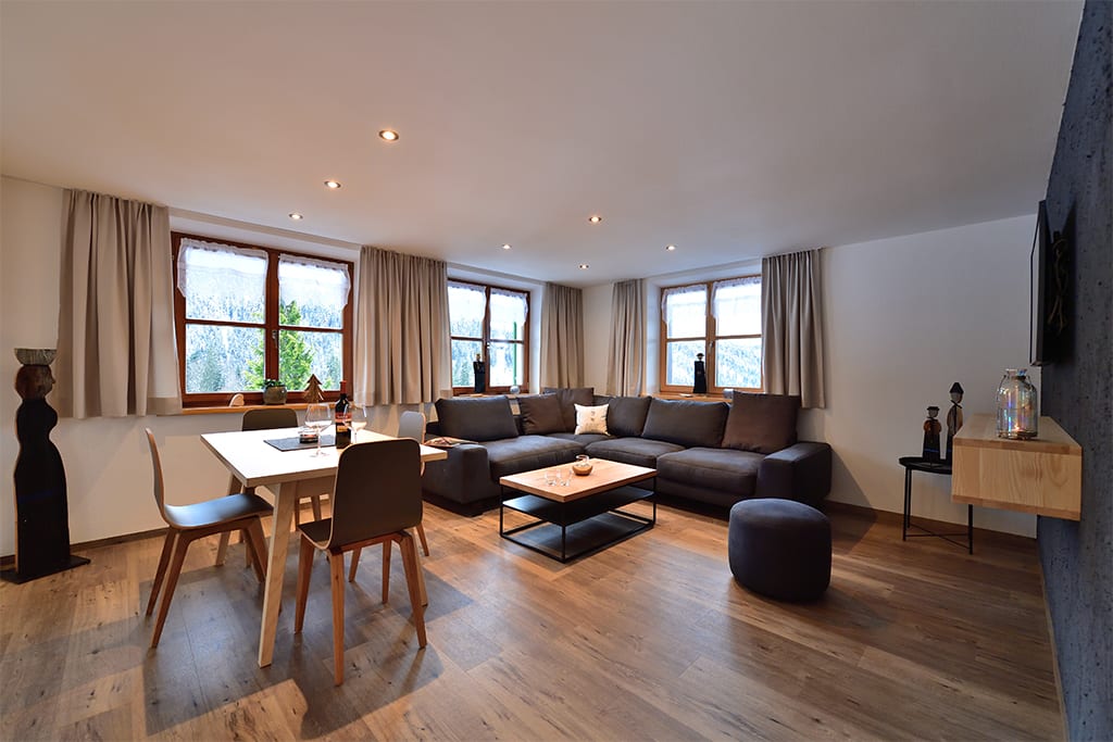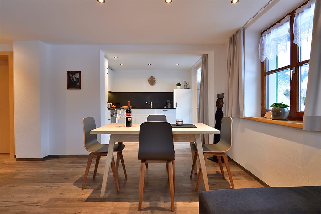 Wer’s gemütlich mag, startet zur Skitour direkt hinterm Haus oder genießt einfach die Ruhe mit Blick auf die verschneiten Berge.