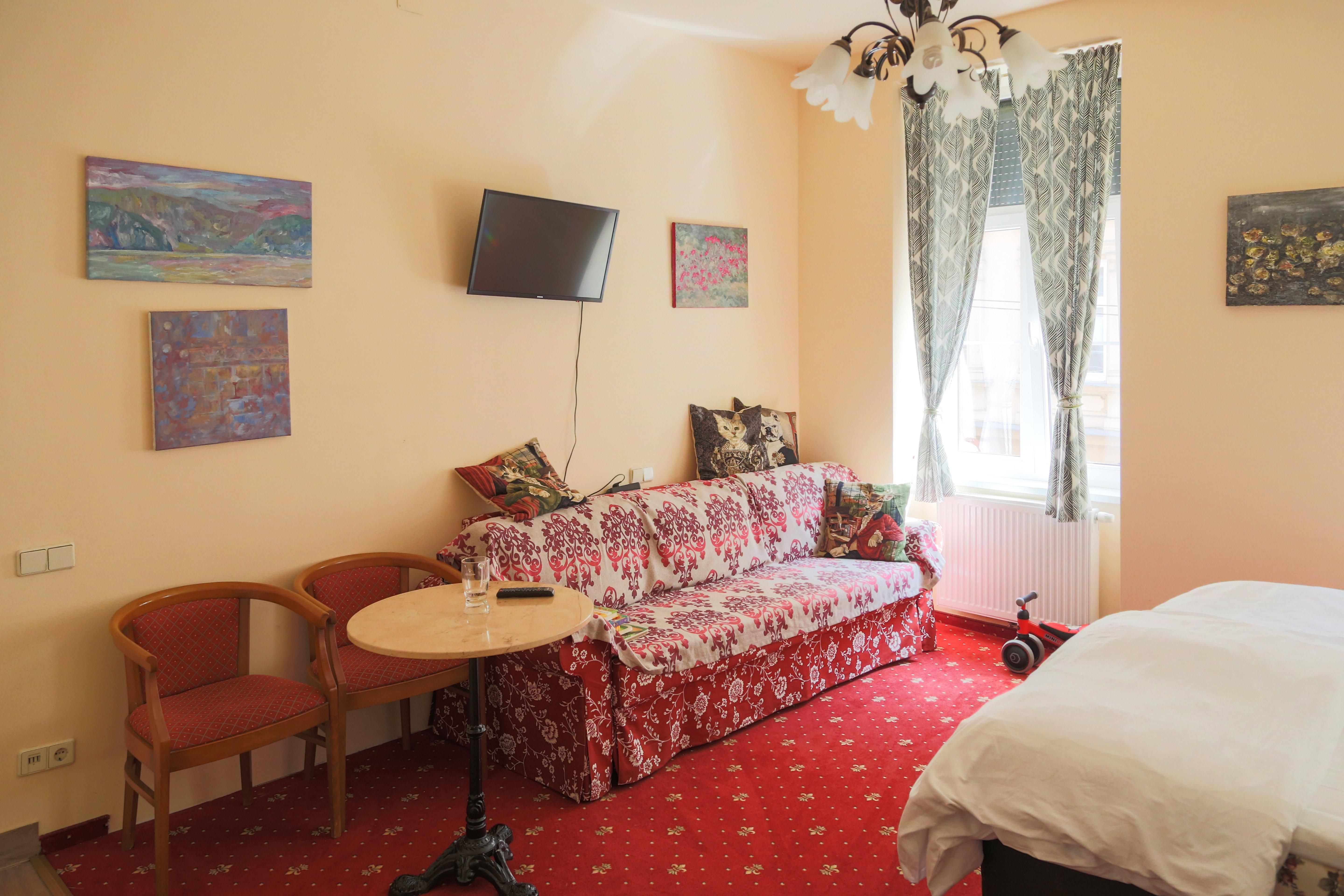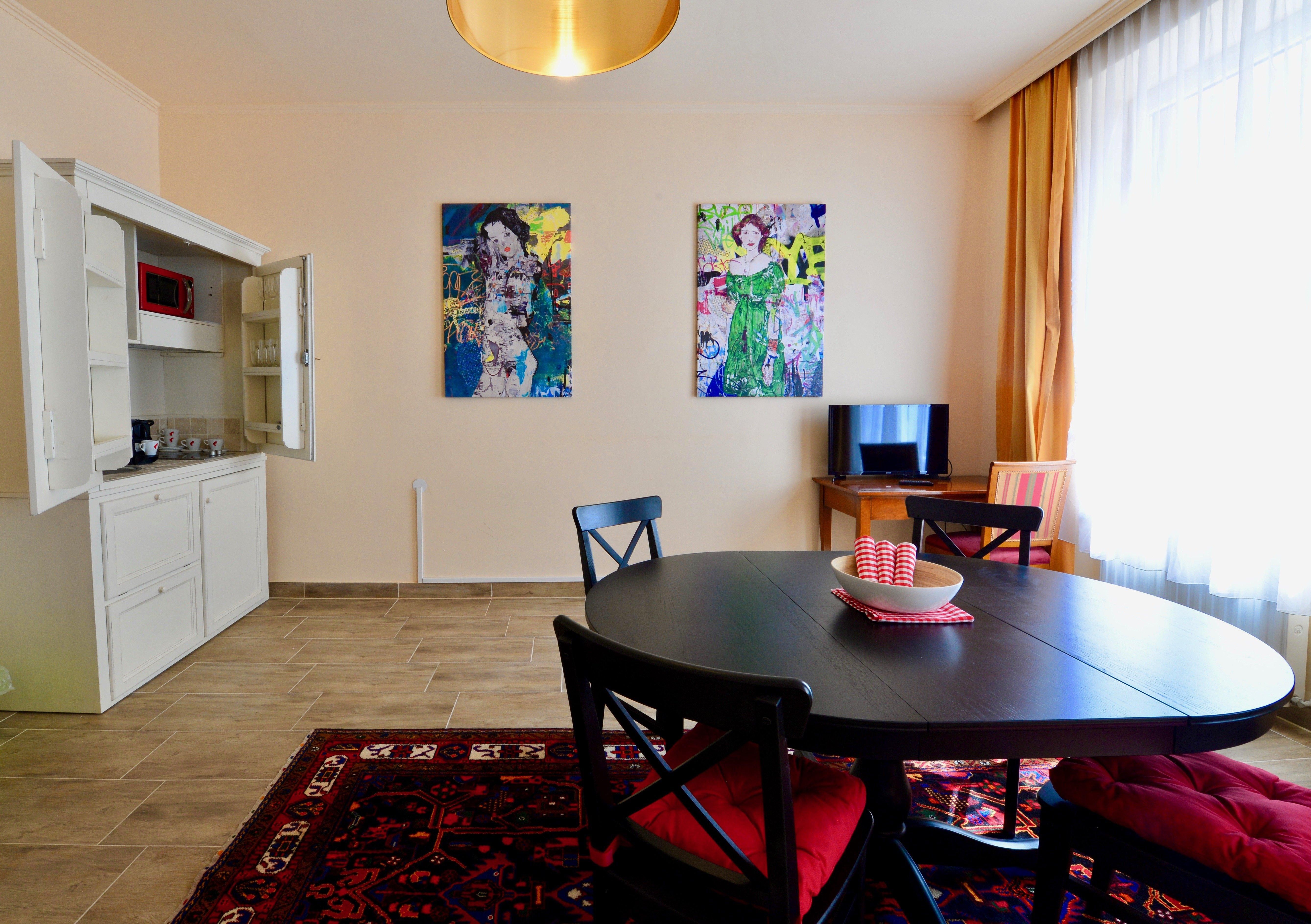Ein romantisches Kunsthotel in Wien. Großzügige Räume, kuschelige Matratzen, neue Bäder. Wirklich viele Gemälde. Küchenkabinett(Kühlschrank, Mikrowelle, Induktionsplatten, Espressomaschine, Geschirr)
