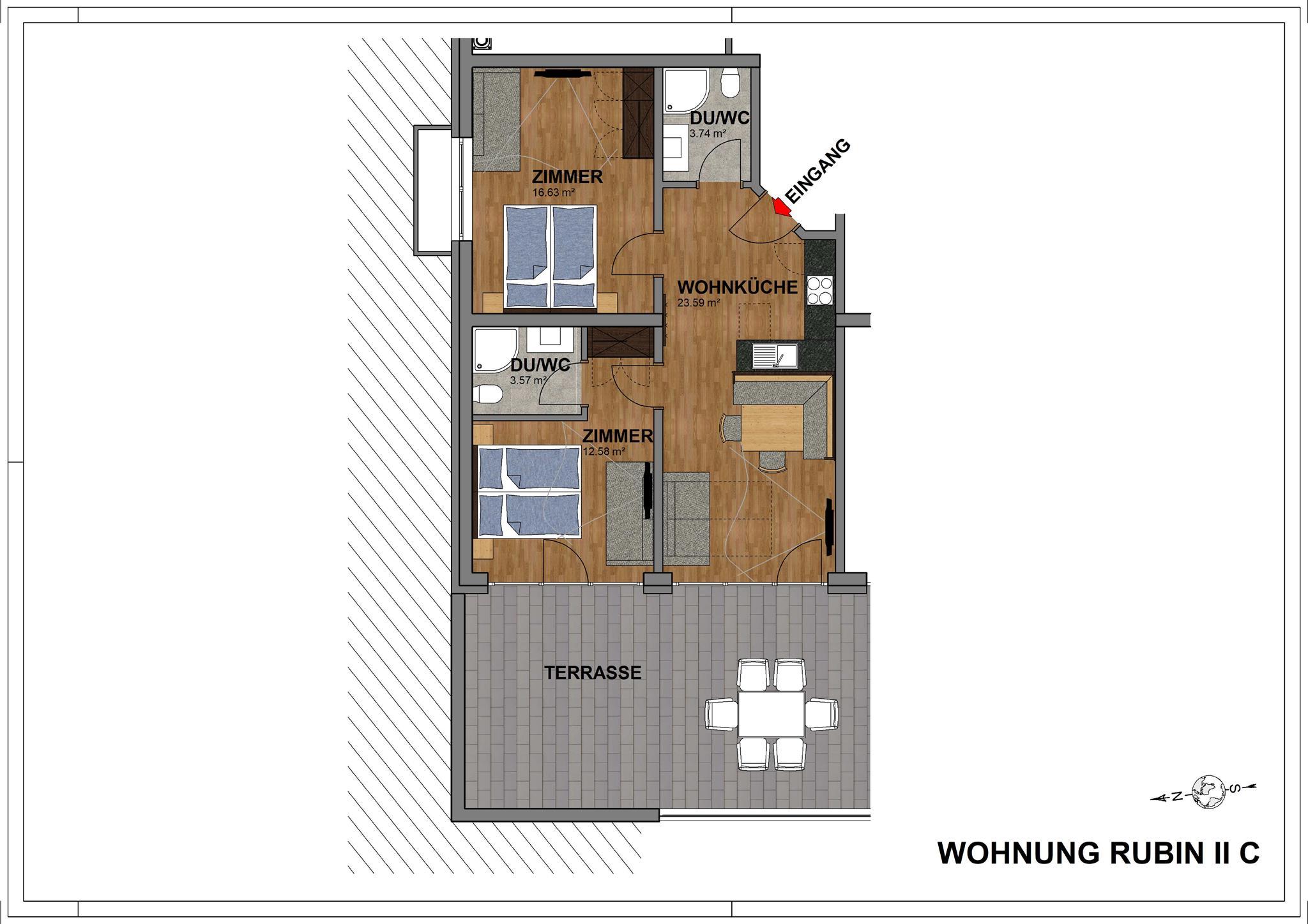 ca. 61 m², für 4-6 Personen, voll ausgestattete Küche mit Backrohr, Microwelle, Geschirrspül- und Kaffeemaschine, gemütlicher Esstisch, Kabel TV, Wireless-Lan-Access, Wohnraum mit ausziehbarem Sofa, 2 Schlafzimmer mit Doppelbett, großer Kleiderschrank, 2 Badezimmer mit Dusche und WC, großer Balkon