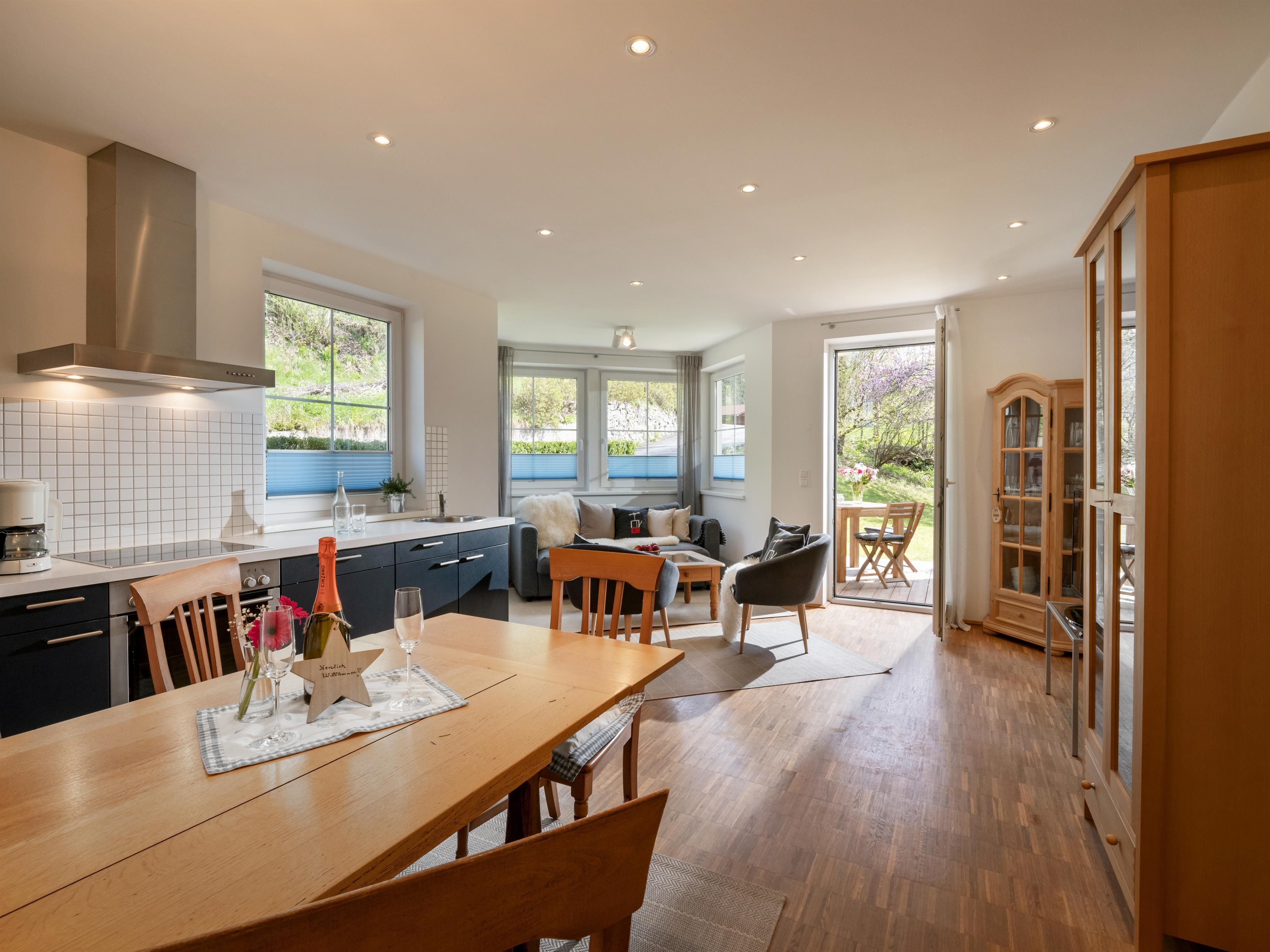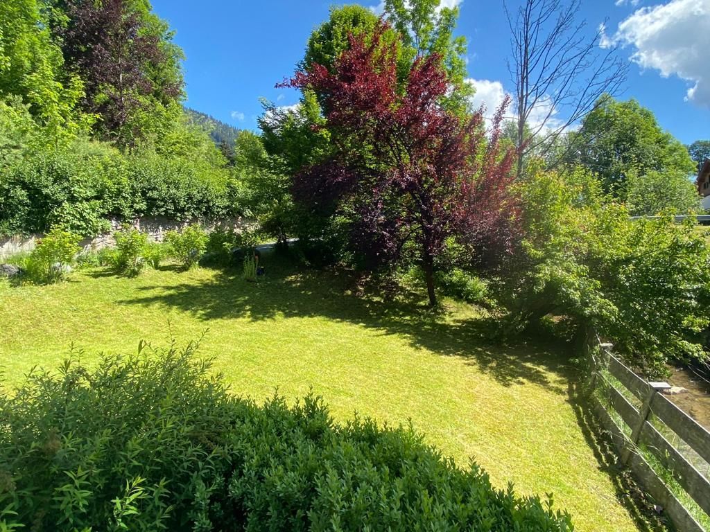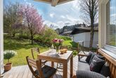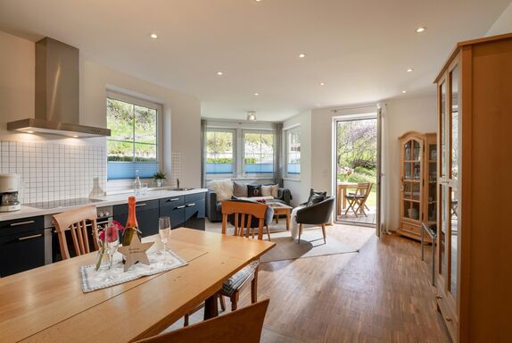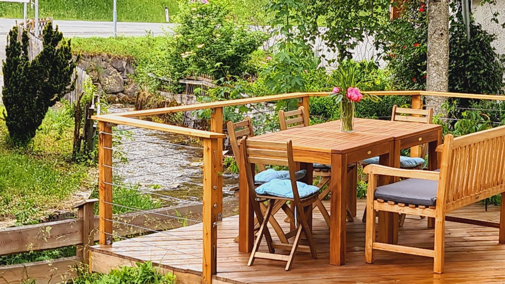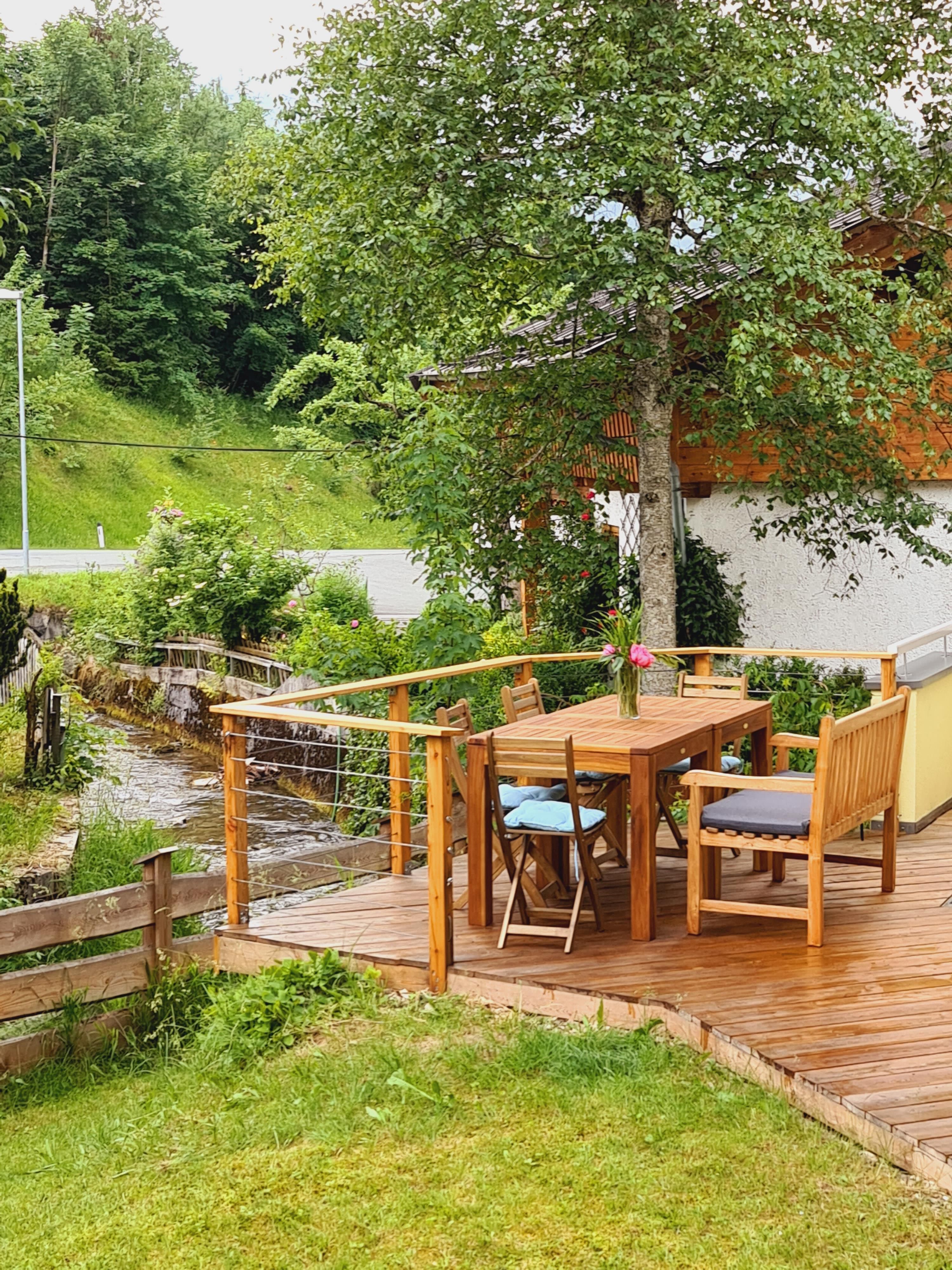 Die Wohnung mit eigenem Eingang ist im Erdgeschoss und hat einen direkten Zugang in den Garten, der an einen Bachlauf grenzt.