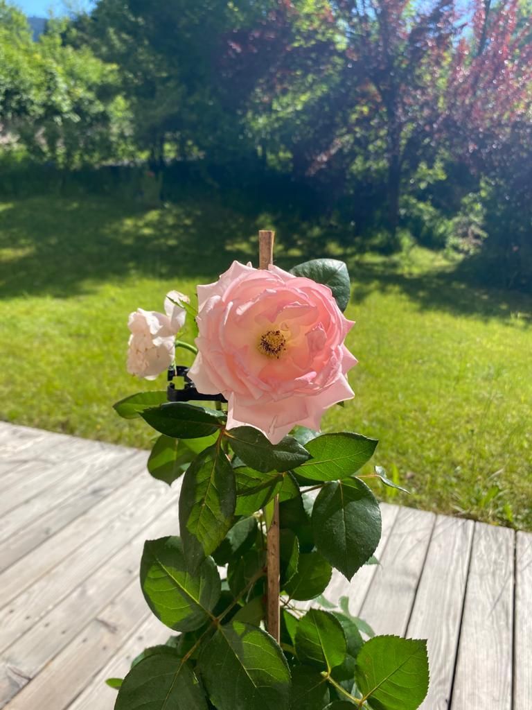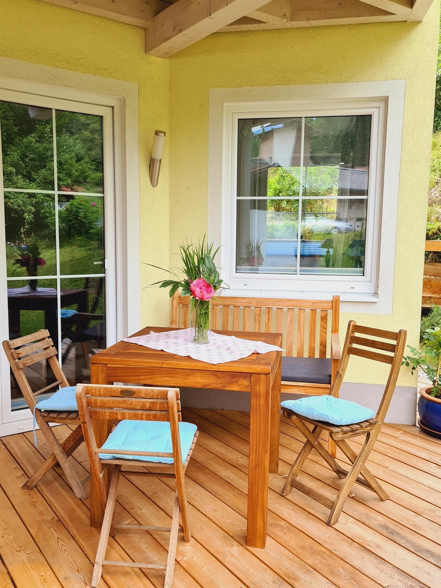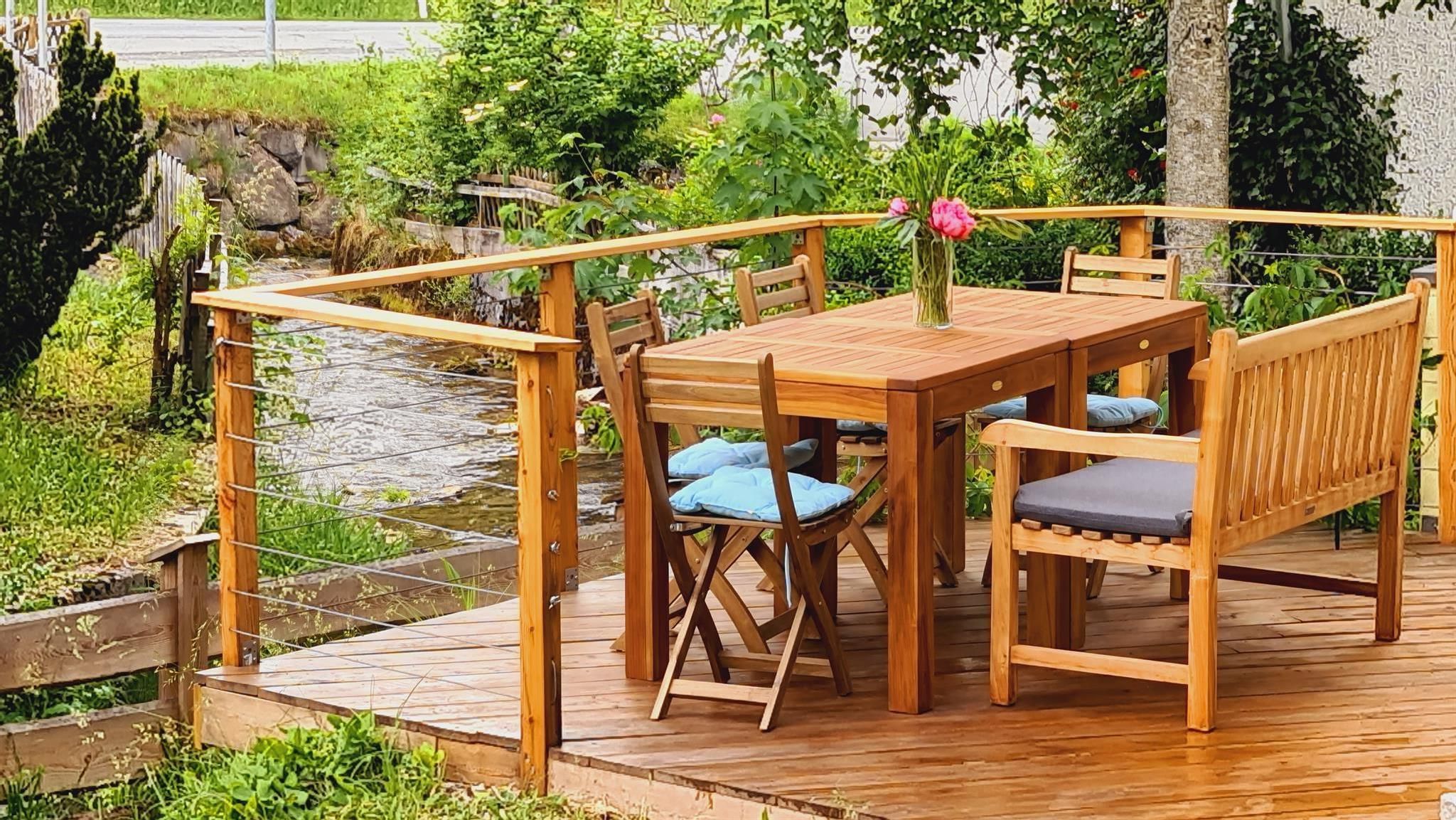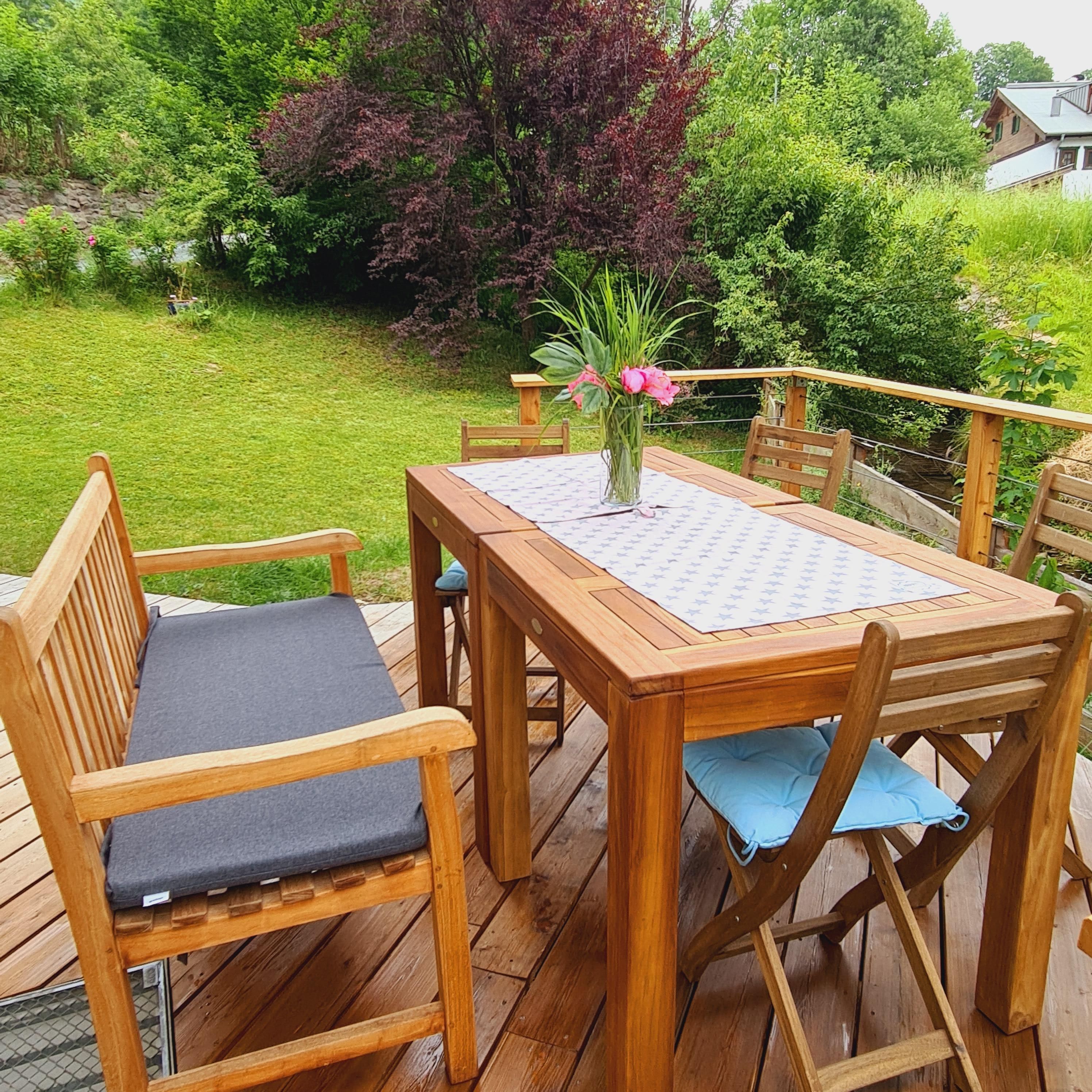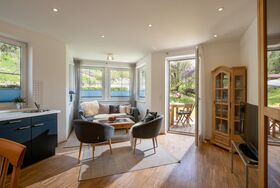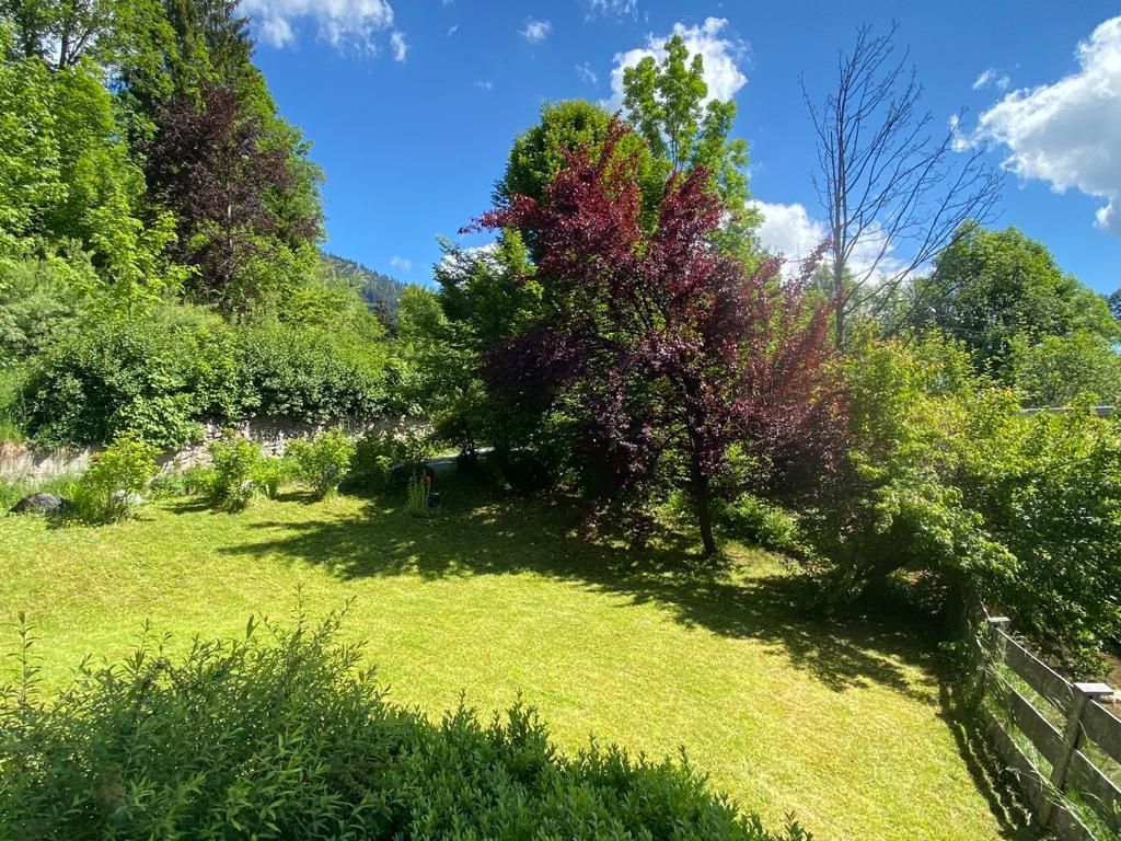 Die Wohnung mit eigenem Eingang ist im Erdgeschoss und hat einen direkten Zugang in den Garten, der an einen Bachlauf grenzt.