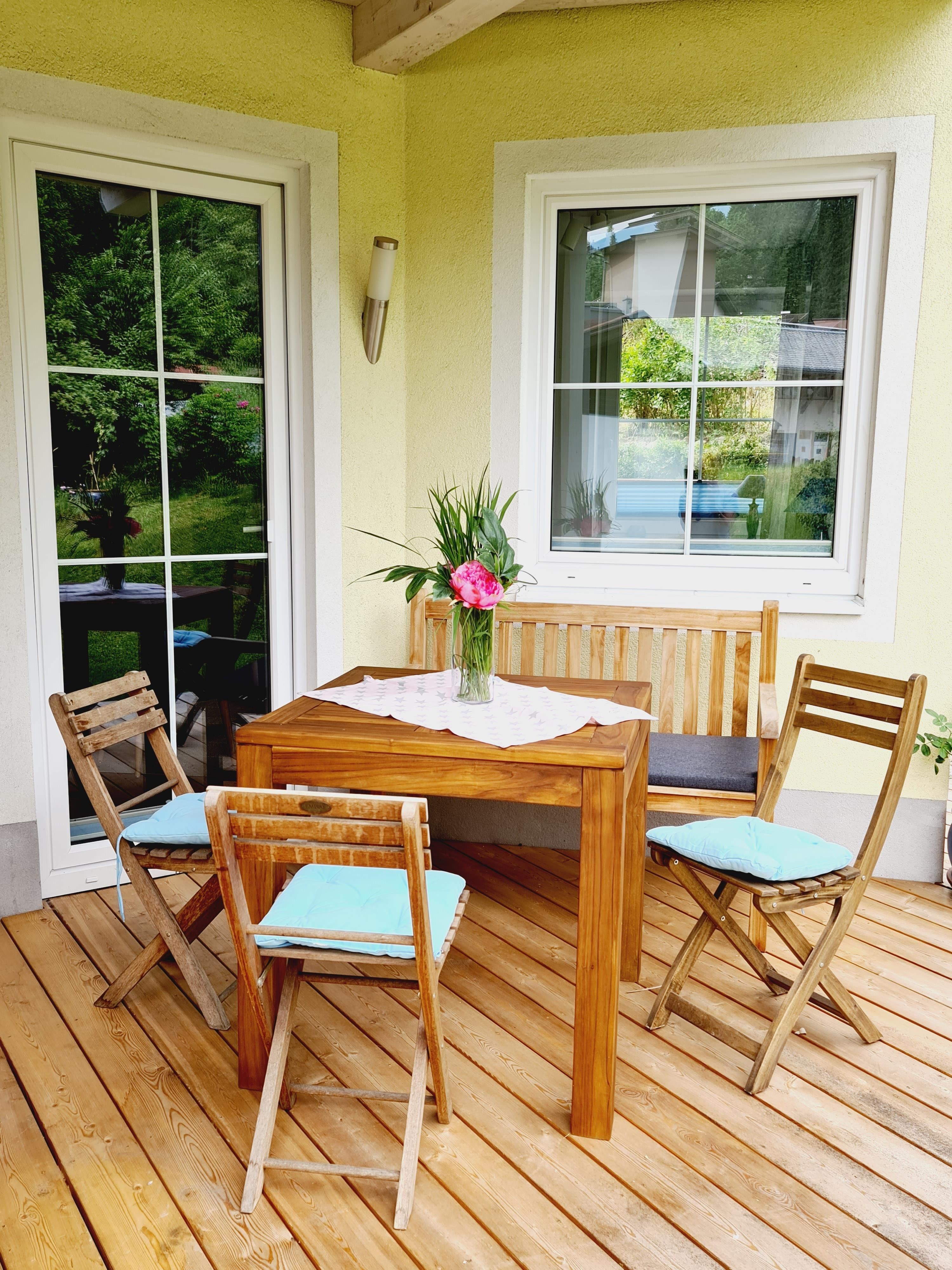 Es sind Terrassenmöbel und Gartenliegen vorhanden.