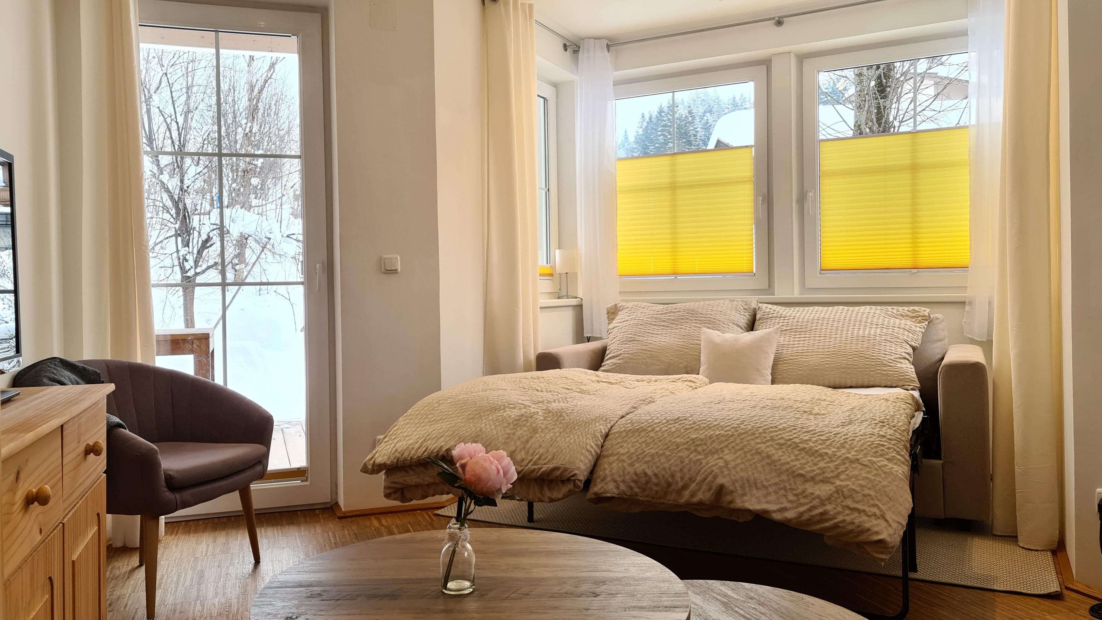 Wunderschöne eingerichtete Ferienwohnung für 2 - 4 Personen mit 1 Schlafzimmer, 1 großes Wohnzimmer, Wohnschlafraum mit Schlafcouch, Küche, Dusche/WC und sehr schöne Terrasse/Garten - Skikeller