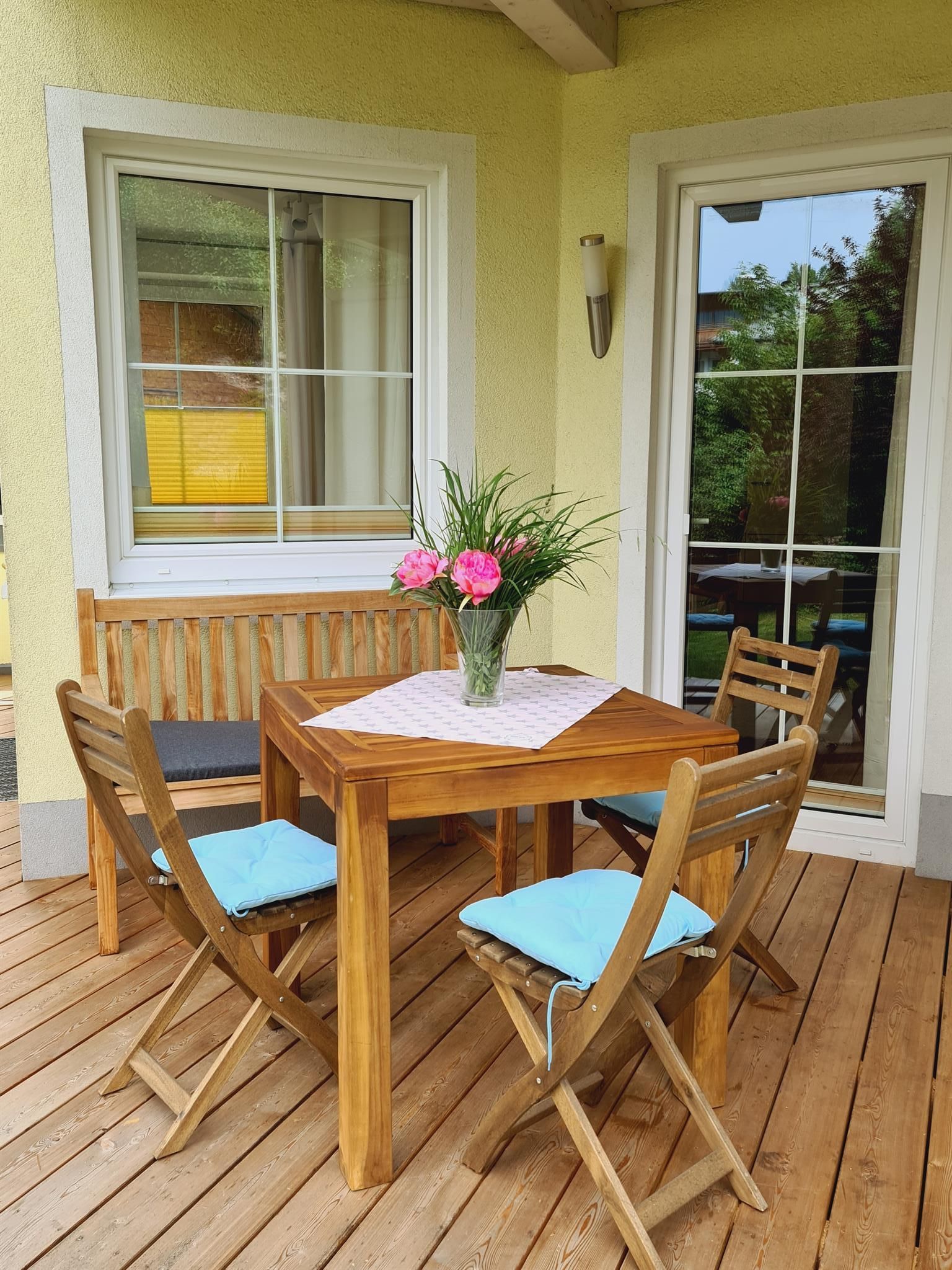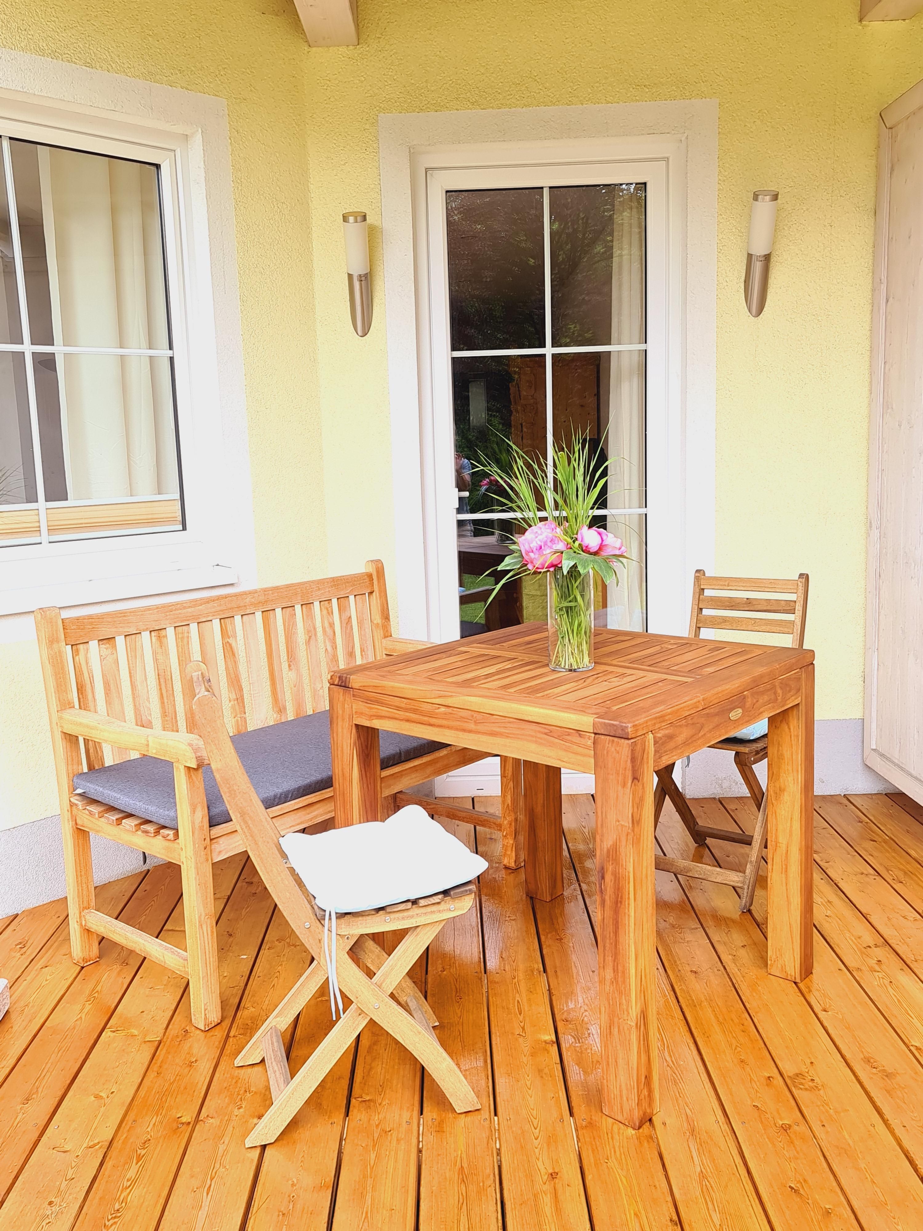 Es sind Terrassenmöbel und Gartenliegen vorhanden.