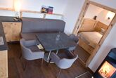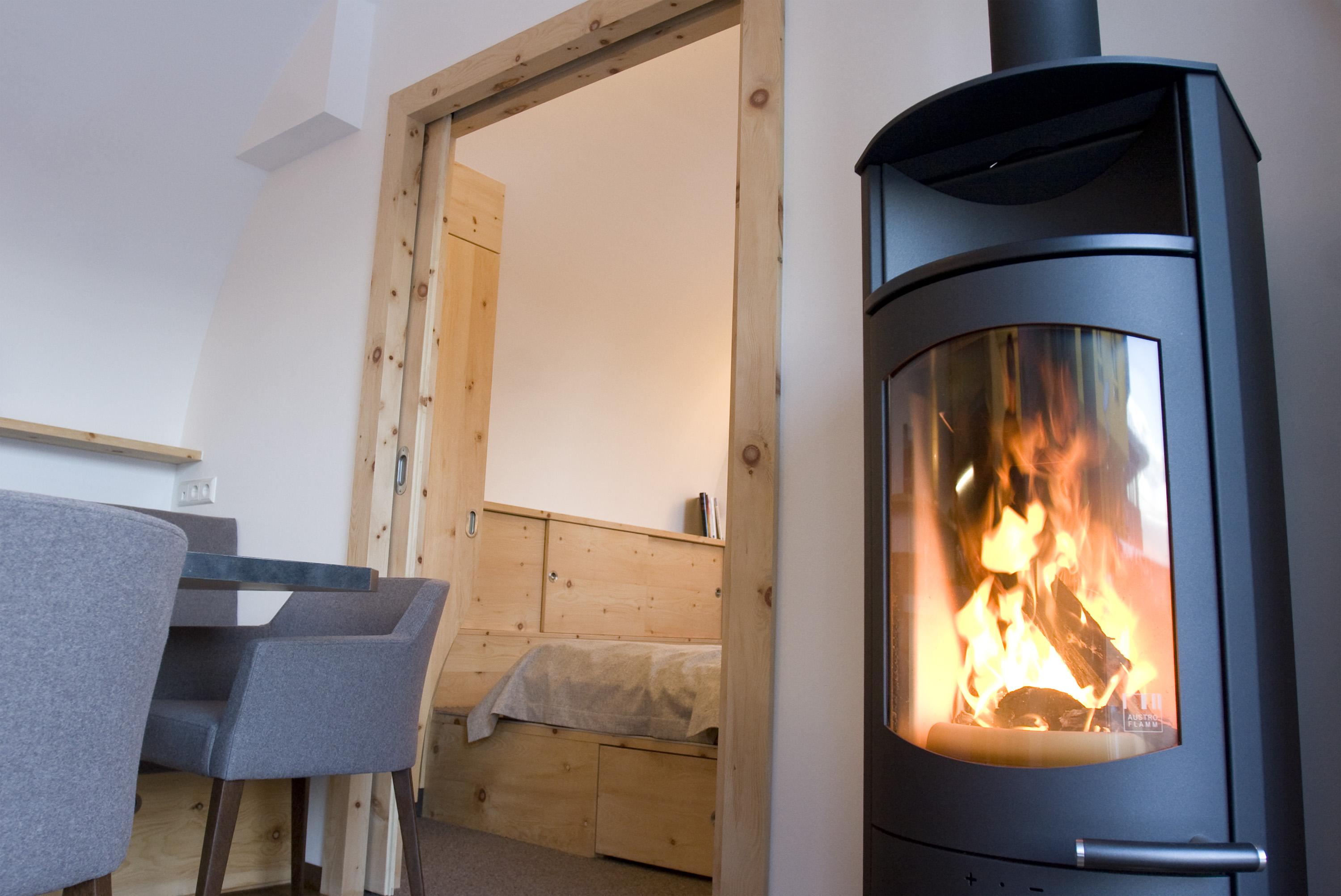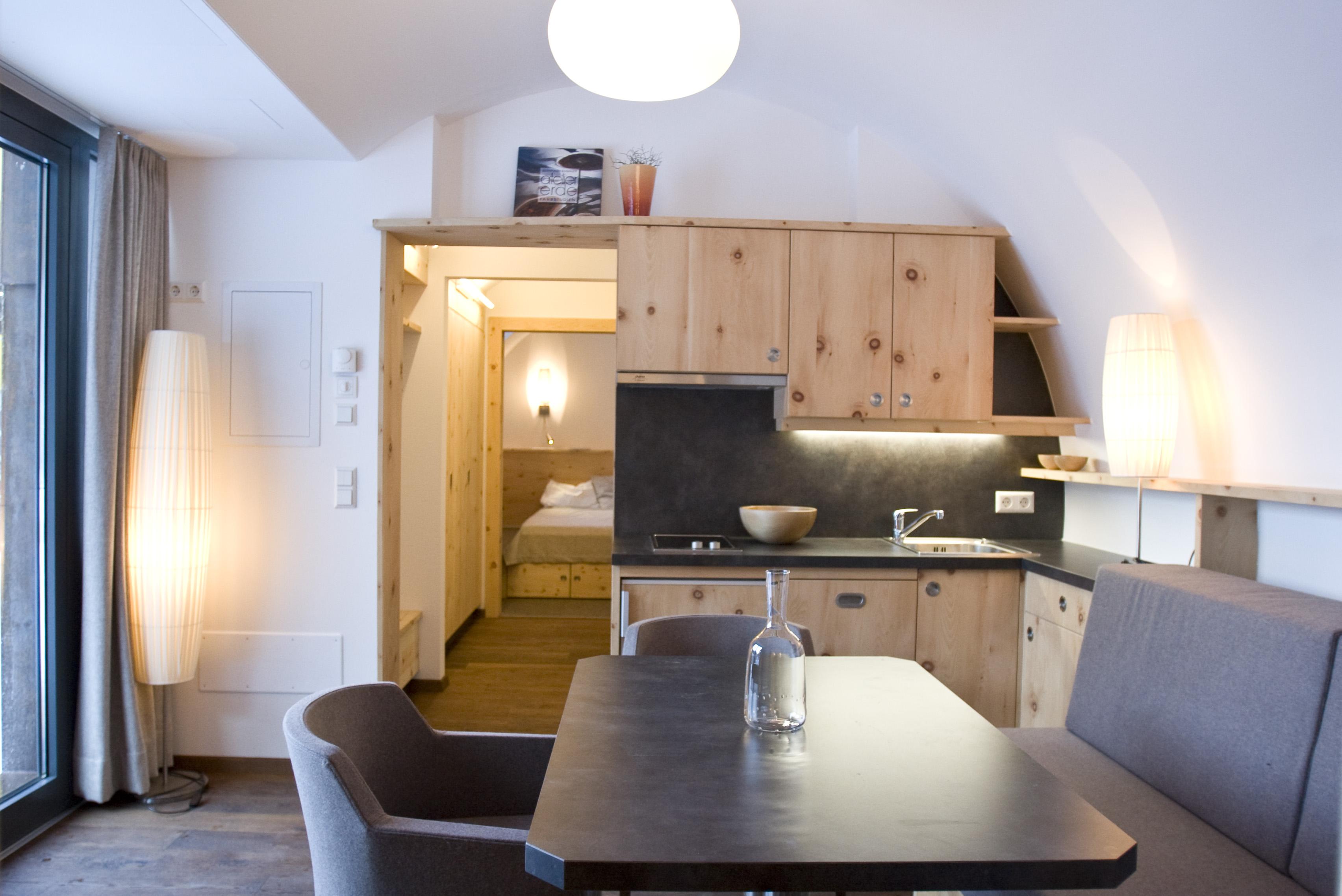 Der Innenraum mit den hohen Gewölbedecken und den liebevoll, mit Zirbenholz errichteten Staumöglichkeiten bietet ein unvergessliches Wohngefühl für junge und jung gebliebene Gäste.