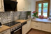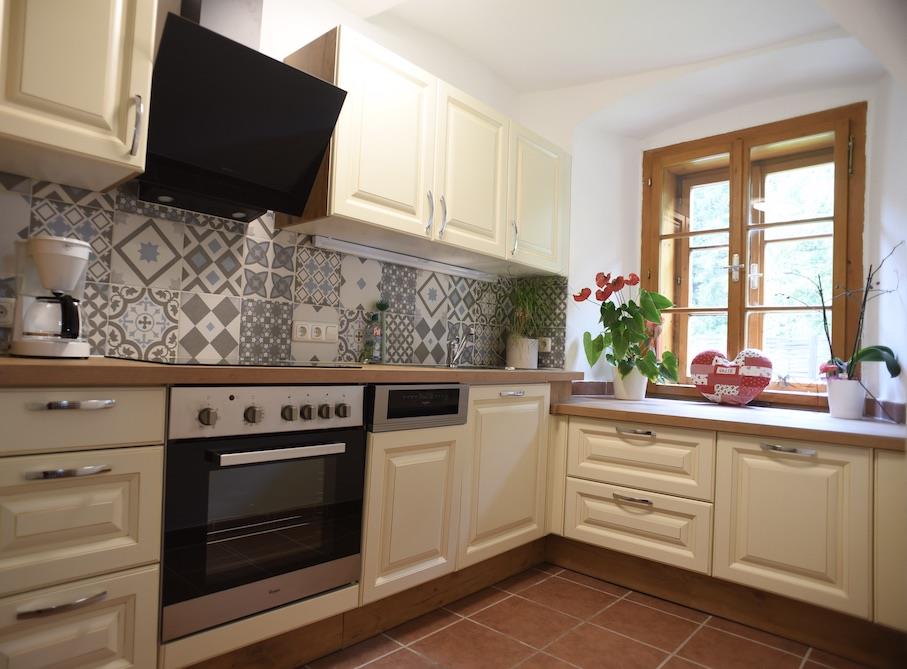 • eine getrennte Küche (voll ausgestattete DAN-Küche in Landhausstil mit Geschirrspüler, Ceranfeld, Backofen, …)