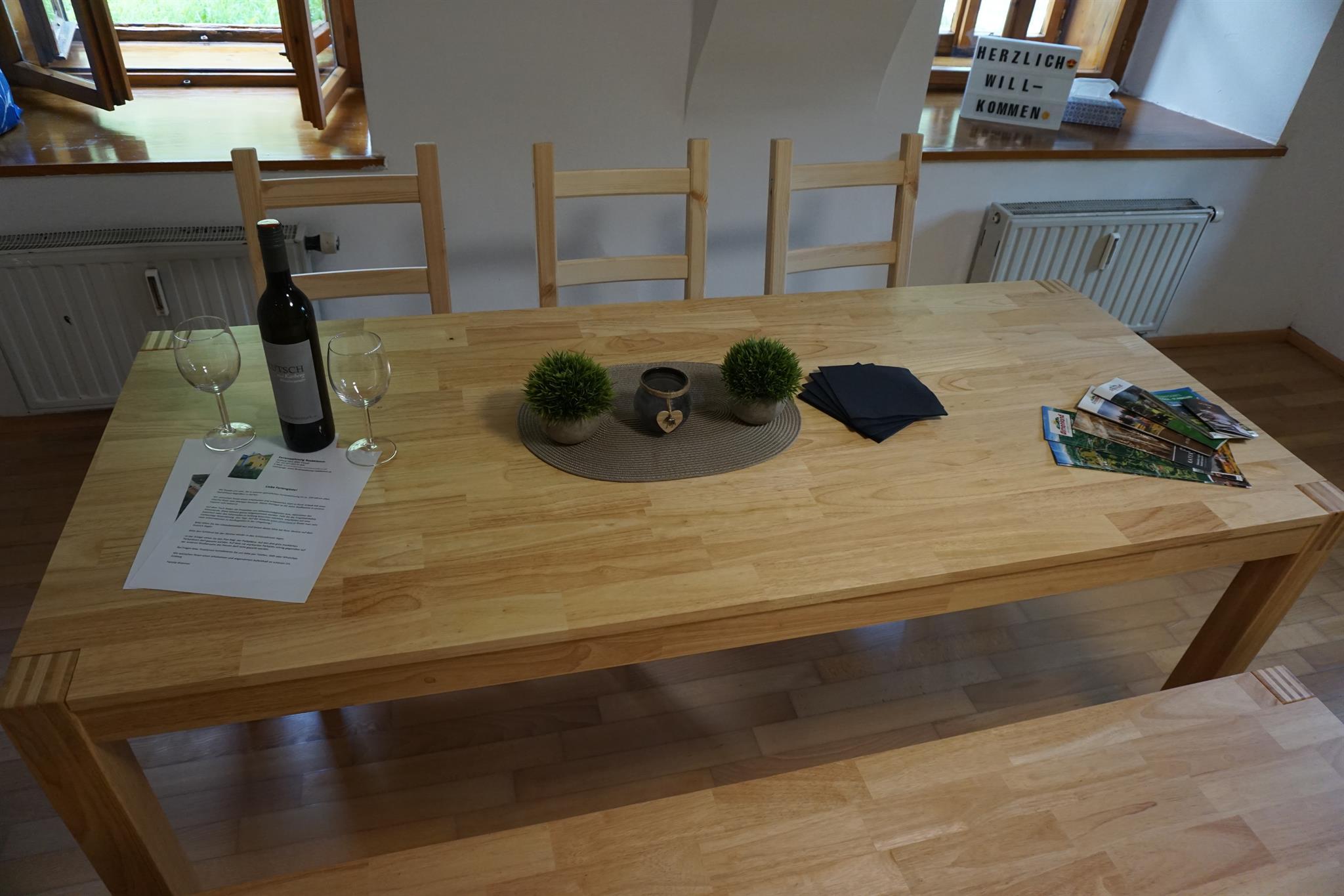 • ein Ess-/Wohnzimmer mit einer ausziehbaren Couch für bis zu 2 Personen und einem Vollholz-Esstisch mit dazugehöriger Bank und 2 Sesseln