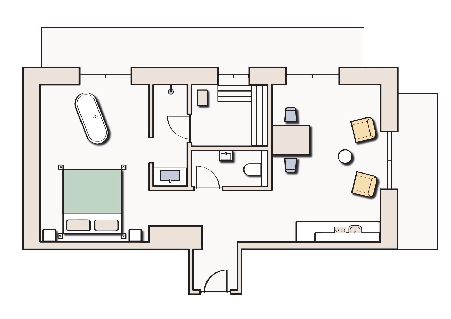 2 Personen, 50 m² Zweisamkeit und Romantik wird in diesem Apartment gelebt: Mit der eigenen Privatsauna, der Panoramabadewanne mit Ausblick auf die Bergwelt von Gastein und noch vielem mehr wird dein Urlaub zu einem unvergesslichen Erlebnis.
