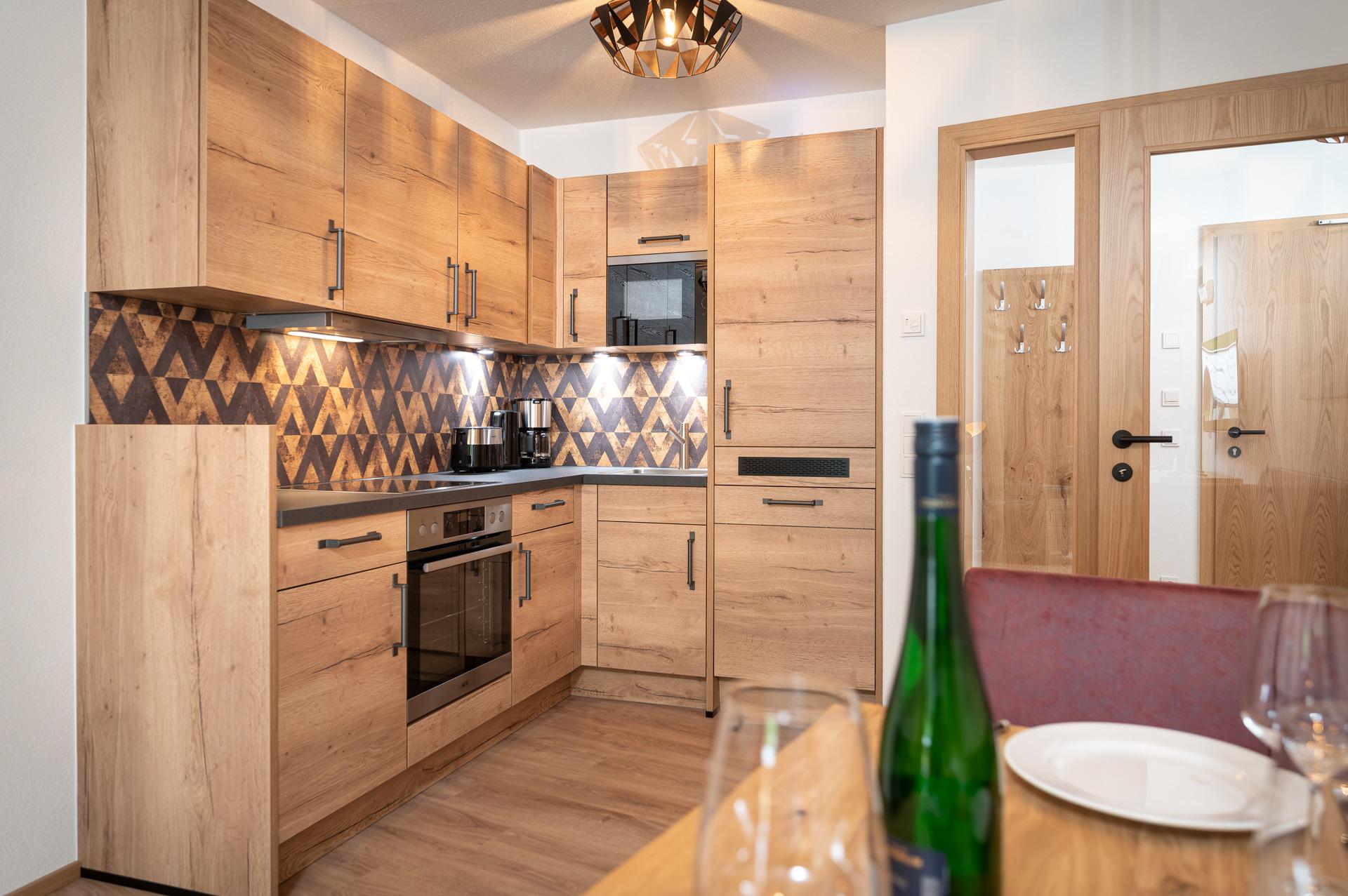 in den Wohnraum integrierte, voll ausgestatteter Küche mit: 4-Platten-Herd/Backrohr, Mikrowelle, Kühlschrank mit Gefrierfach, Geschirrspüler, Kaffeemaschine, Wasserkocher, komplettem Koch- und Essgeschirr für die max. Personenanzahl