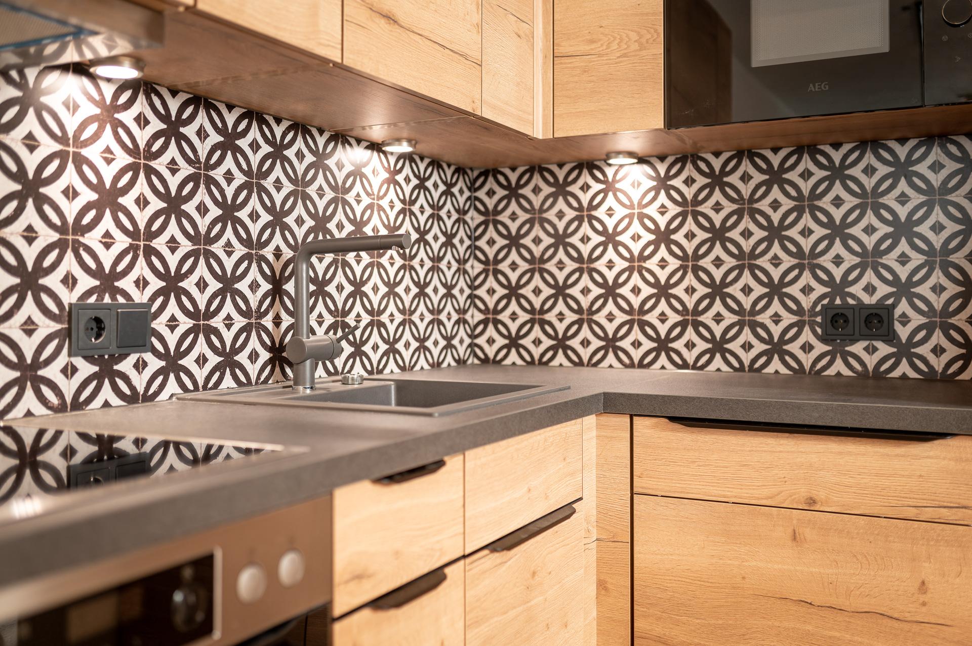 in den Wohnraum integrierte, voll ausgestatteter Küche mit: 4-Platten-Herd/Backrohr, Mikrowelle, Kühlschrank mit Gefrierfach, Geschirrspüler, Kaffeemaschine, Wasserkocher, komplettem Koch- und Essgeschirr für die max. Personenanzahl
