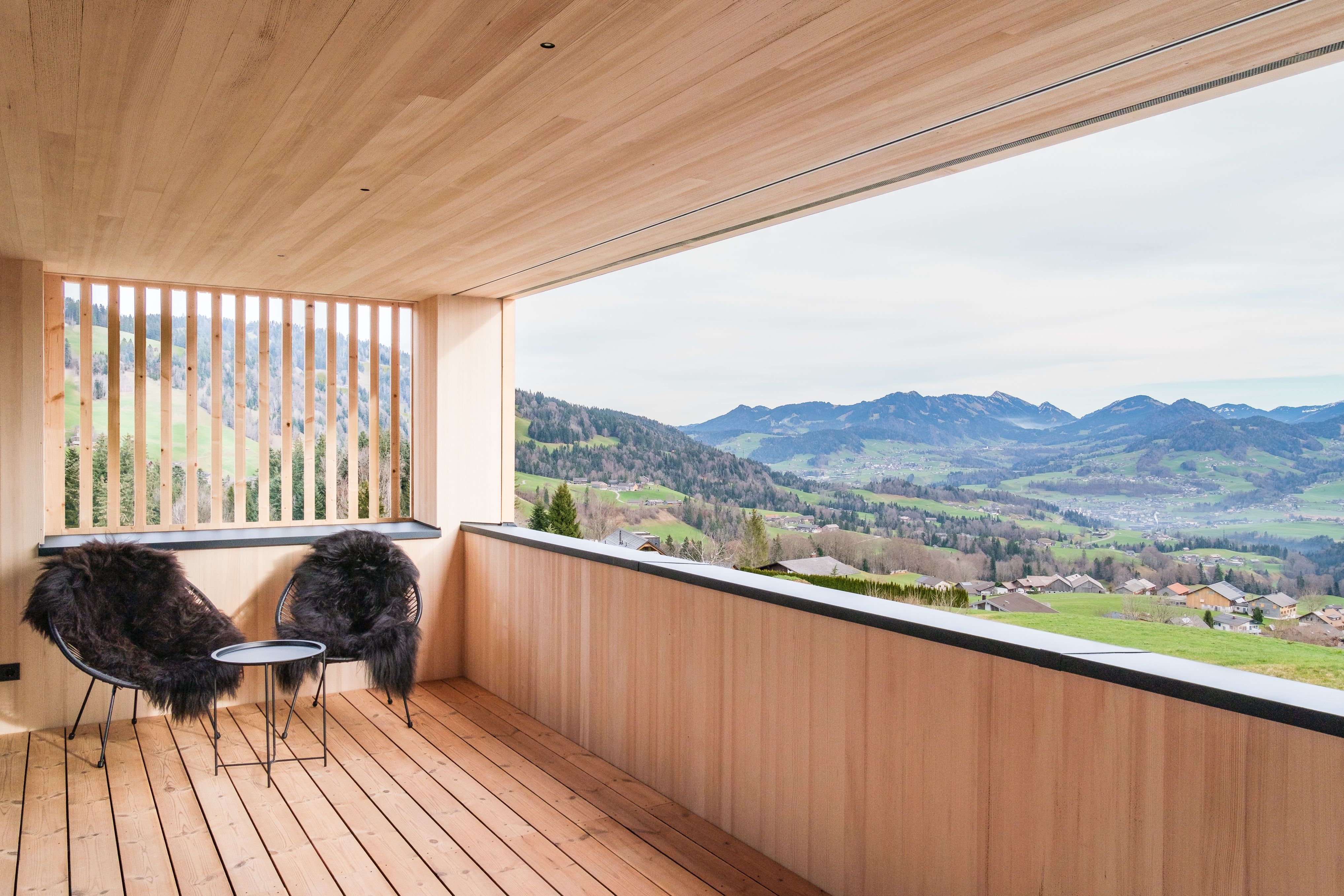 • eine 30 m² große Ostterrasse bietet einen unglaublichen Blick über den Bregenzerwald und die Berge, die 25 m² große Westterrasse vor der Sauna und zwei Schlafzimmern ist bergseits gerichtet und gibt den Blick in Richtung „Bödele“ frei.