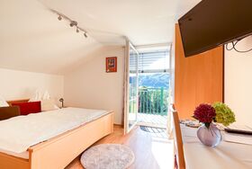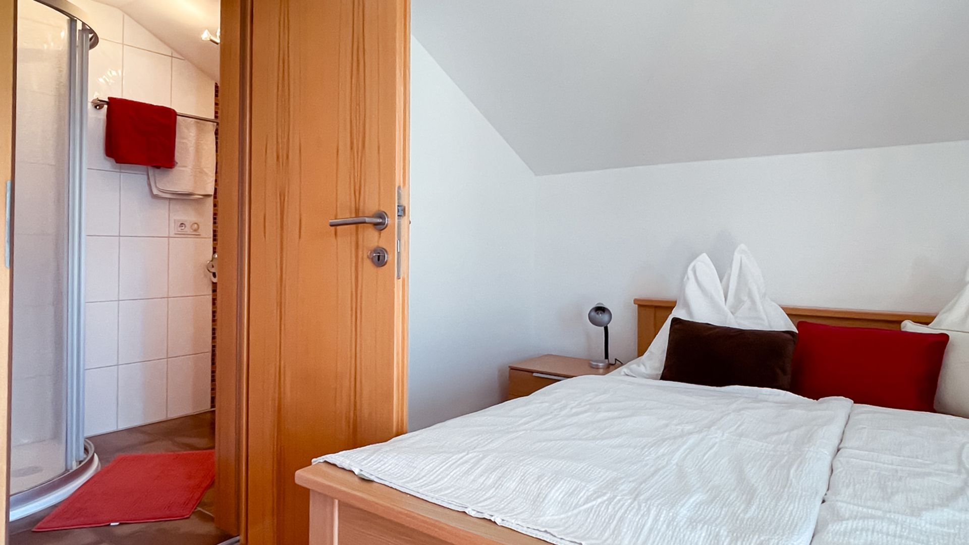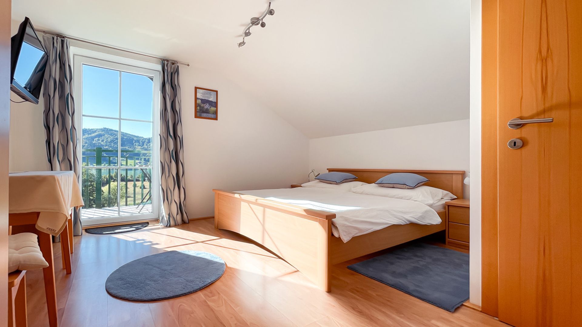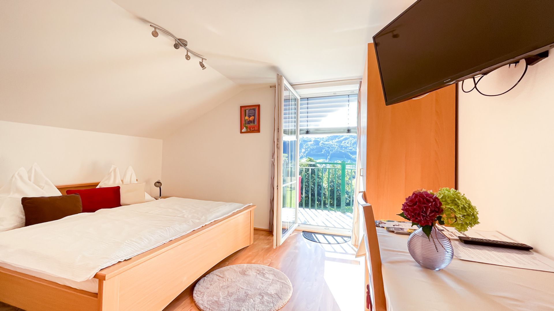 Die Doppelzimmer sind mit TV, Balkon und Dusche/WC ausgestattet. Sie genießen einen fantastischen Blick zum Irrsee.