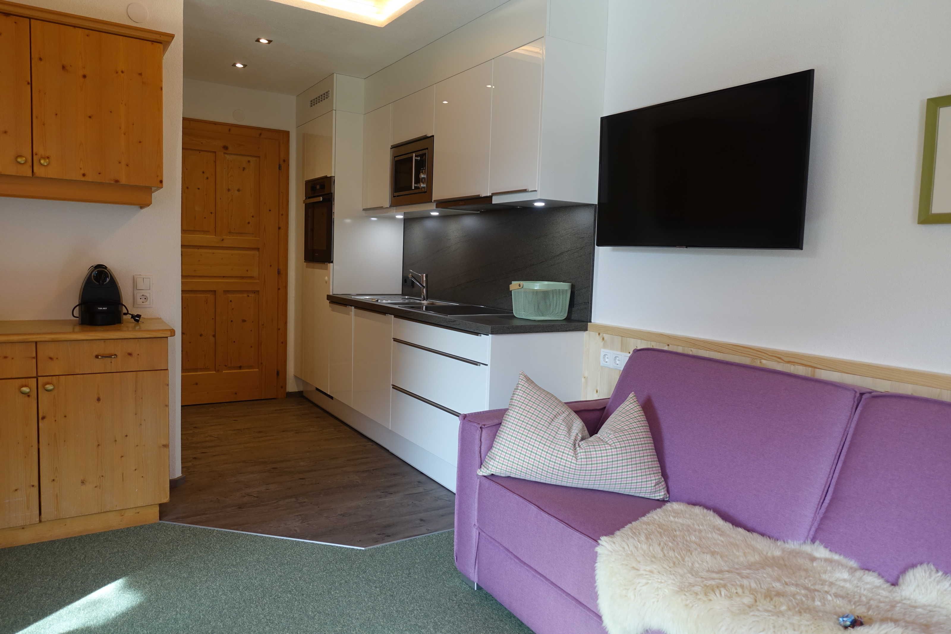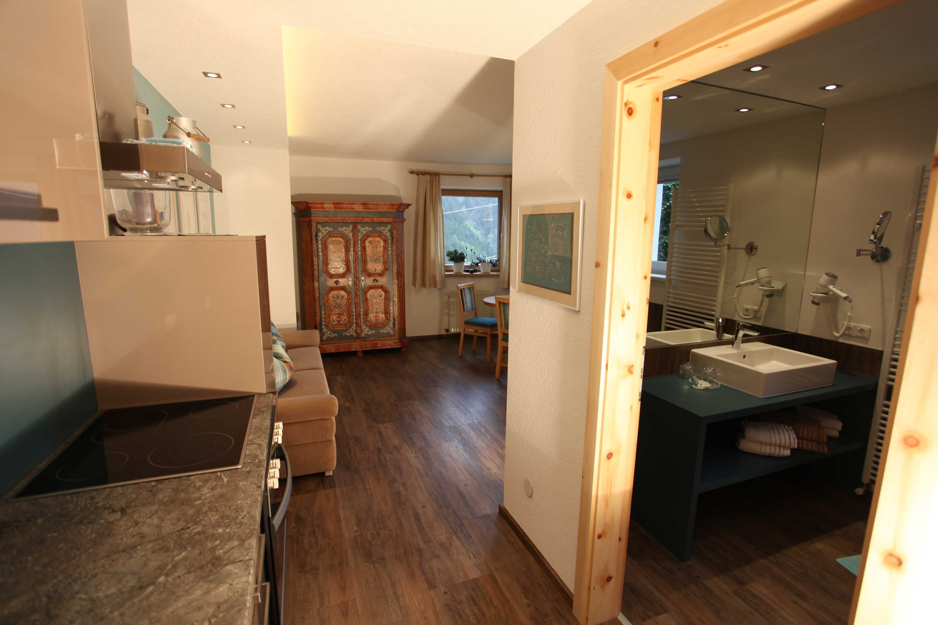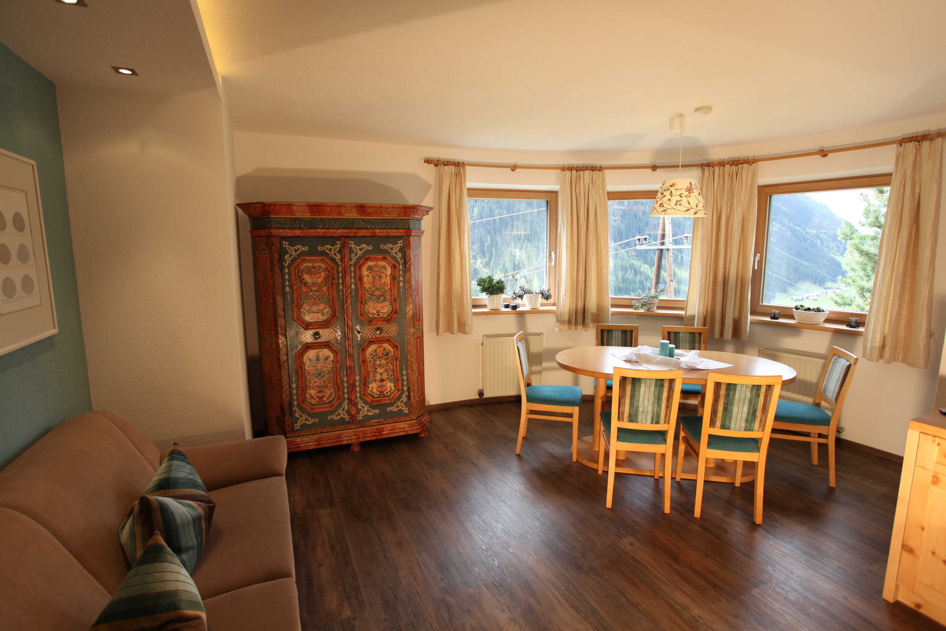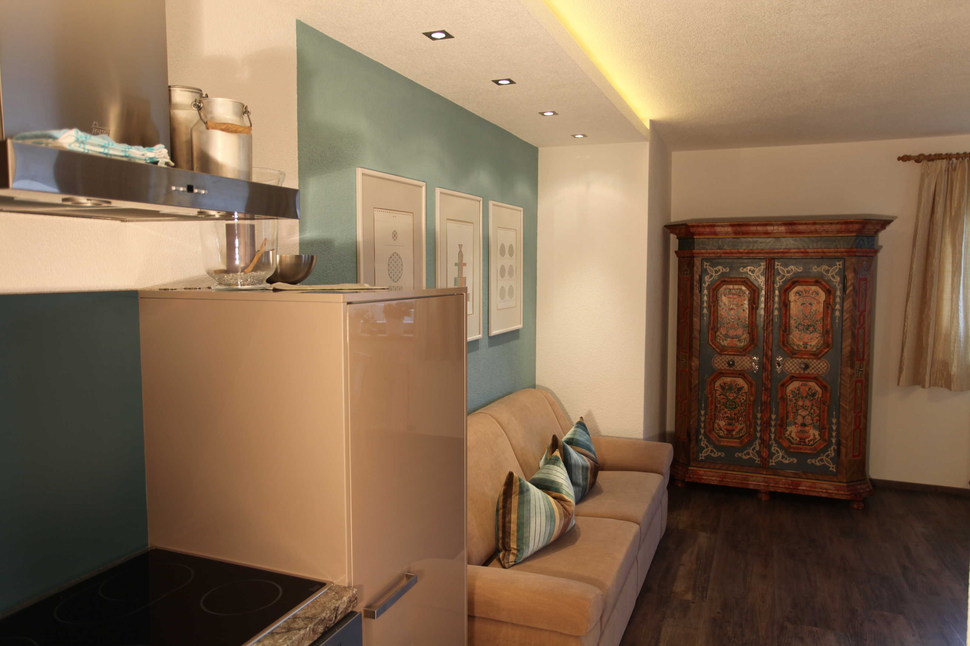 Die Ferienwohnung Gabriel, bestehend aus zwei großen Räumen, ist die schönste und komfortabelste in unserem Haus. Sie ist mit hellen Vollholzzirbenmöbeln ausgestattet. Die Ausdünstung dieses Holzes wirkt sich ja bekanntermaßen sehr positiv auf unser Wohlbefinden aus.. Der Wohn-Schlafraum hat eine große ausziehbare Doppelcouch, , eine gemütliche Essecke mit sehr großem Tisch im sonnigen Erker, einen bemalten alten Schrank,ein TV-Gerät (Sat-TV mit , Schigebiet Live-Infokanal)auf der Anrichte. Die große Küche ist mit allem ausgestattet, was man braucht. Einen 4 Plattenglaskeramikherd mit Backofen und Dunstabzug, einen großen Kühlschrank, Geschirrspülmaschine, eine Mikrowelle, Kaffeemaschine und Nespressomaschine, Wasserkocher, Toaster und reichlich Geschirr.