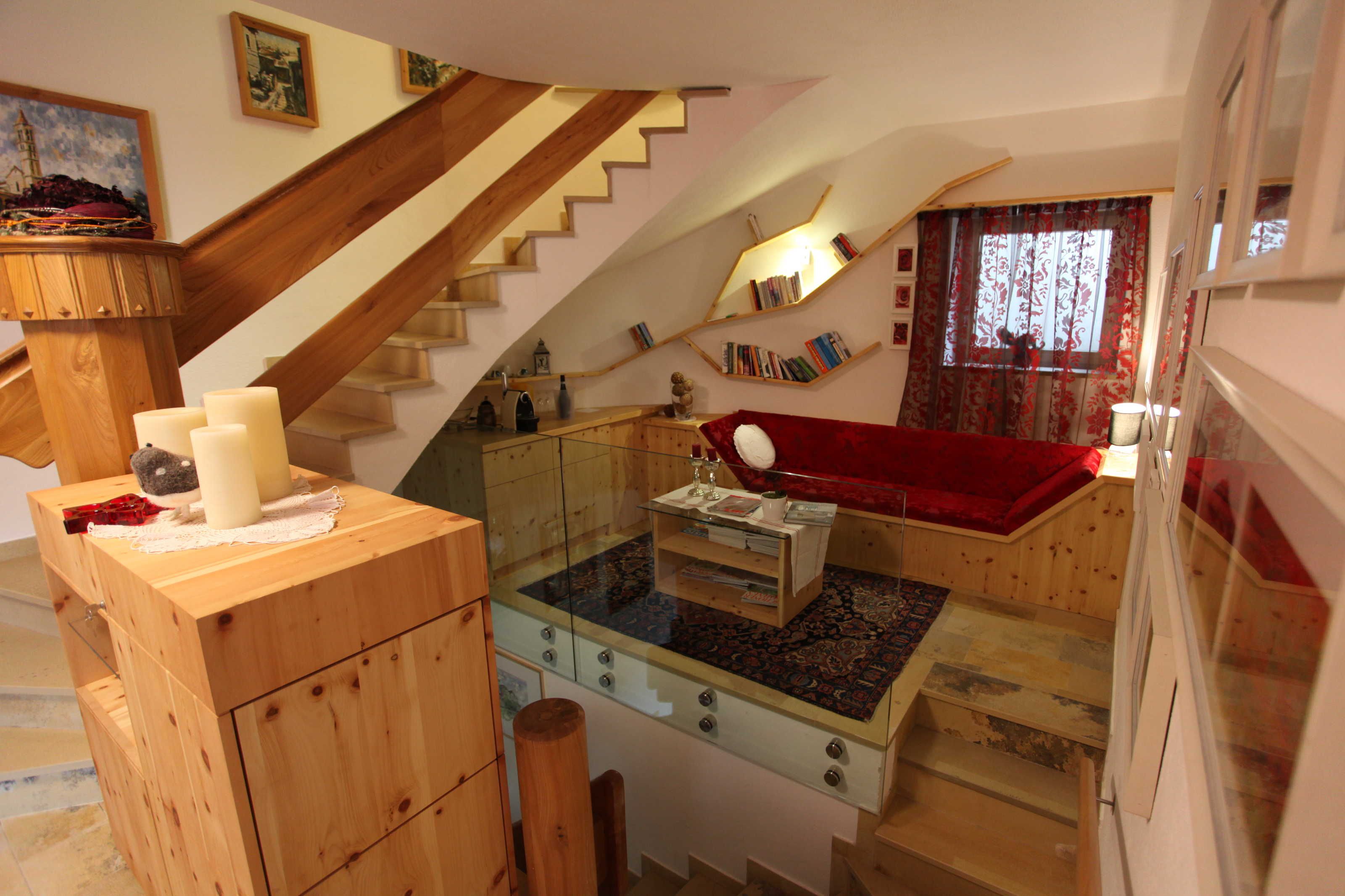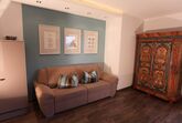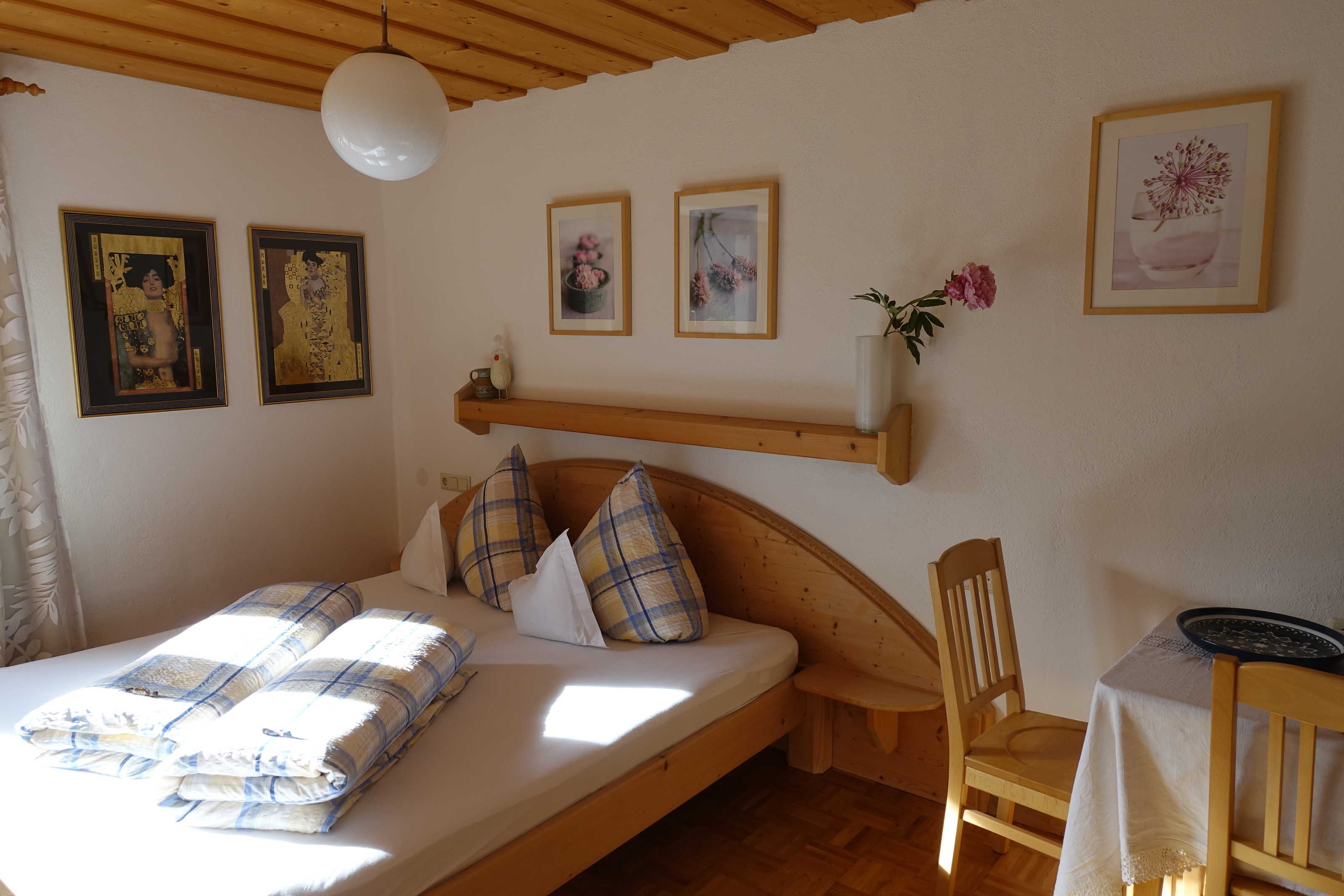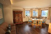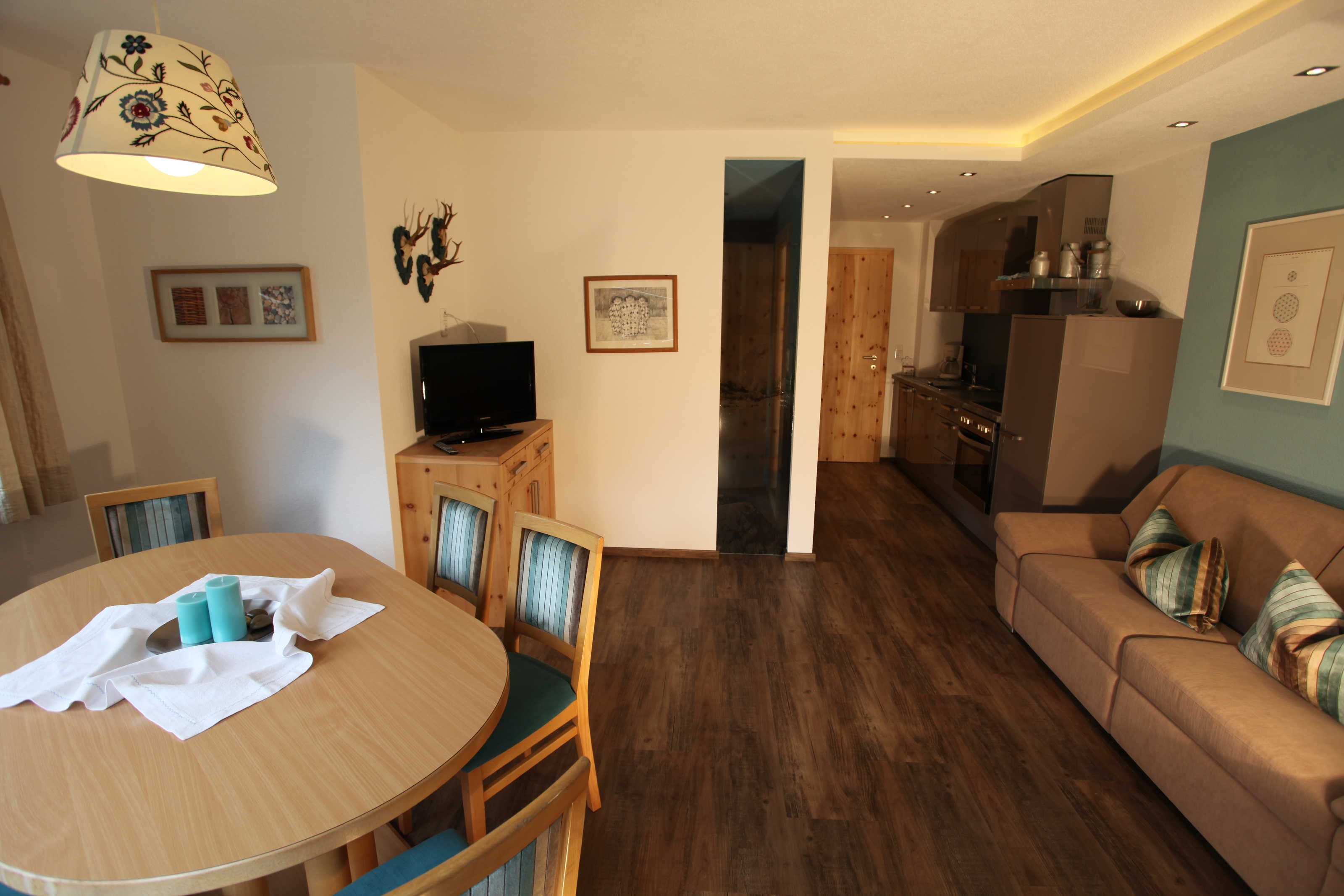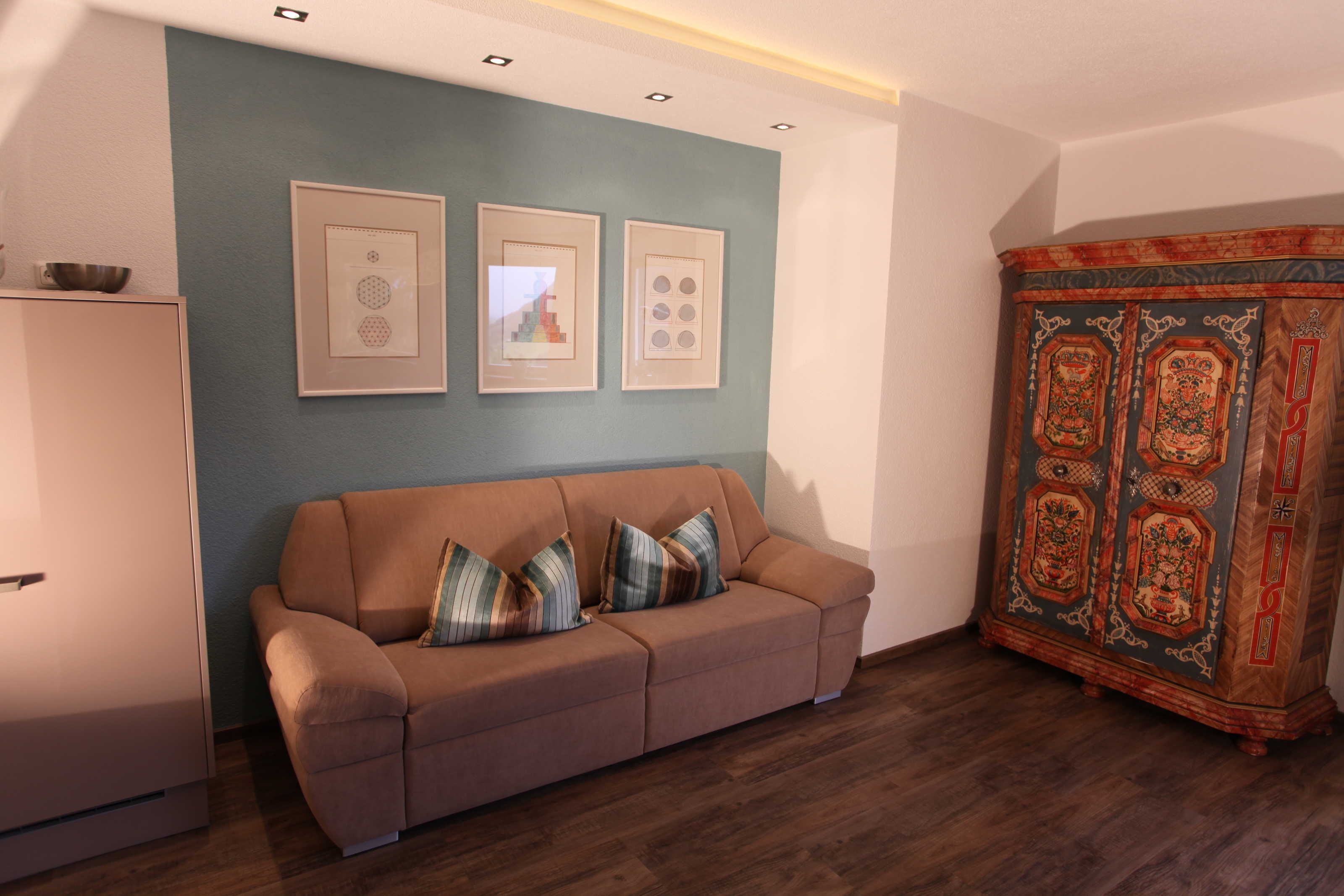 Die Ferienwohnung Gabriel, bestehend aus zwei großen Räumen, ist die schönste und komfortabelste in unserem Haus. Sie ist mit hellen Vollholzzirbenmöbeln ausgestattet. Die Ausdünstung dieses Holzes wirkt sich ja bekanntermaßen sehr positiv auf unser Wohlbefinden aus.. Der Wohn-Schlafraum hat eine große ausziehbare Doppelcouch, , eine gemütliche Essecke mit sehr großem Tisch im sonnigen Erker, einen bemalten alten Schrank,ein TV-Gerät (Sat-TV mit , Schigebiet Live-Infokanal)auf der Anrichte. Die große Küche ist mit allem ausgestattet, was man braucht. Einen 4 Plattenglaskeramikherd mit Backofen und Dunstabzug, einen großen Kühlschrank, Geschirrspülmaschine, eine Mikrowelle, Kaffeemaschine und Nespressomaschine, Wasserkocher, Toaster und reichlich Geschirr.