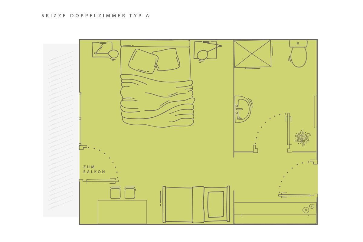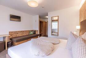 Doppelzimmer mit Zirbenholzwand. Balkon mit Bergblick.