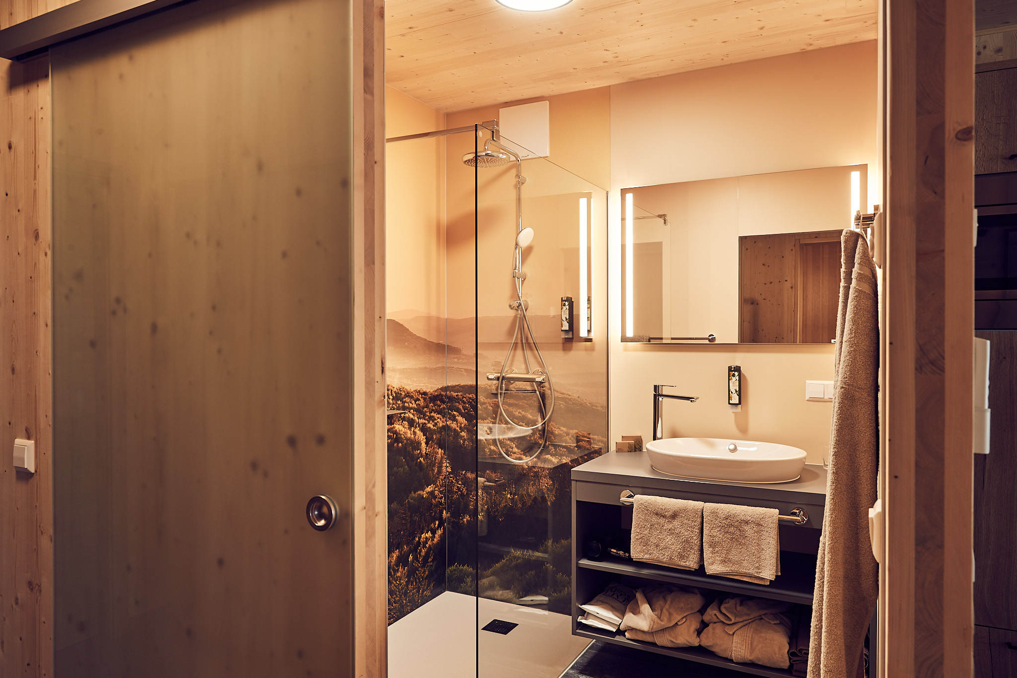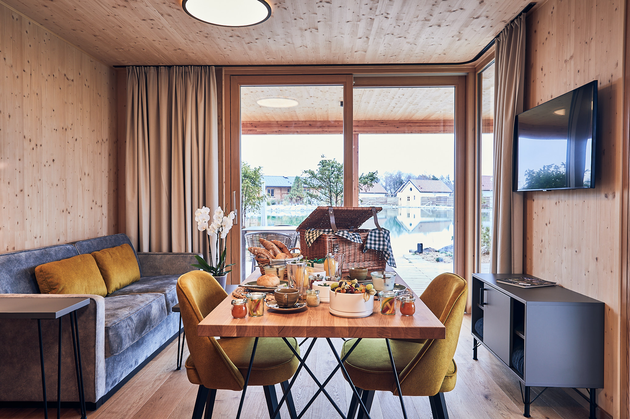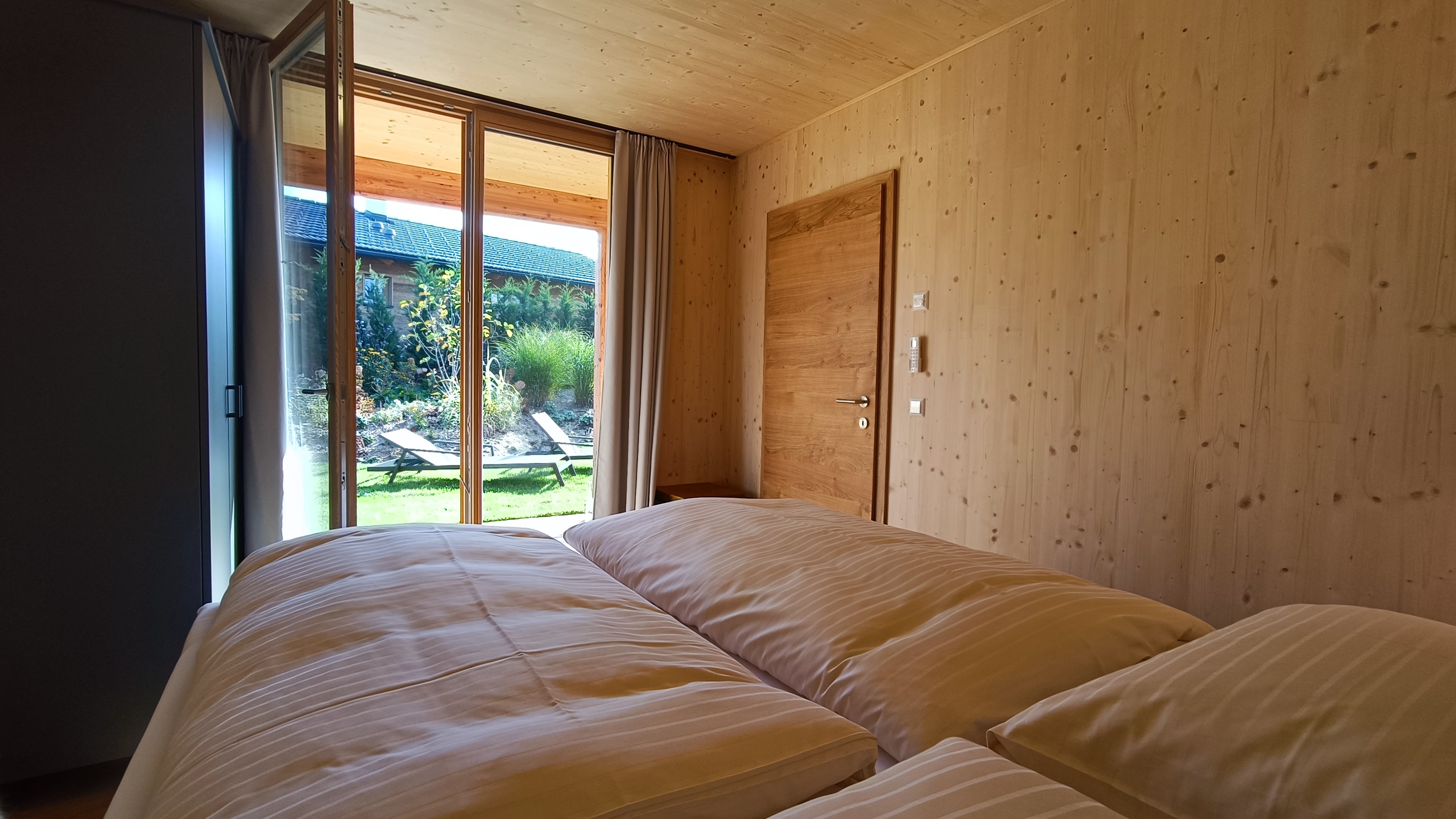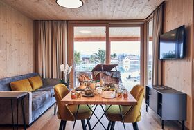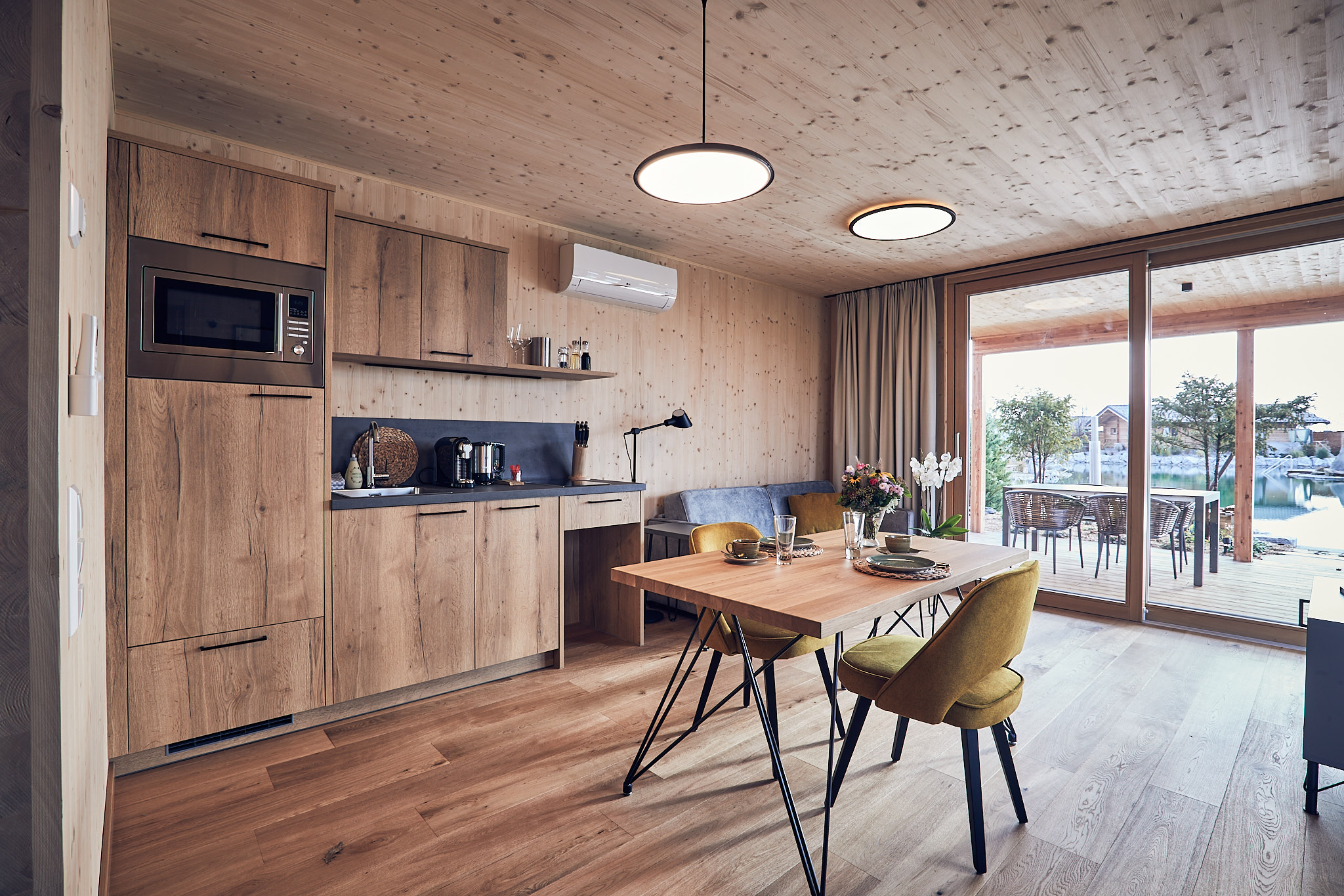Unsere Studios sind erdverbunden und modern im Design. Auch hier wurde die ökologische und nachhaltige Holzriegelbauweise eingesetzt, welche ein besonders angenehmes Raumklima bietet. Das moderne Design des Hauses findet sich auch im Interieur wieder. Die Studios sind 40 m² groß, mit Klima-Anlage ausgestattet und verfügen über einen gemütlichen Wohnbereich mit 43 Zoll TV, ein Schlafzimmer mit Doppelbett, sowie ein Bad mit Regendusche und getrennter Toilette. In den Studios steht Ihnen eine Küche mit 2 flammigen Herd, Mikrowelle mit Heißluft und Grillfunktion, Kühlschrank samt Gefrierfach, Geschirrspüler, Kaffeemaschine, Wasserkocher, hochwertigem Geschirr, Weingläsern ausgestattet zur Verfügung. Von der Terrasse mit Tischgrill überblicken Sie den ganzen Gartensee und genießen Sie den Weitblick bis zum Ötscher. Der private Themengarten ist verträumt, romantisch und sehr harmonisch gestaltet, und bietet entweder eine Sauna oder eine Feuerwasserwanne unter freiem Himmel - genau das richtige um Zeit zu zweit zu genießen.