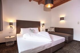 Drei Schlafzimmer mit Doppelbett, zweimal mit Schlafcouch. Zwei Bäder, einmal mit Dusche und einmal mit Badewanne. Küche mit Sitzecke.