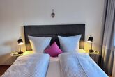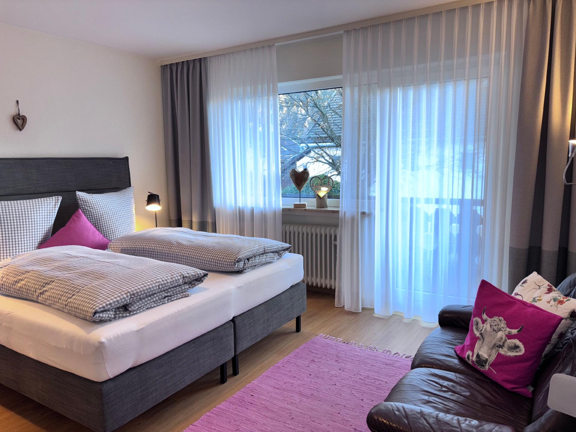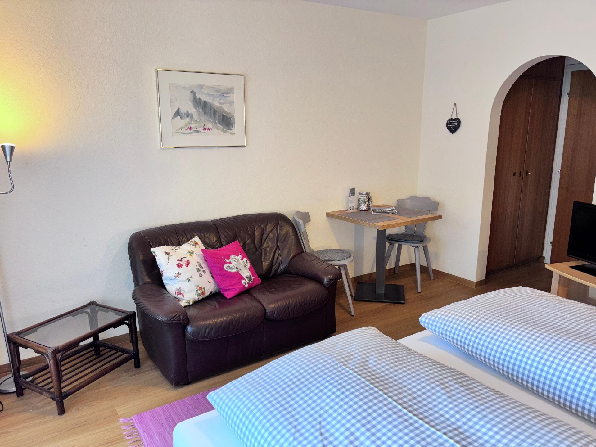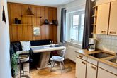 Die Wohnung liegt im 1. Stock eines familiengeführten Hauses und ist liebevoll eingerichtet: ein heller Wohn-Schlafbereich mit bequemen Boxspringbett, kleine Couch, extra Sitzgelegenheit, SAT-TV & WLAN und eine separate Wohnküche mit gut ausgestatteter Küchenzeile (2-Platten-Ceranfeld, Filterkaffeemaschine, Toaster, Wasserkocher) mit gemütlicher Essecke sowie ein Bad mit Dusche, WC und Föhn.