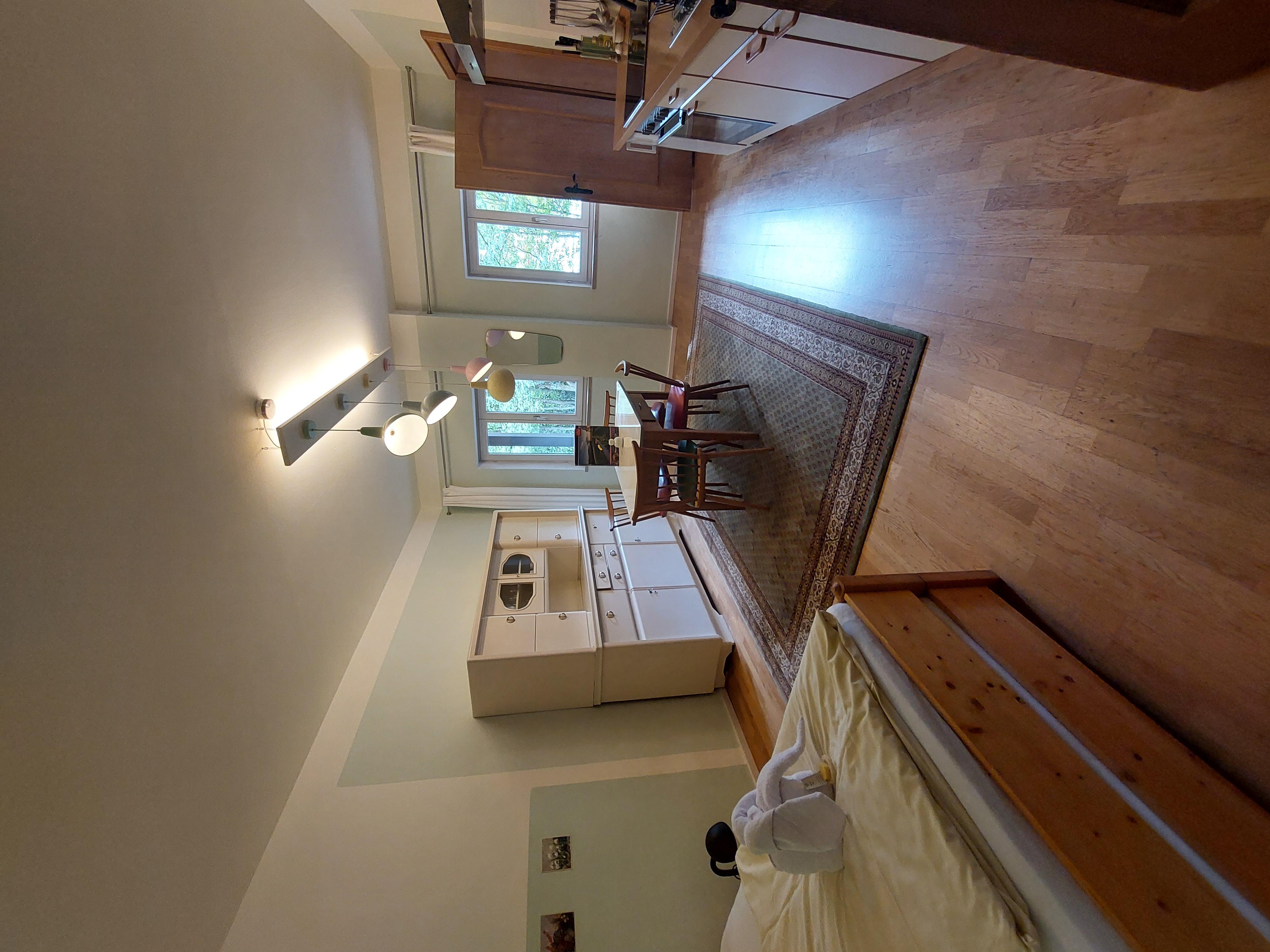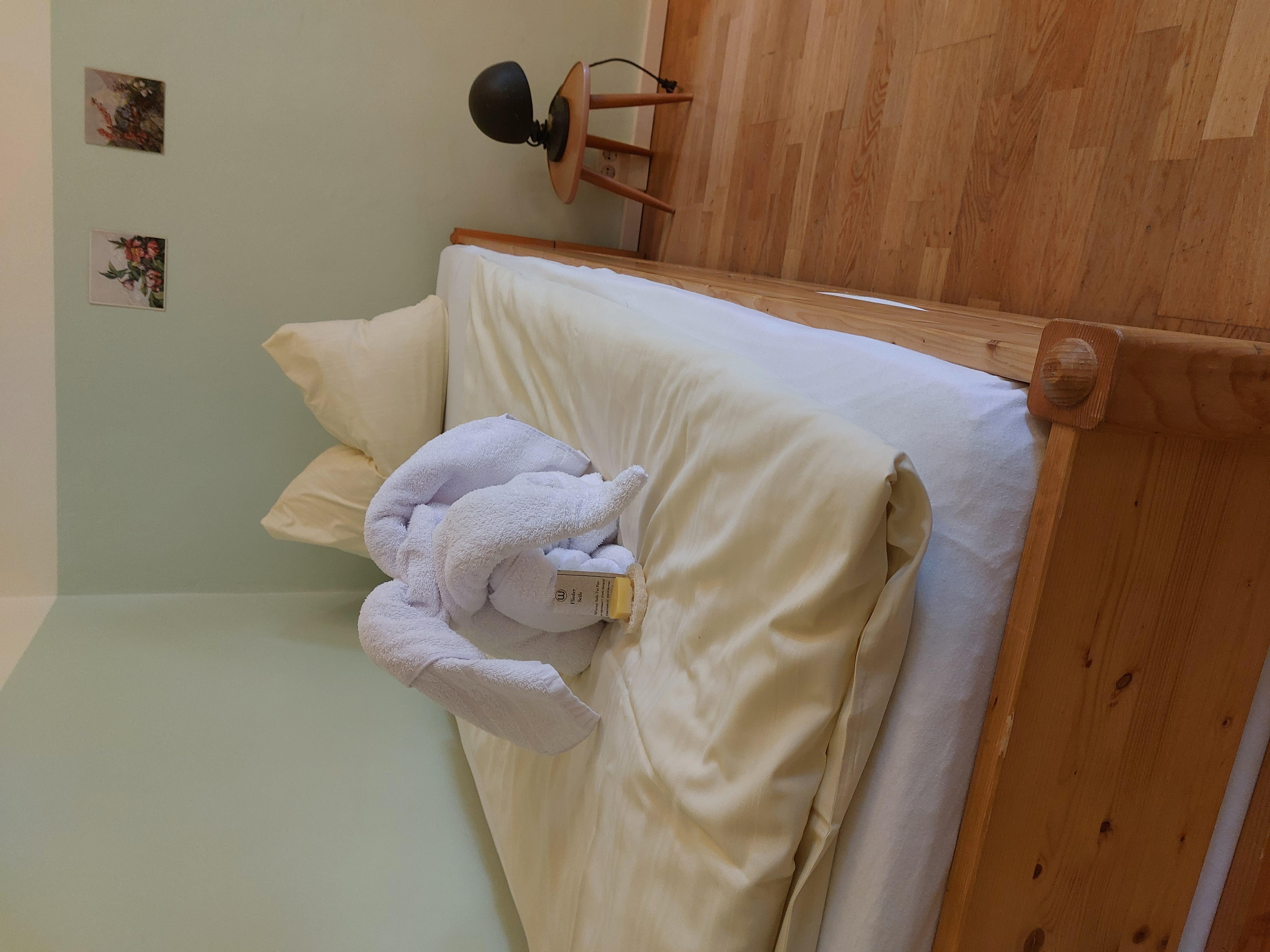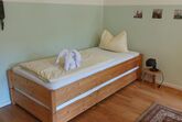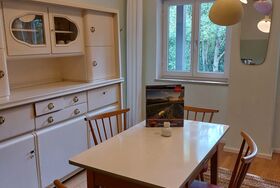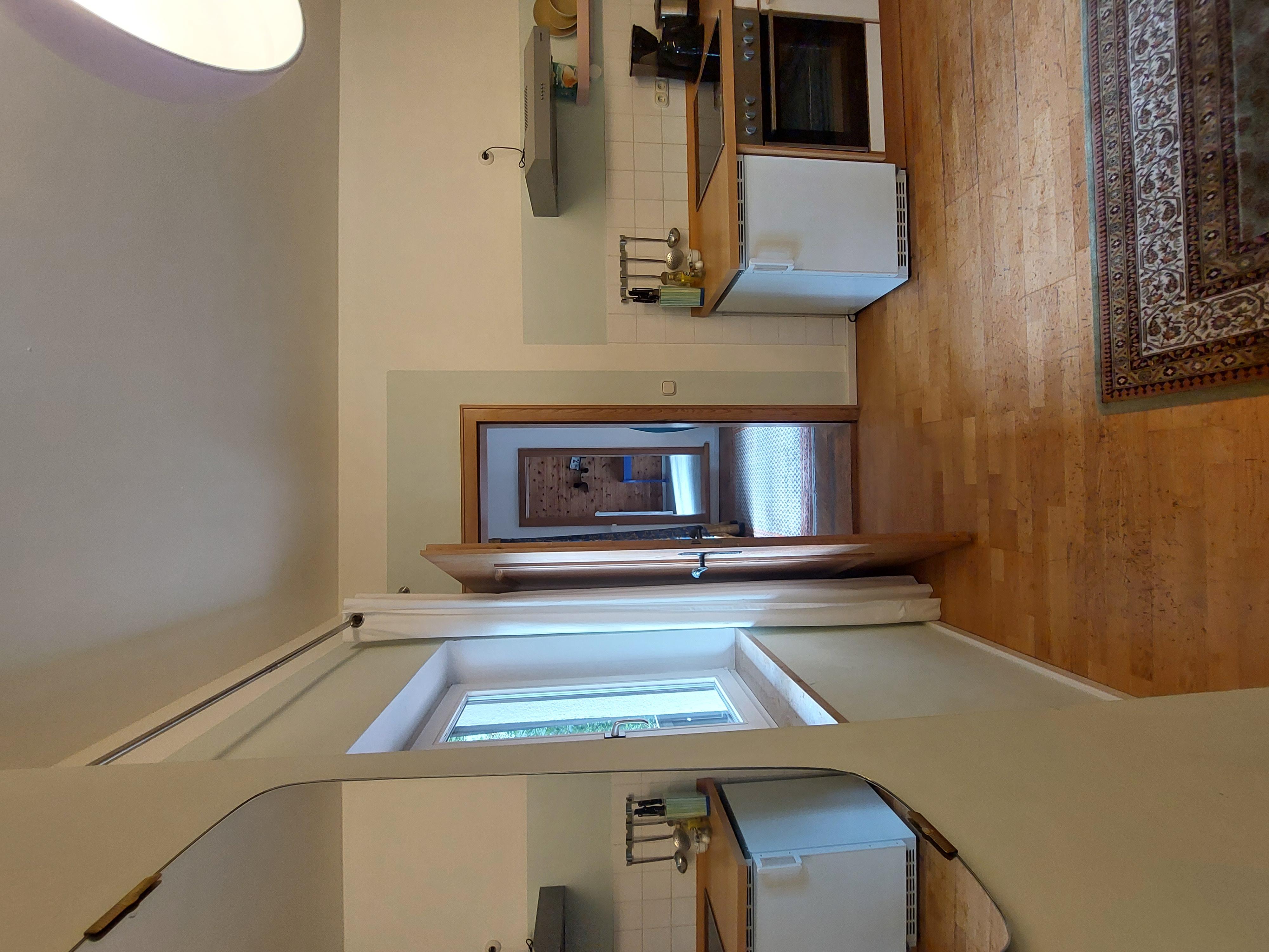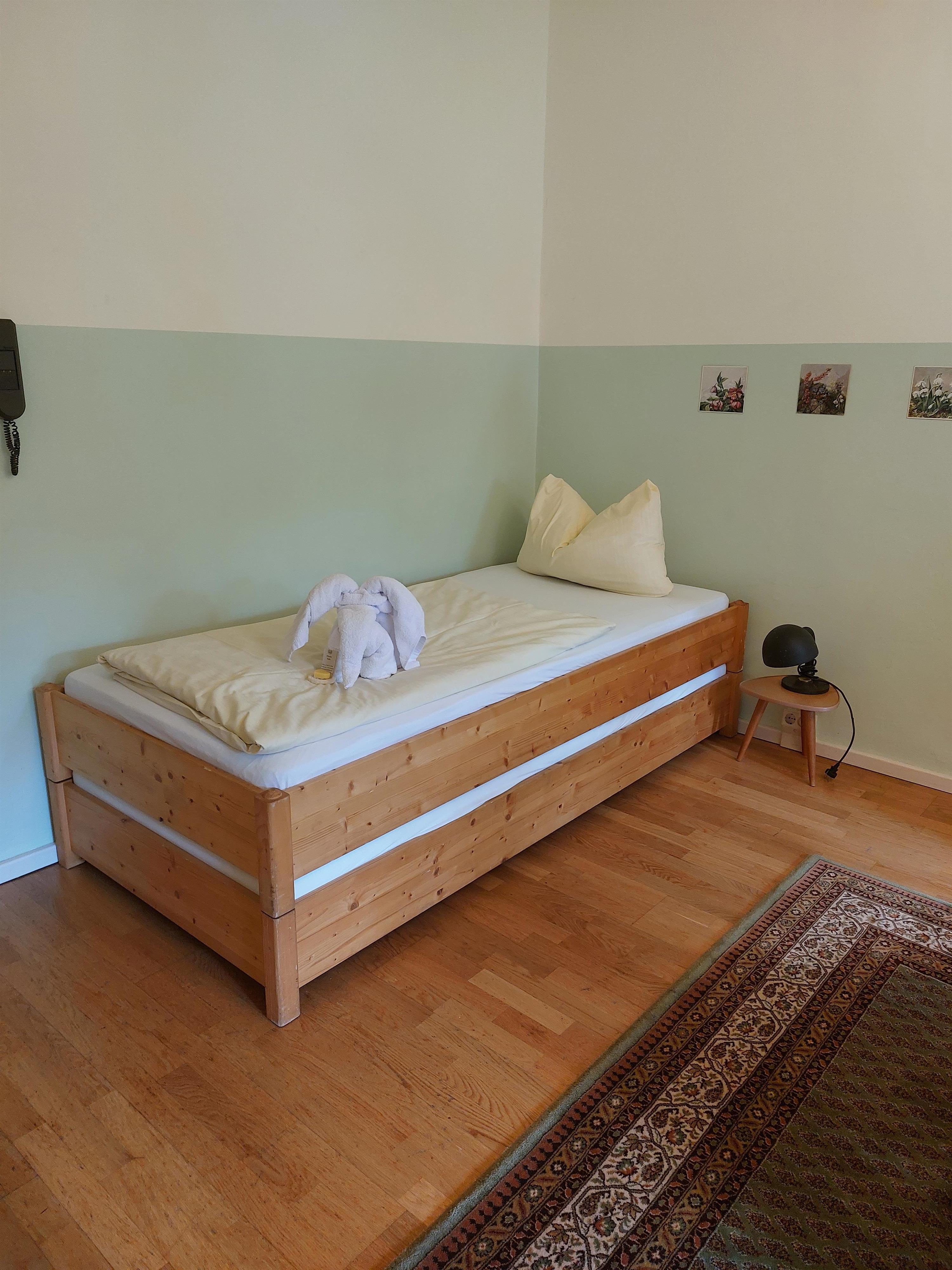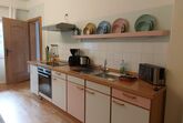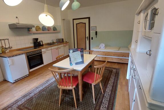 Die Ferienwohnung verfügt über 1 Schlafzimmer, Bad und ein Multifunktionszimmer. In diesem großzügigen Raum ist Küche und Wohnbereich sowie zwei Einzelbetten integriert. Der Zugang zum Balkon befindet sich über das Bad und Schlafzimmer. Die Einrichtung ist einfach und funktionstüchtig. Die Gäste können die Räumlichkeiten im Erdgeschoss (Gastraum und Weinstube) nutzen.