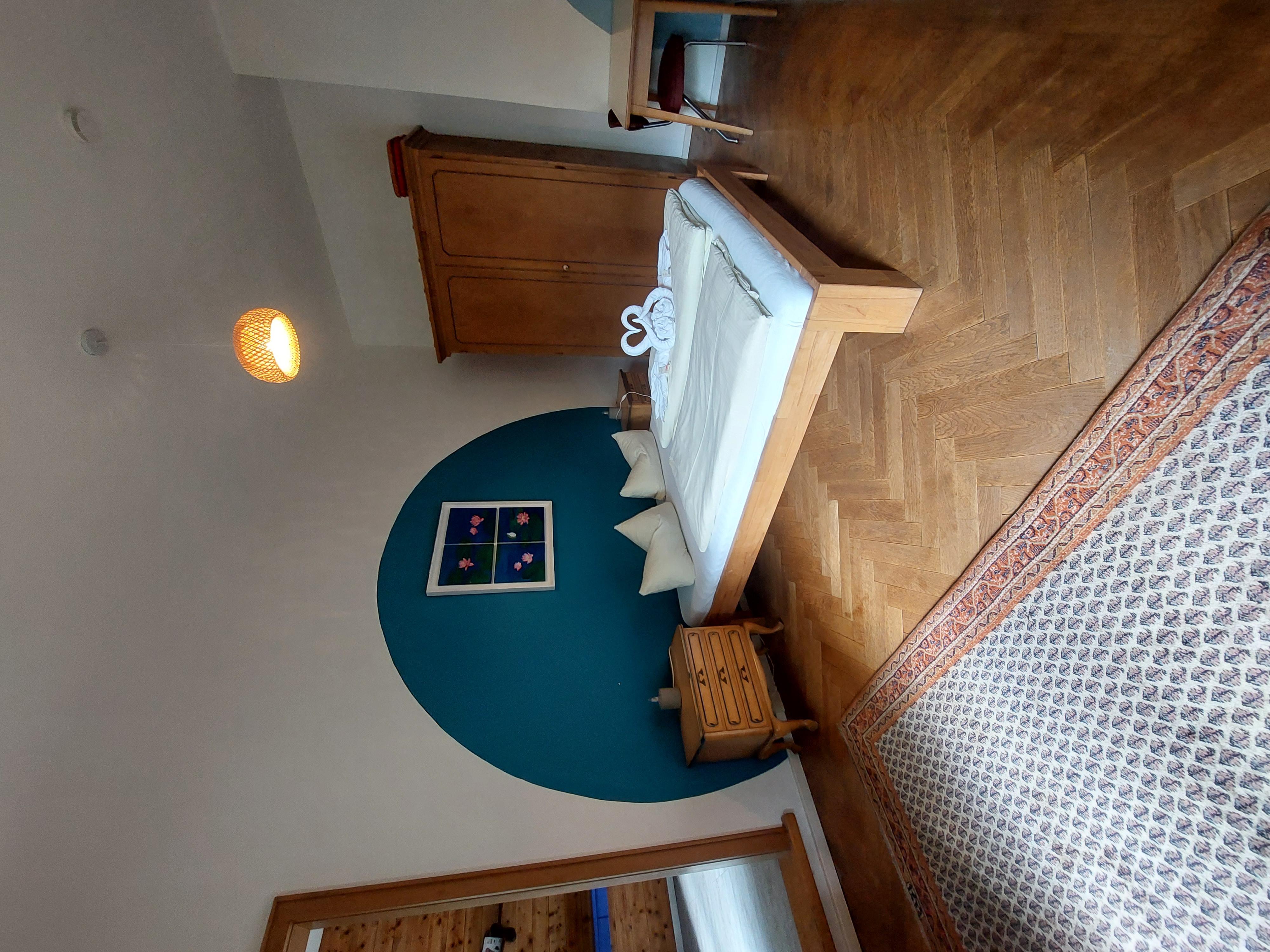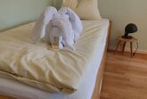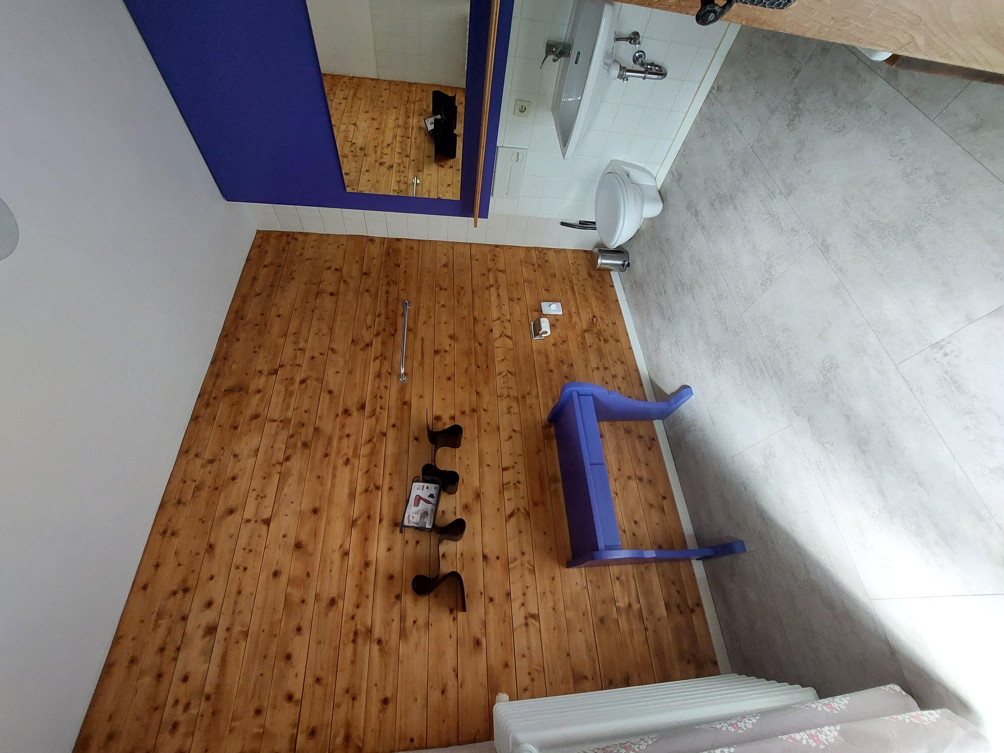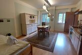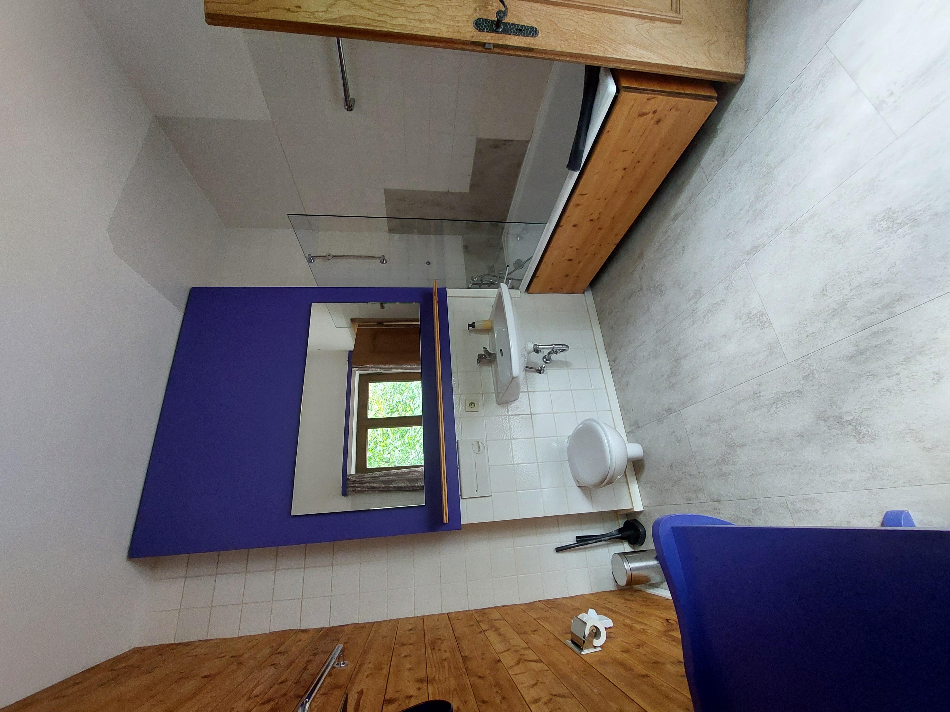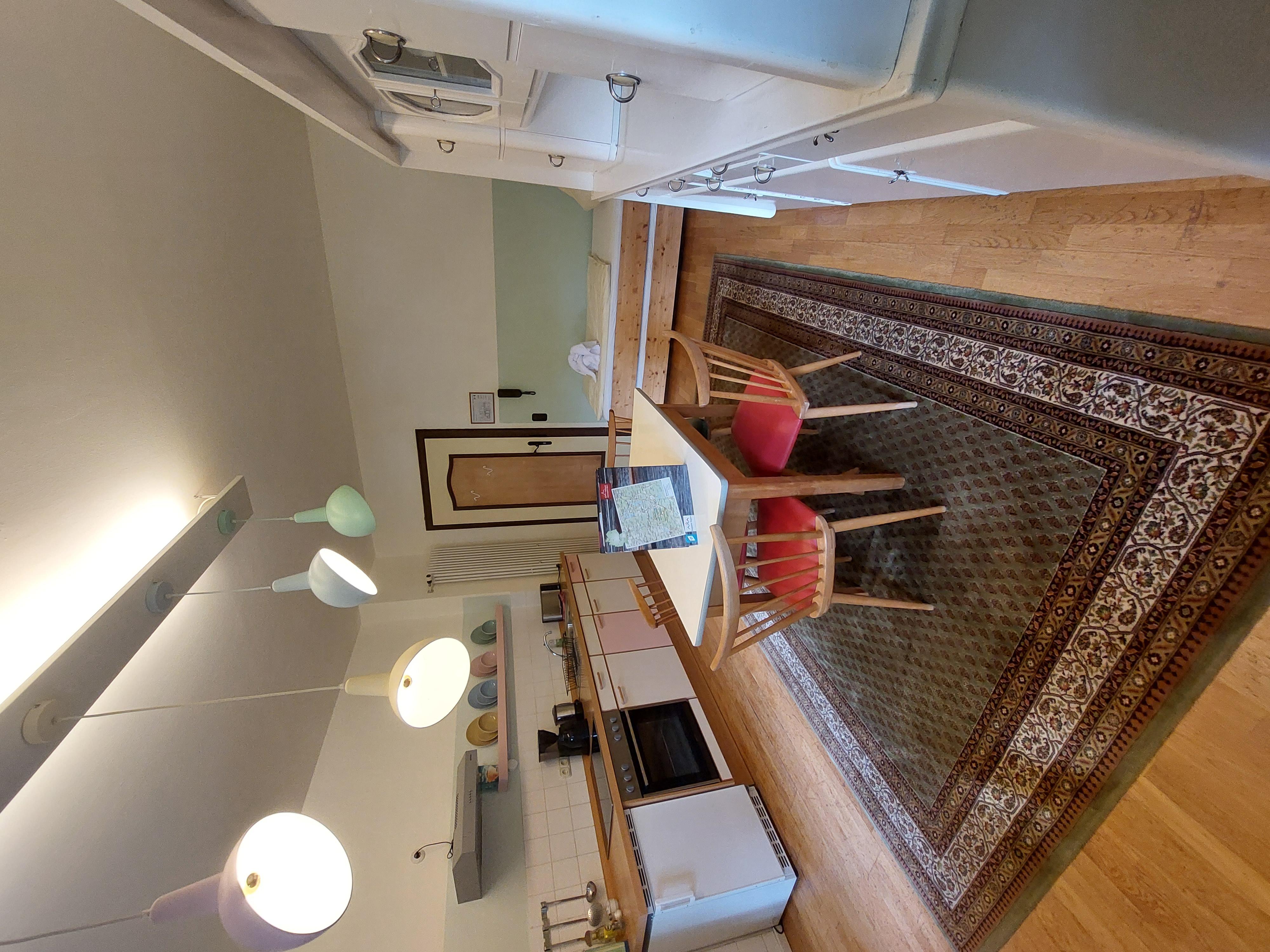 Die Ferienwohnung verfügt über 1 Schlafzimmer, Bad und ein Multifunktionszimmer. In diesem großzügigen Raum ist Küche und Wohnbereich sowie zwei Einzelbetten integriert. Der Zugang zum Balkon befindet sich über das Bad und Schlafzimmer. Die Einrichtung ist einfach und funktionstüchtig. Die Gäste können die Räumlichkeiten im Erdgeschoss (Gastraum und Weinstube) nutzen.
