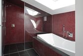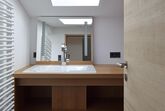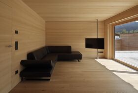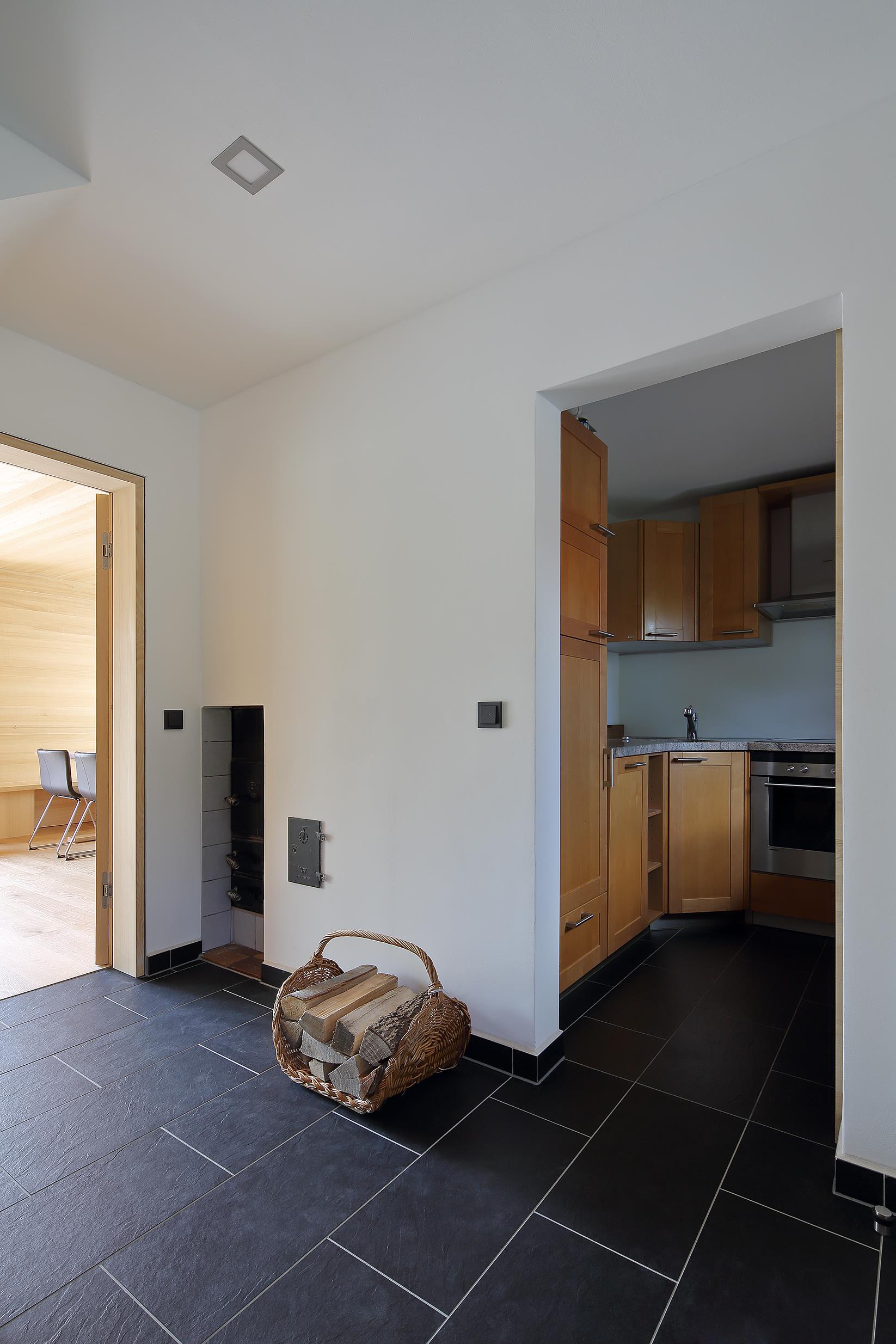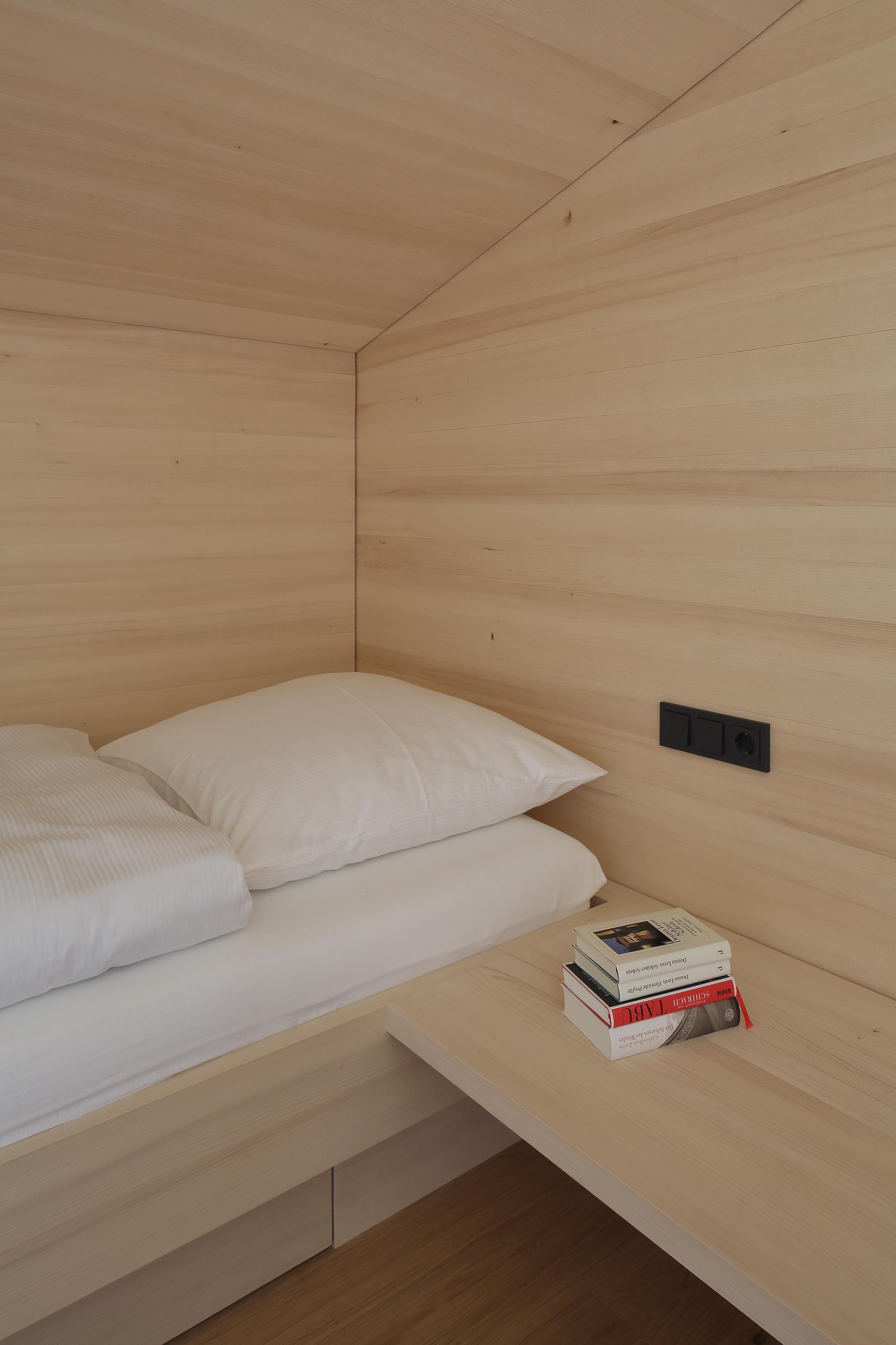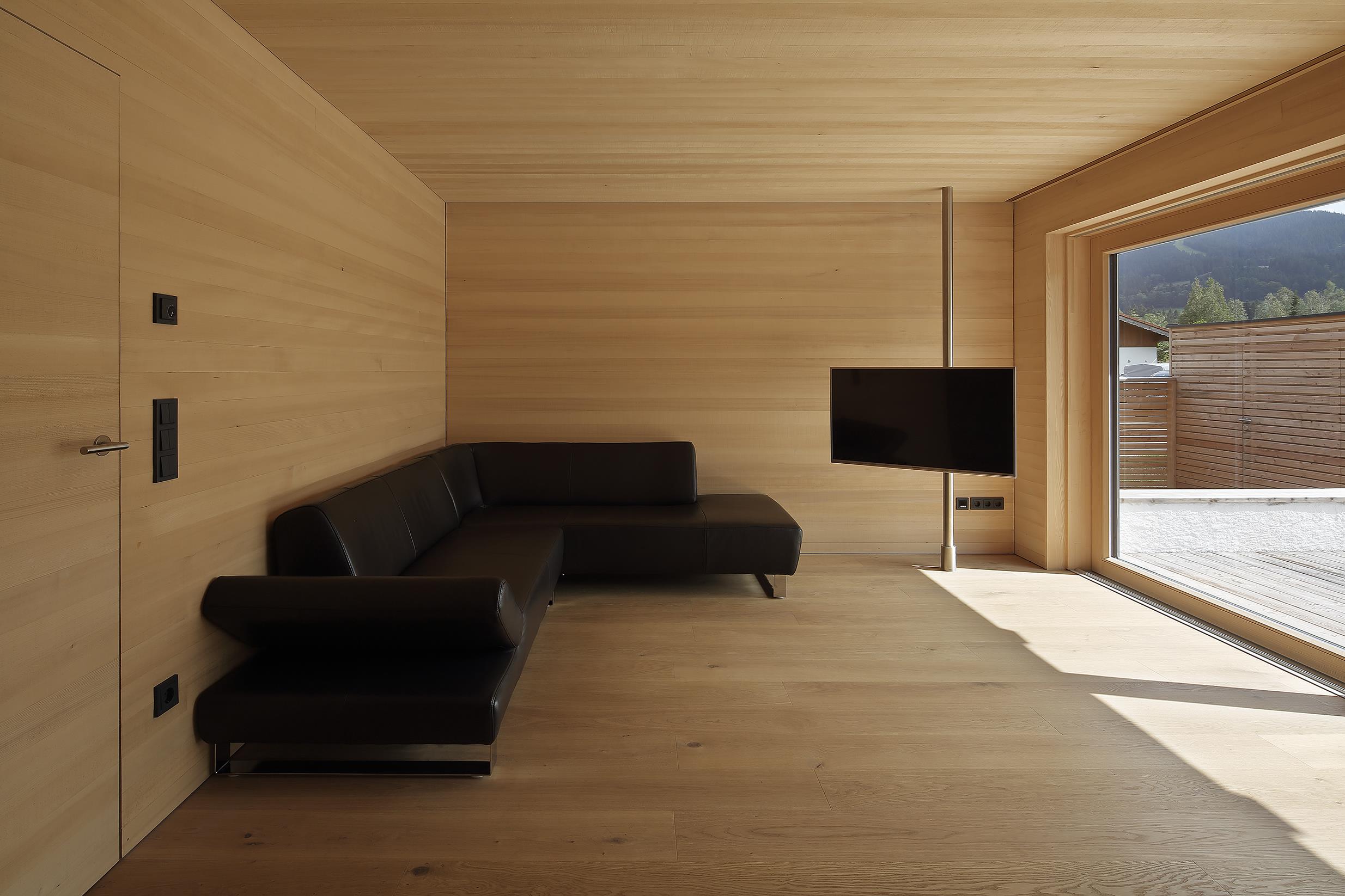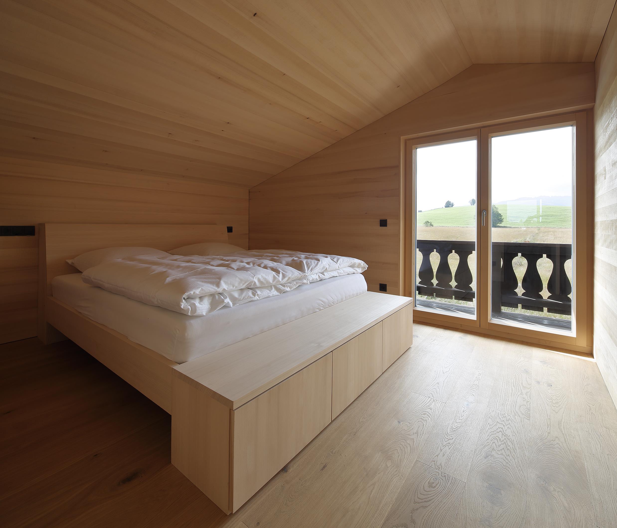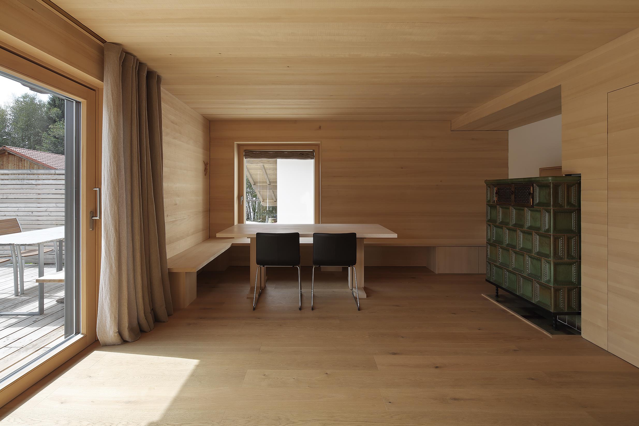 Bis auf den Kachelofen, der im Essbereich als Blickfang dient, erinnert im Ferienhaus holz[t]raum nichts mehr an den einstigen Bau aus den 1970er Jahren. Alle Wohnräume wurden komplett mit Weißtanne ausgekleidet, die Eichenböden stammen aus der Region. Unter ihnen verbirgt sich eine moderne Fußbodenheizung.