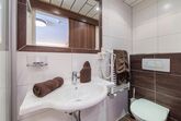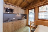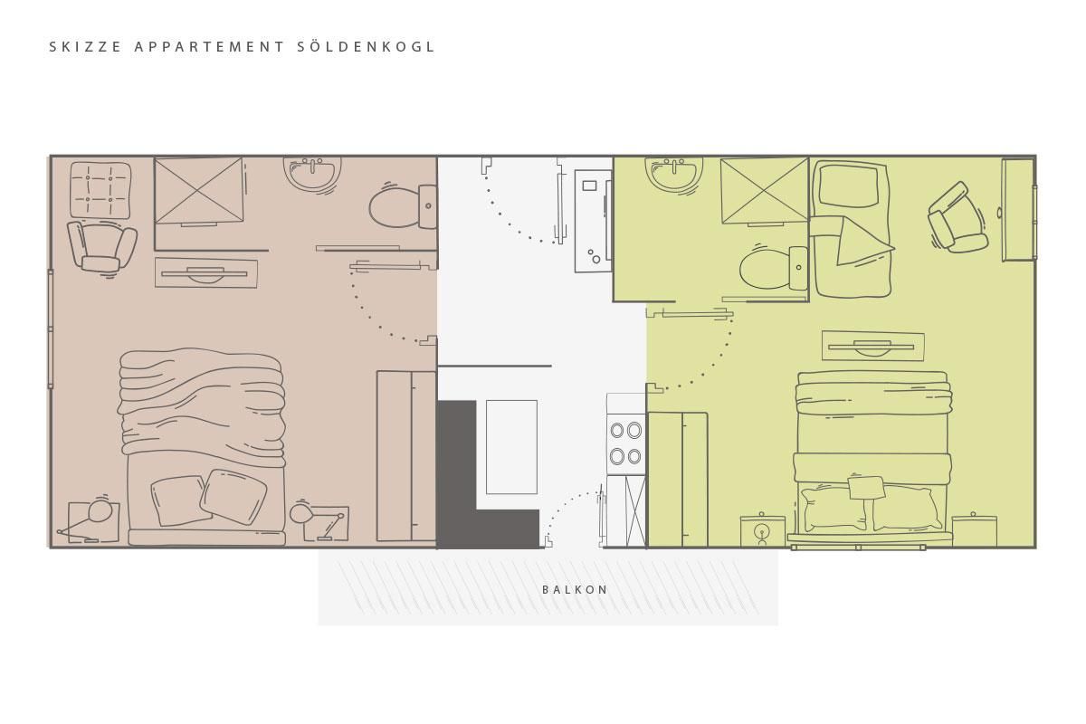 Apartment mit Balkon und Blick zum Söldenkogl. Zwei Schlafzimmer mit Doppelbett und einmal mit Schlafcouch, zwei Bäder mit Dusche, Küche mit Sitzecke.