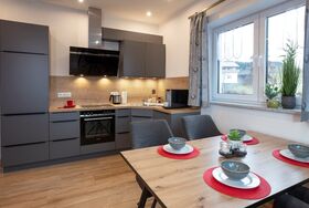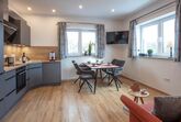 Eine komplett ausgestattete Küche mit Kaffeevollautomat lässt Sie gut in den Tag starten. Ein Balkon ist mit Stühlen und Tisch ausgestattet.