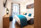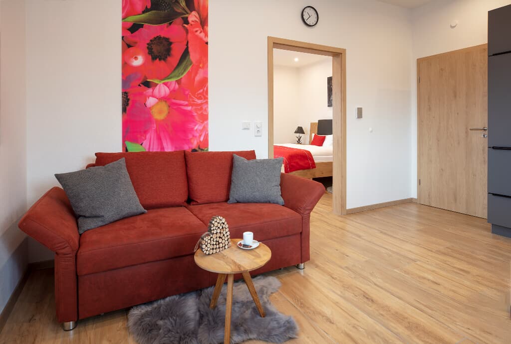 Zwei getrennte Schlafzimmer, ein Badezimmer und eine Wohnküche mit Couch ist vorhanden.