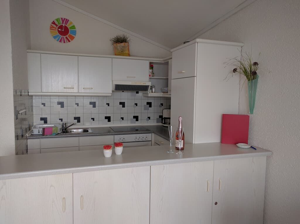 An den Essbereich schließt sich die offene Küche an. Sie ist komplett ausgestattet; mit Backofen, Cerankochfeld, Kühlschrank, Kaffeemaschine, Wasserkocher und Toaster. Auch Geschirrtücher und Spülmittel sind vorhanden, ebenso Fön und Staubsauger,