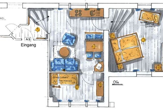 Die Wohnung III (60m²) liegt im 1. Stock und hat einen herrlichen Blick in unseren historischen Innenhof und auf den Obstgarten. Sie hat ein Schlafzimmer mit Doppelbett und Einzellbett, die Lattenroste sind im Kopfteil höhenverstellbar, ein Kinderzimmer mit Etagenbett, ein Wohnzimmer, Küchenzeile, Dusche / WC mit Fenster.