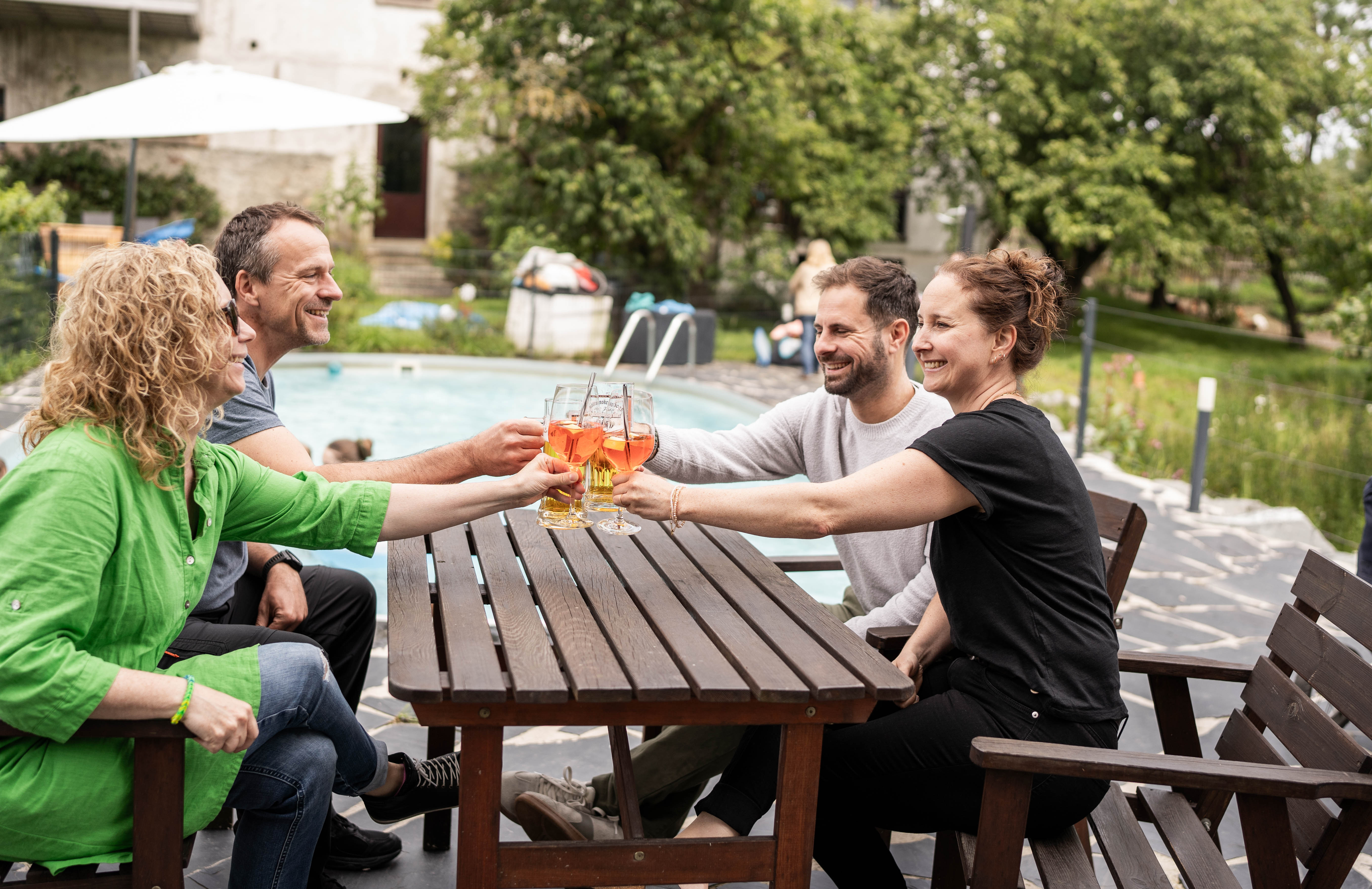 Der historische Innenhof mit den großen Bäumen und dem alten Brunnen, aus dem seit 1799 frisches Quellwasser sprudelt, hat mediterranen Flair und ist der ideale Platz zum Genießen, Entspannen, Frühstücken oder für ein Gläschen Bier / Wein am Abend.