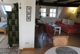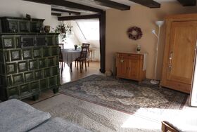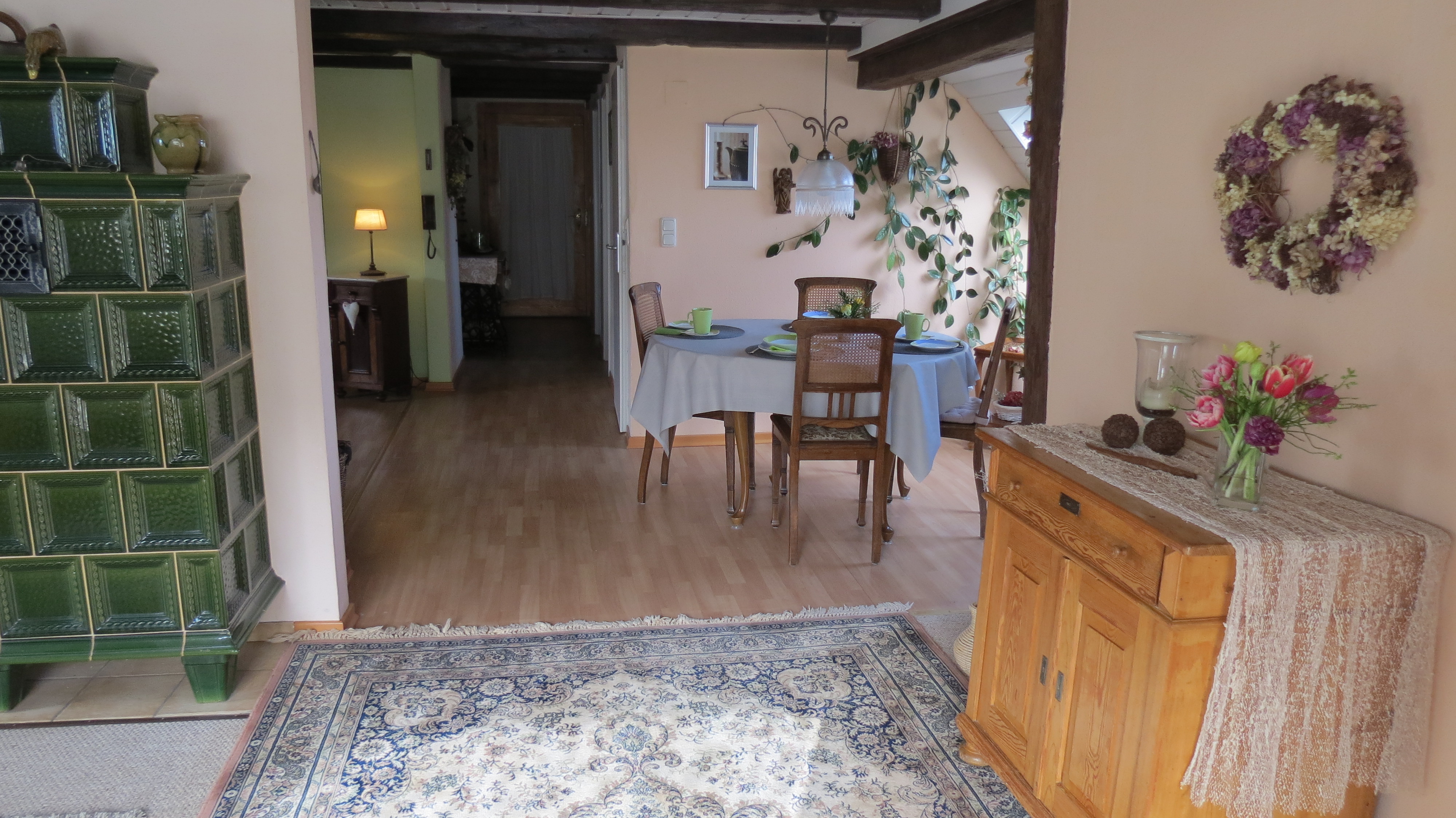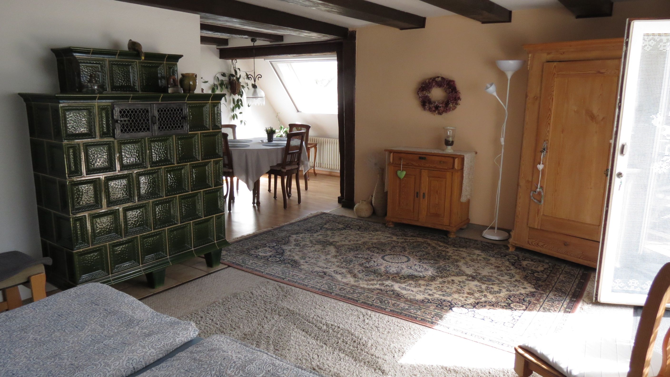 Der große Raum besticht durch die gemütliche Gestaltung mit offenen rustikalen Deckenbalken und einem großen Kachelofen. Der Wohnzimmerbereich hat eine Polsterecke, Essecke und Sat-TV, DVD-Player. Die Schlafecke verfügt über ein Doppelbett. Der Zugang der Ferienwohnung befindet sich im Eingangsbereich über eine 30qm großer Balkonterrasse.
