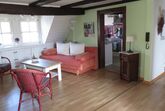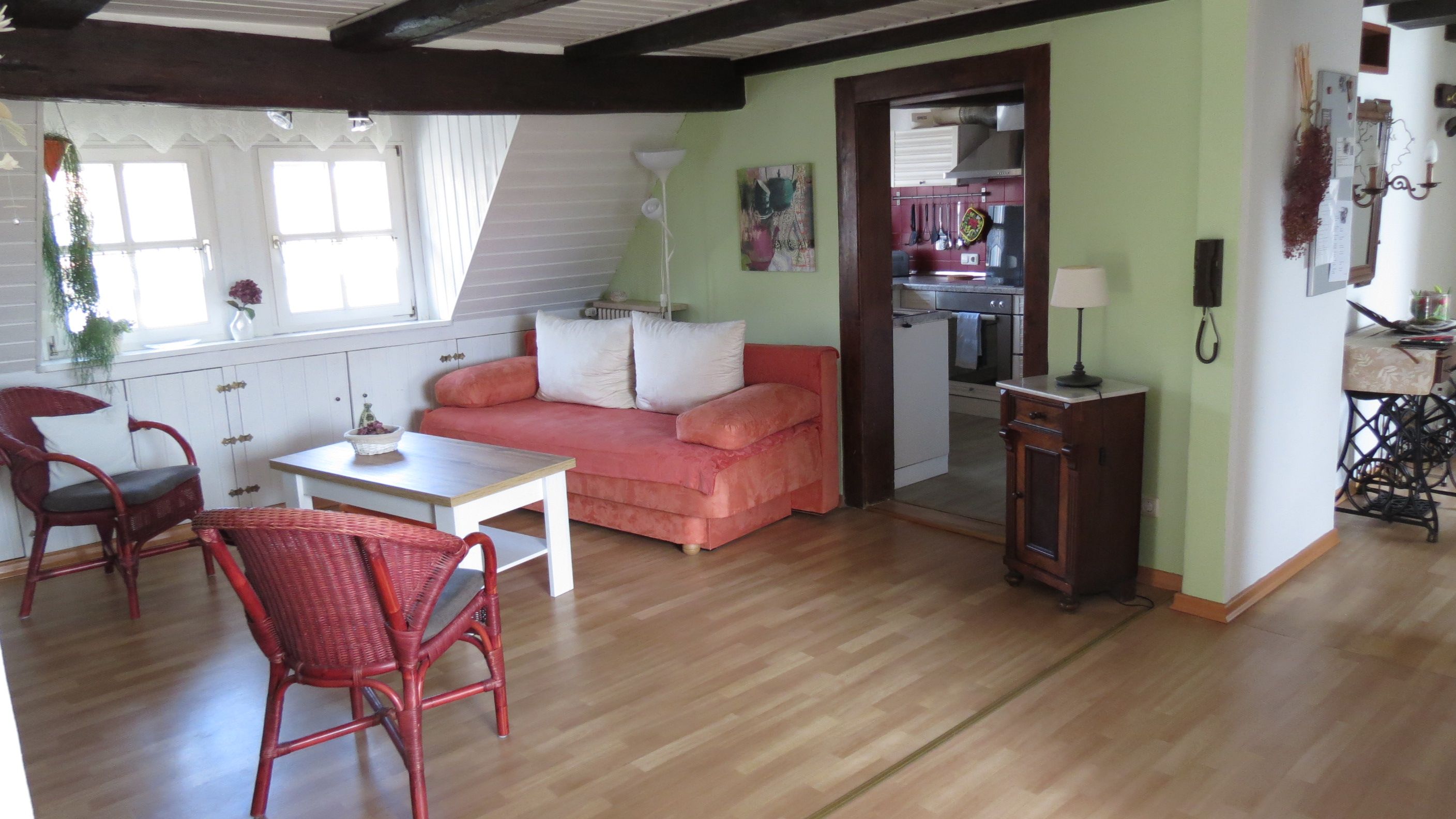 Die ca. 65 qm Ferienwohnung, separatem Eingang über eine Außentreppe, im Dachgeschoss eines alten Bauernhauses. Mit großem Wohnraum - offener Bauweise - mit Doppelbett, Essecke und Wohnzimmerbereich und Küche. Ein kleines Zimmer separat.