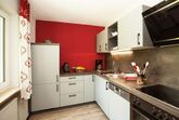 1 Wohnzimmer und 1 Badezimmer mit Dusche und Badewanne/ WC. Die Küche hat einen Herd mit Backofen, eine Spülmaschine,
