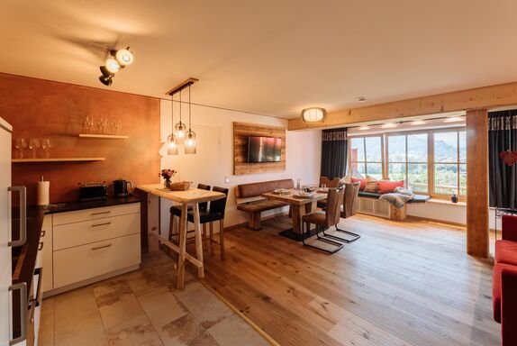 • Wohn-/Essbereich mit Panoramafenster Richtung Pfrontener Tal