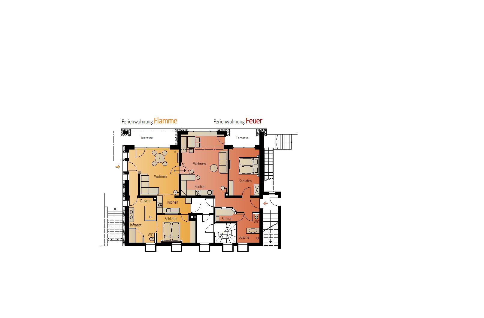 Gerne können die Wohnungen FEUER und FLAMME auch gemeinsam genutzt werden. Durch eine schalldichte Verbindungstüre können Sie in die anliegende Wohnung gelangen und Zeit gemeinsam verbringen.