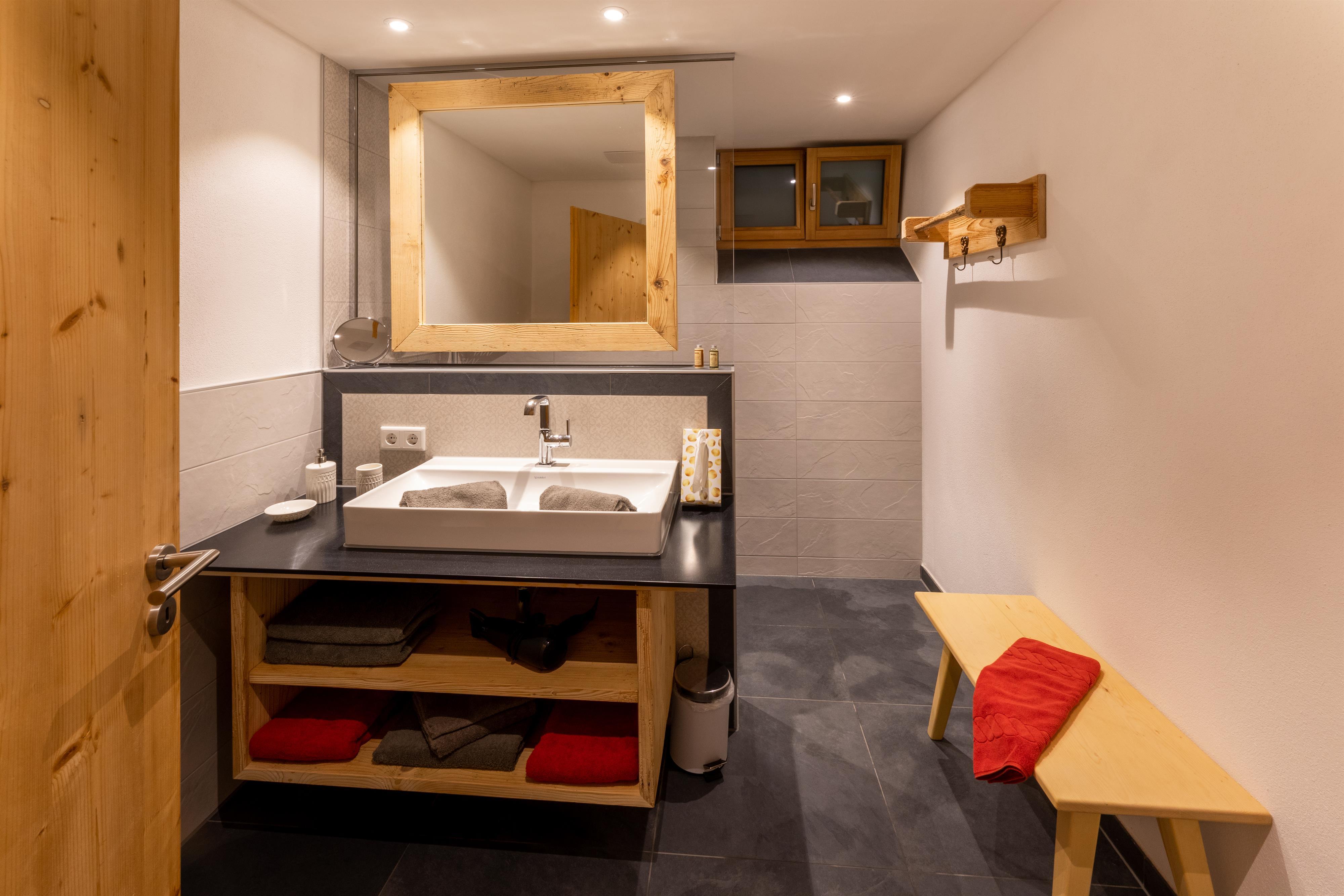 • Badezimmer mit Regendusche, WC, Föhn, Hand- und Duschtücher, Toilettenartikeln
