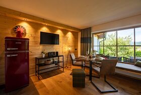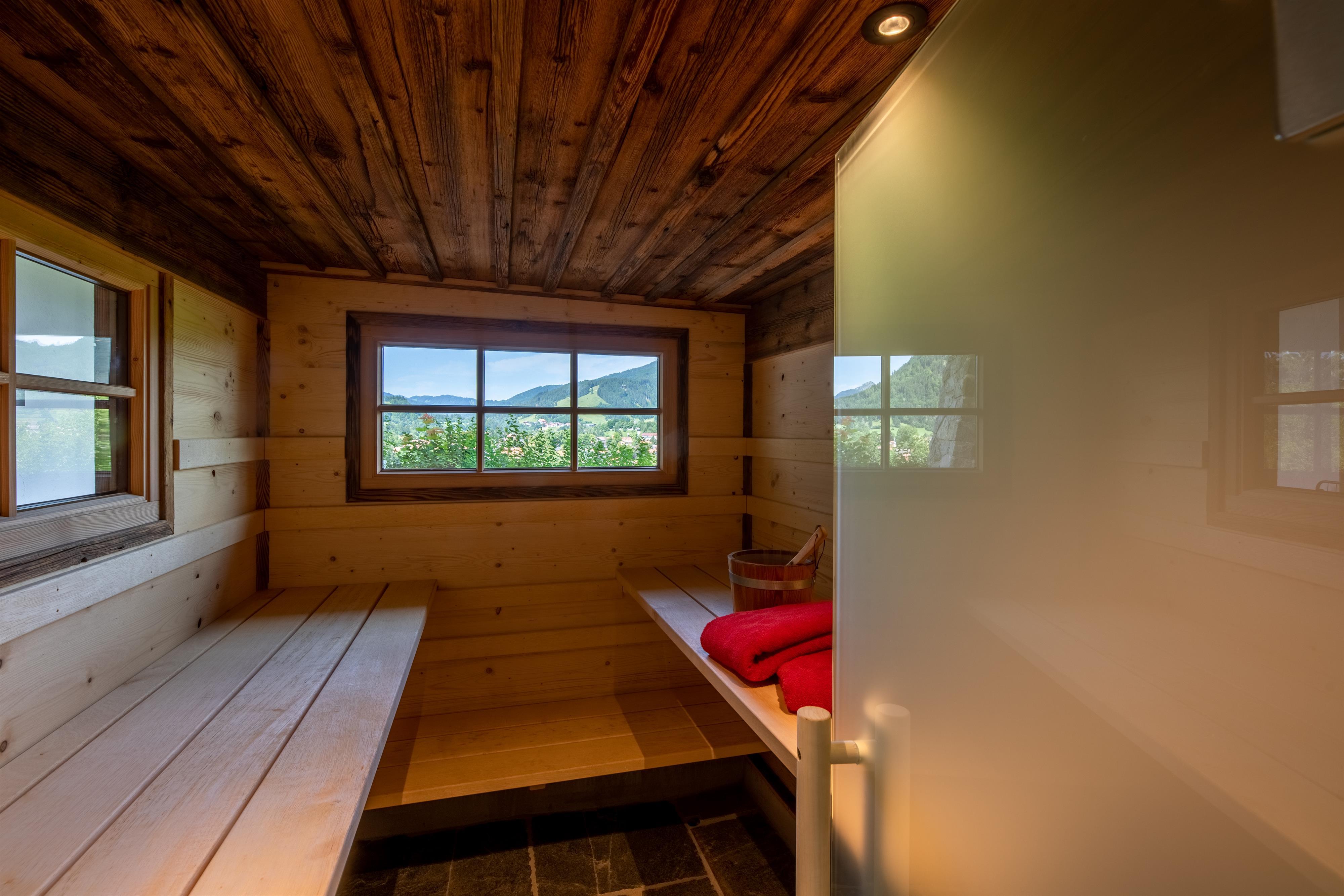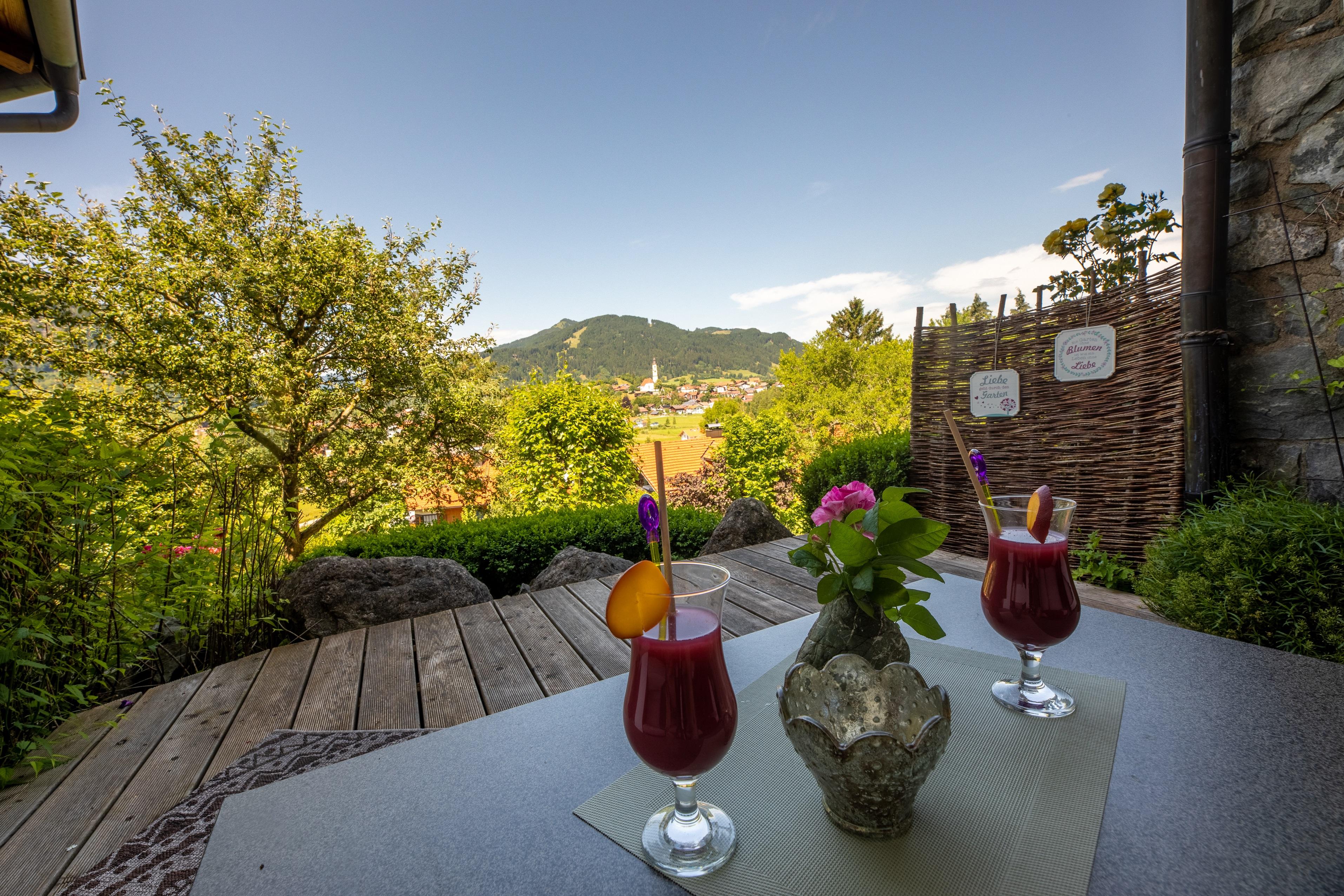 Terrasse mit eigener Sauna, Zugang zur Liegewiese und zum Barfußpfad, Panoramablick auf Pfronten und dessen Berge