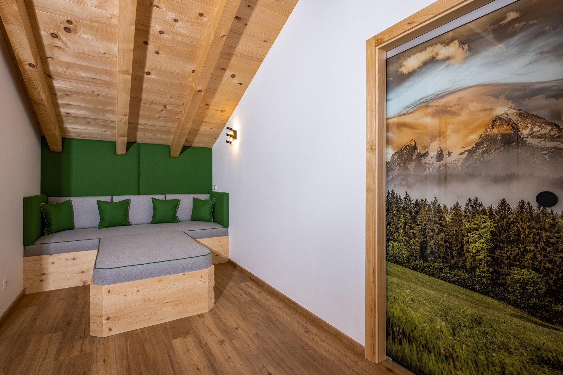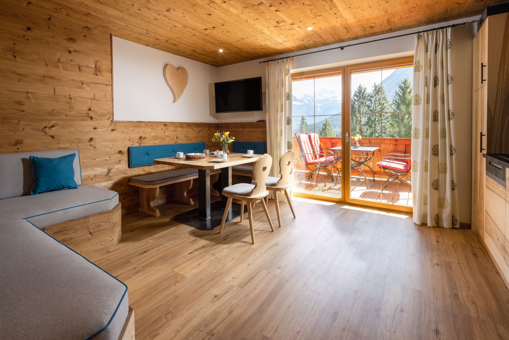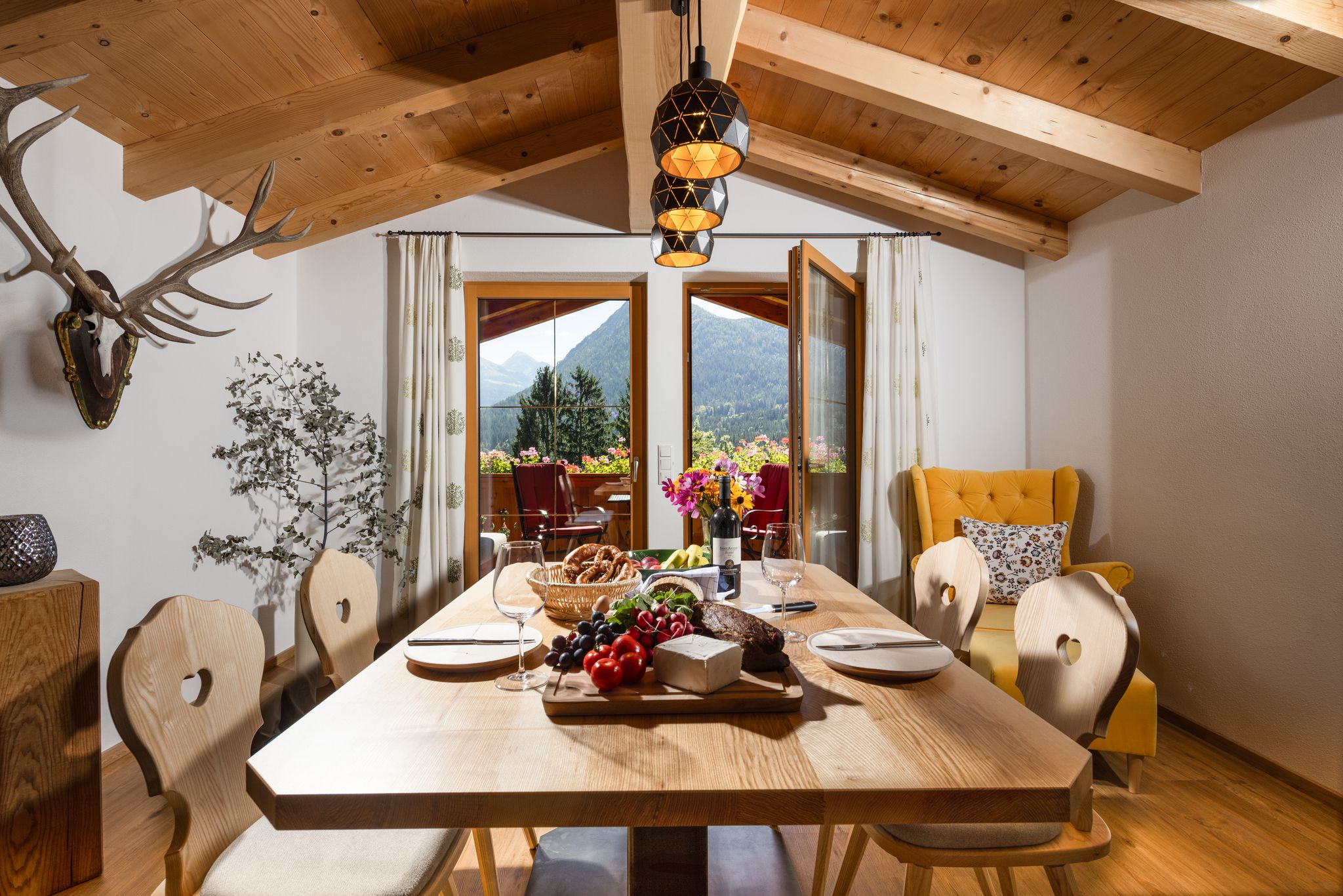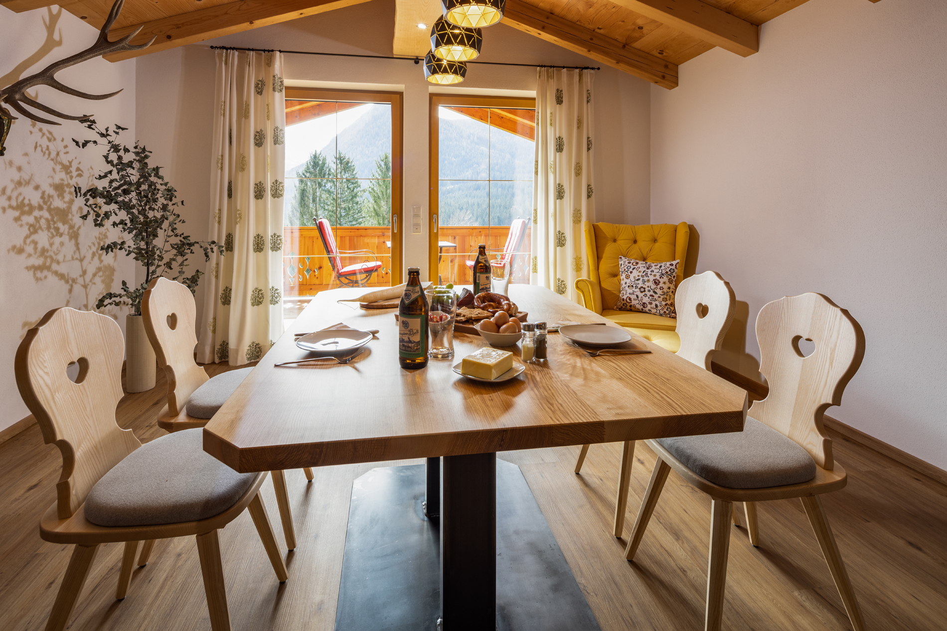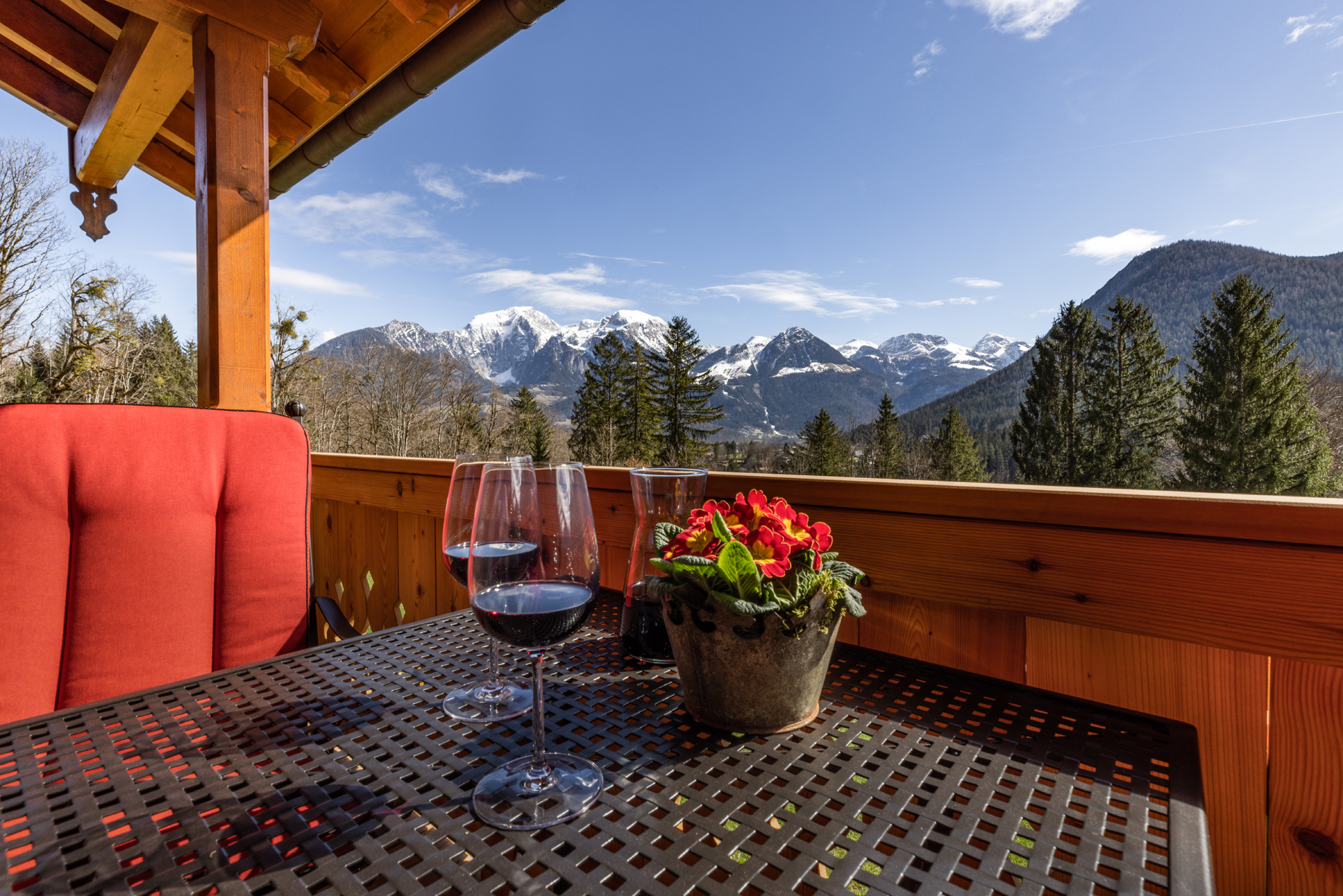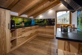 Das luxuriöse Chalet Apartment Himmelszelt bietet auf 80qm einen Hauch von Luxus für 2 Personen.Dieses mit viel Liebe eingerichtete Apartment befindet sich im 2. Obergeschoß mit Sichtdachstuhl, großem Balkon mit Sitzlounge und Essbereich im Freien nach Süden ausgerichtet.Das Schlafzimmer ist gen Osten ausgerichtet – hier können Sie die frische Morgenluft und den Sonnenaufgang vom Balkon aus genießen – mit Blick auf den Kehlstein und die angrenzende r geräumige Wohnbereich mit offener Küche und gemütlicher Kuschelecke lädt zum Verweilen und Entspannen ein. Wir haben natürlich hochwertige Materialien wie Steinerloden und Schreinermöbel verwendet und mit viel Herzblut Farben und Stoffe ausgesucht.Das Badezimmer ist nach Westen gelegt und hat ebenfalls einen direkten Balkonzugang mit Sitzgelegenheit.80 qm Wohnfläche, exklusiv für 2 PersonenSchlafzimmer: großes Doppelbett , Balkonzugang, Sat TV, Safe, zertifizierte Feder und Daunenkissen, Matratzen aus Österreichgroßzügiger offener Wohn-/ Essbereich mit Panoramaverglasung , 55″ Sat-TV, gemütliches Sofakomplett ausgestattete Schreinerküche mit E-Herd und Backofen von Miele, Kühlschrank mit Gefrierfach von Liebherr , Geschirrspüler, Jura-Kaffeevollautomat, Wasserkocher, Eierkocher, MilchaufschäumerGeschirr und Gläser, Salz, PfefferHand-, Bade- und Geschirrtücher und Bettwäsche vorhandenBademäntelkostenloses WLANGroßer Süd-Balkon mit Loungesessel, Essbereich mit herrlichem Blick auf Berge und die umliegende NaturBadezimmer mit edlem Duschbereich, Regendusche, Balkonzugang, Bademäntel, Föhn, Schminkspiegel, Radio und Handtuchwärmerhochwertige Naturkosmetik von Chiemsee LiebeBalkon nach Osten mit Sitzmöglichkeit für den MorgenkaffeeGemütlicher Relaxsessel im Wohnbereich sorgt für einen zusätzlichen Hauch von Luxus.