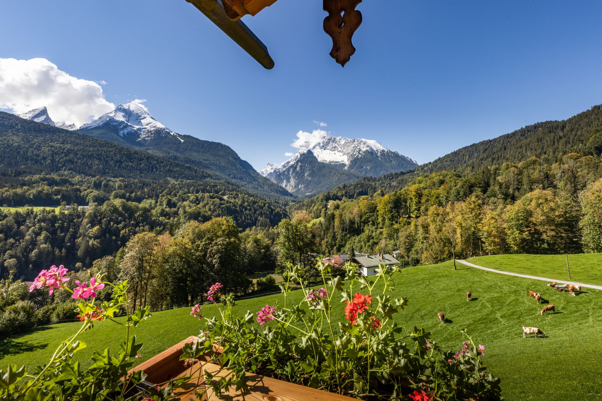 Unser Hof liegt malerisch auf einer Anhöhe von 680 Metern mit Blick auf die wunderbare Bergwelt des Berchtesgadener Landes in bester Alleinlage. Der Panoramablick schwenkt vom Kehlstein über den Watzmann zum Hochkalter - eine Aussicht, die auch uns täglich dankbar sein lässt. Ramsau und Berchtesgaden liegen fünf km entfernt, den Königssee erreichen Sie in etwa 15 Minuten, nach Salzburg brauchen Sie ungefähr 40 Minuten und auch die Grenze nach Österreich ist ganz nah.