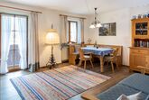 Wohnzimmer mit Südbalkon, SAT-TV, Couch und Essecke.