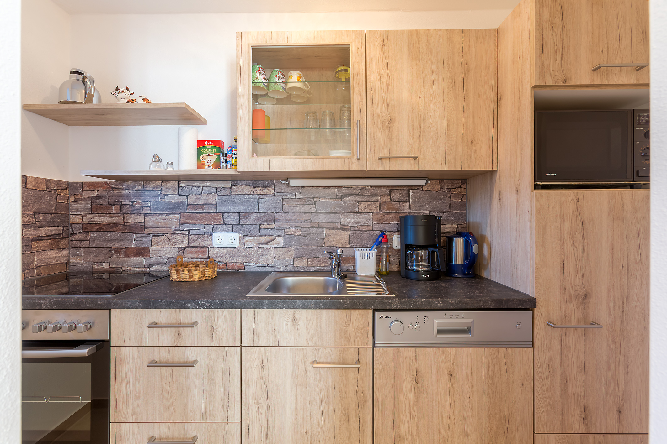 Unsere moderne kleine Küche ist mit div. Geräten ausgestattet (Herd mit Ceranfeld, Mikrowelle, Spülmaschine, Kaffeemaschine, Toaster, Eierkocher, Kühlschrank mit Gefrierfach etc.)